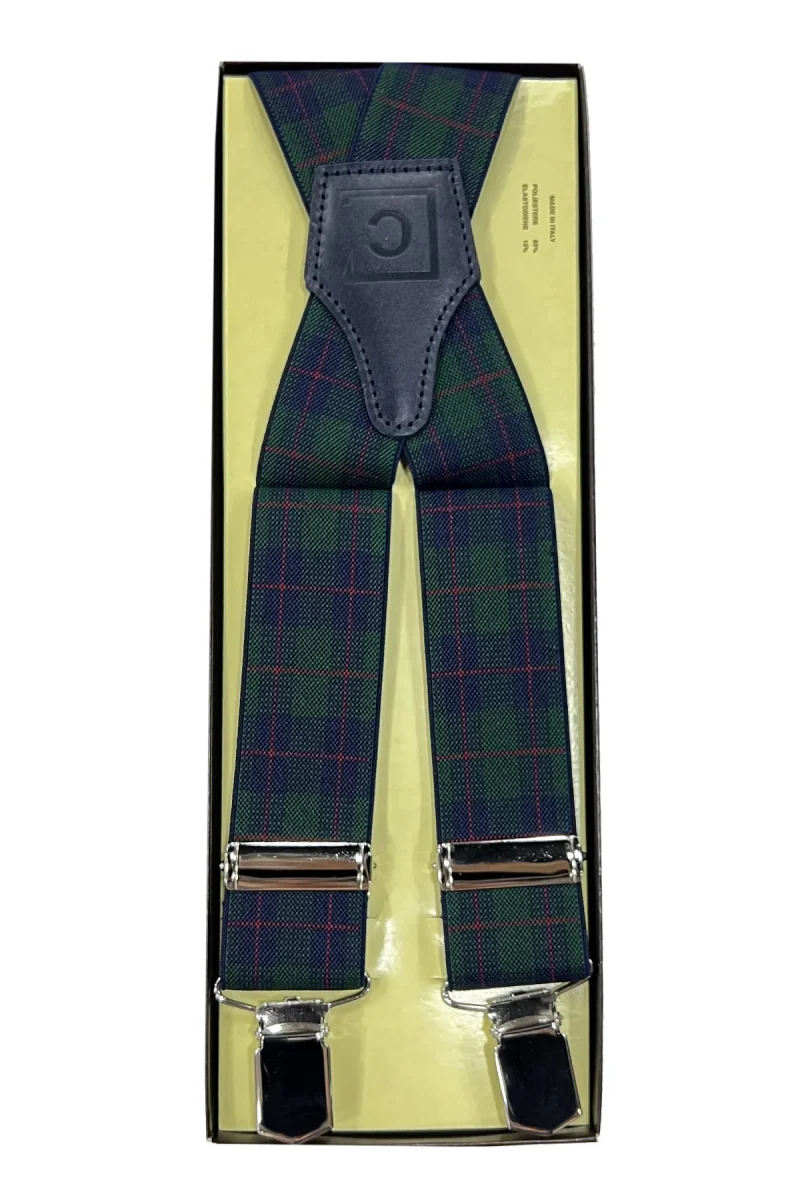 BRETELLE DA UOMO VERDE TARTAN TINTA UNITA ELASTICIZZATE 3,5 CM REGOLABILI CON CHIUSURA PINZE ARGENTO