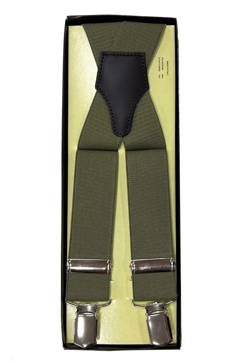 BRETELLE DA UOMO VERDE MILITARE TINTA UNITA ELASTICIZZATE 3,5 CM REGOLABILI CON CHIUSURA PINZE ARGENTO