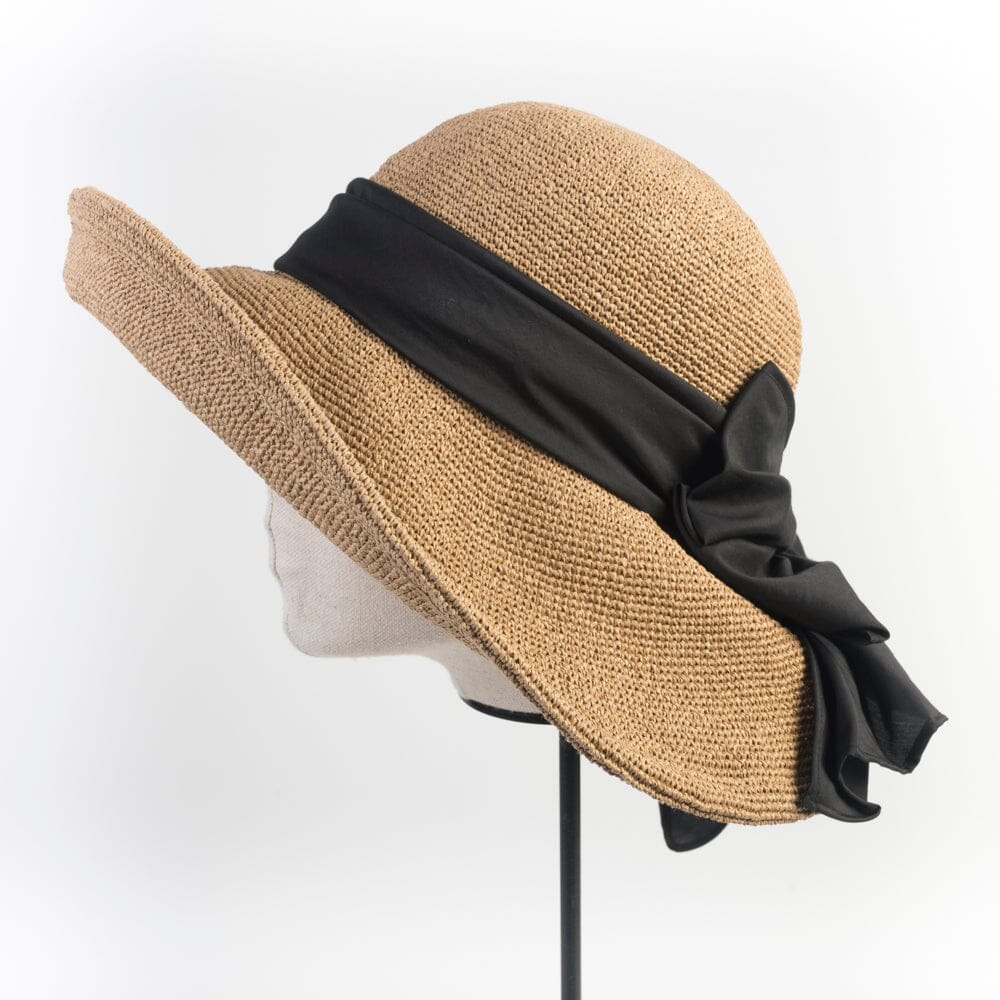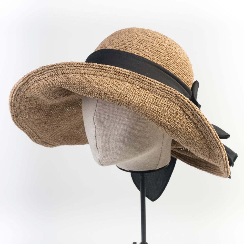 Originale Copricapo di design a tesa larga morbida realizzato da CA4LA in paglia di colore beige con grande fiocco spesso in garza di cotone sul retro di colore nero. Profilo sul davanti in tessuto di colore nero. Regolazione grazie al nastrino con velcro interno.