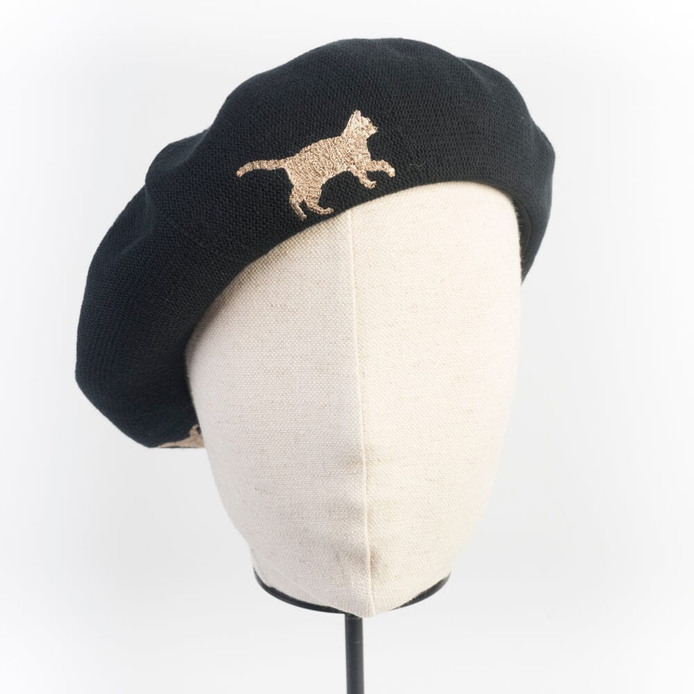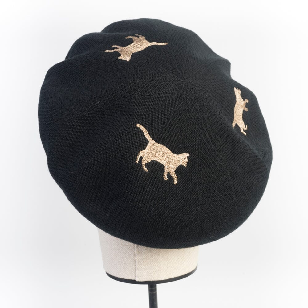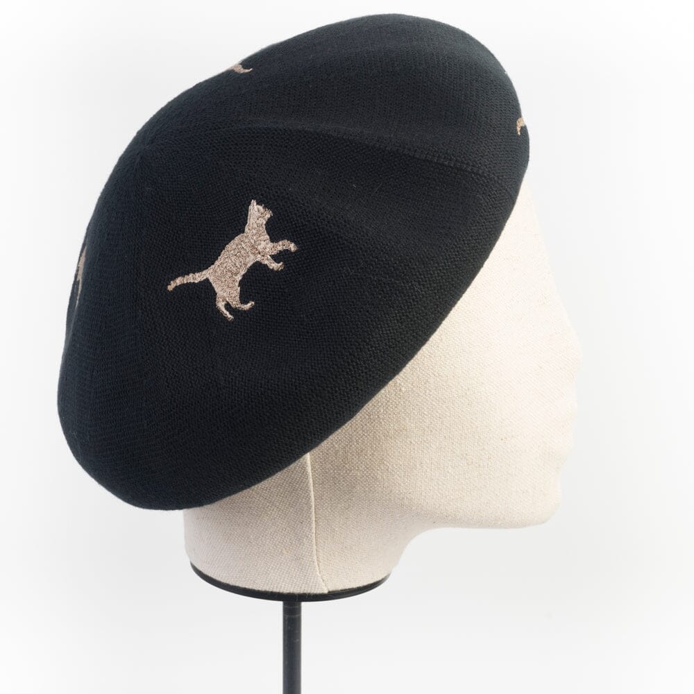 Originale basco di CA4LA realizzato in cotone di colore nero con fantasia gatti ricamati di colore avorio. Fettuccia interna regolabile per la misura della circonferenza.