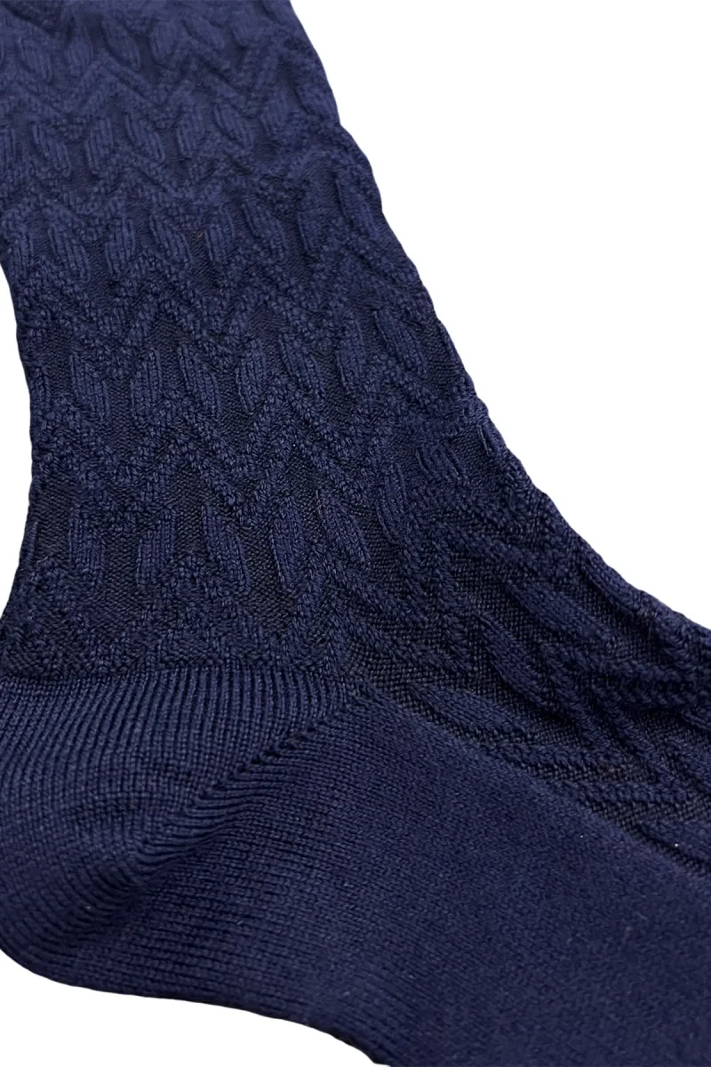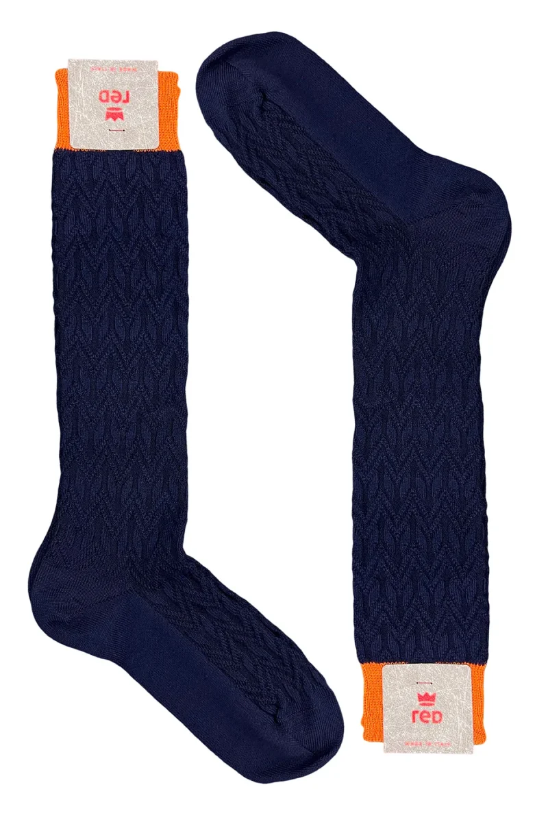 CALZINI UOMO LUNGHI NAVY BLU in lana FANTASIA GEOMETRICA A RILIEVO CON ELASTICO ARANCIO MADE IN ITALY