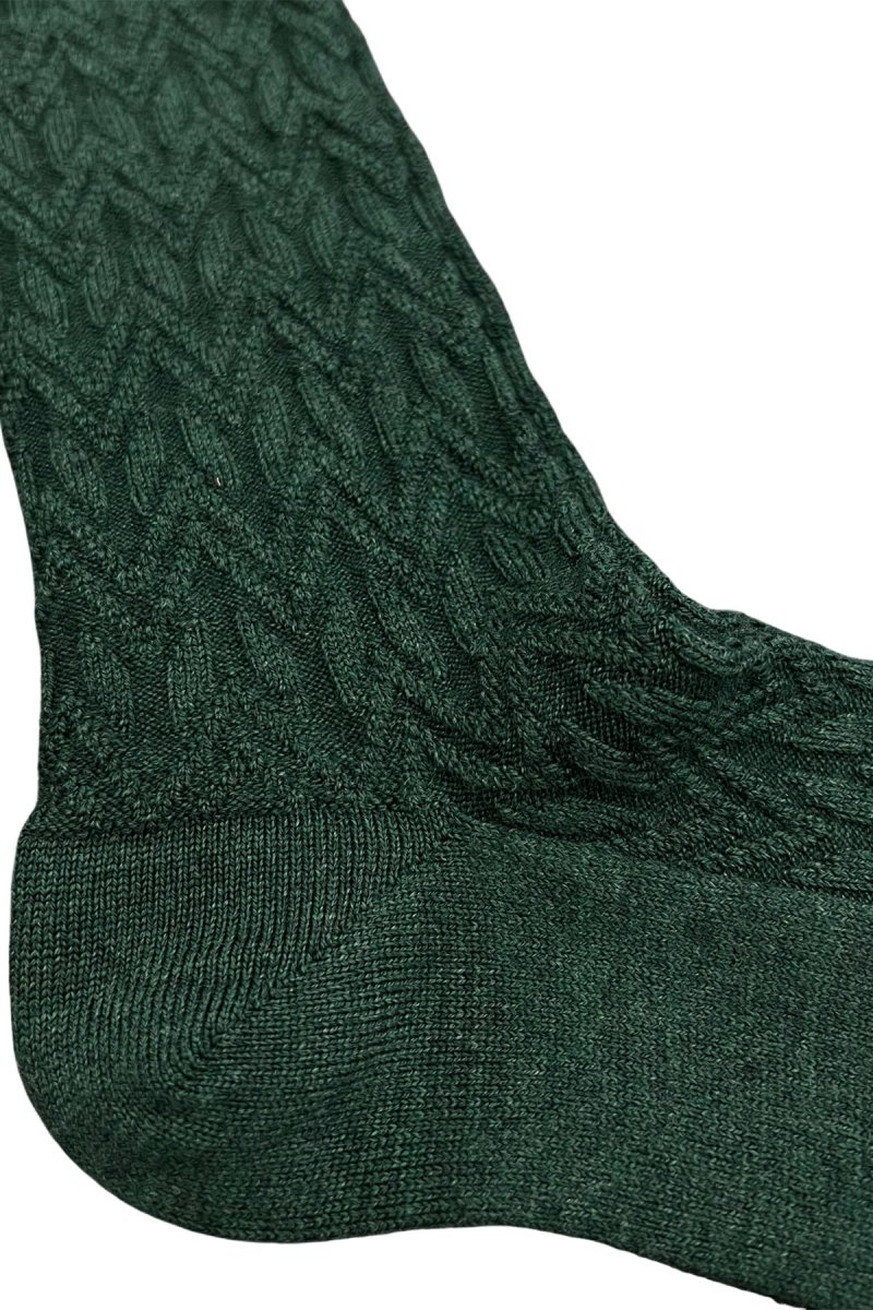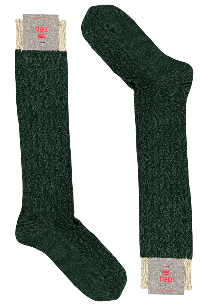 Calzini uomo lunghi verde in lana fantasia geometrica a rilievo con elastico beige made in italy