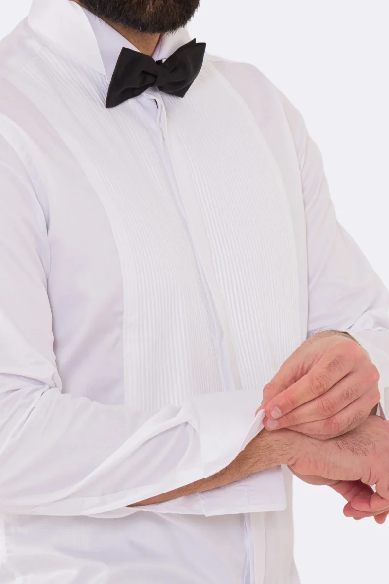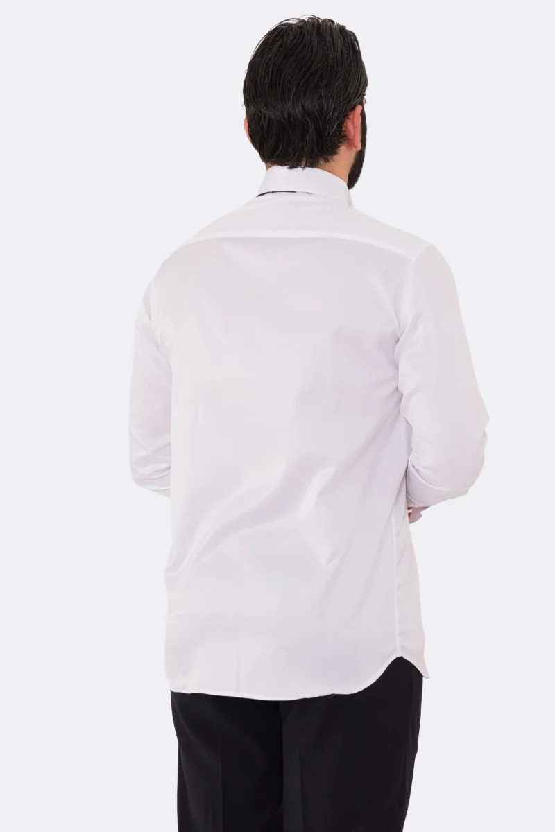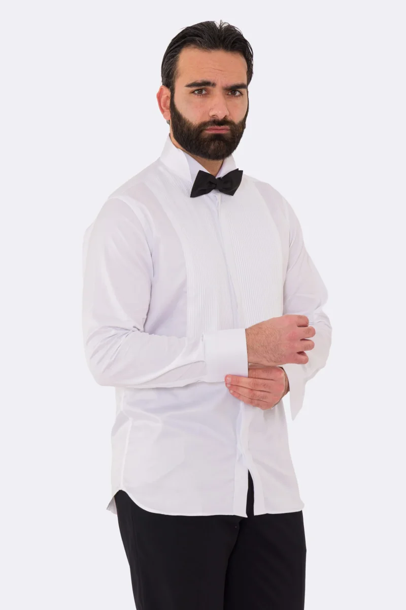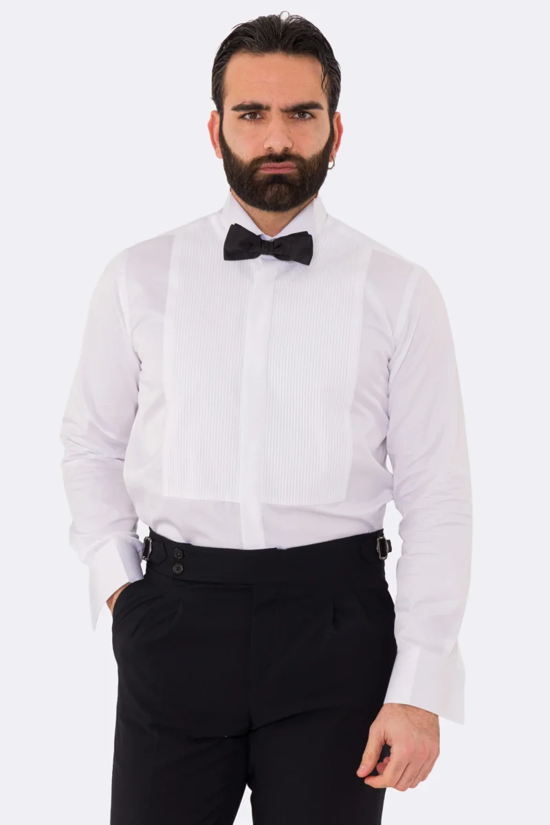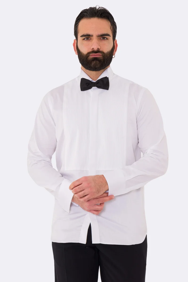 Camicia Bianca collo diplomatico con plissè bottoni a scomparsa 100% Cotone Da uomo polso gemelli fintone a scomparsa dietro al collo per papillon slim fit 4 passaggi a mano