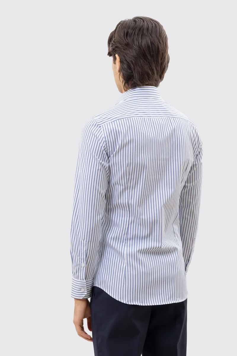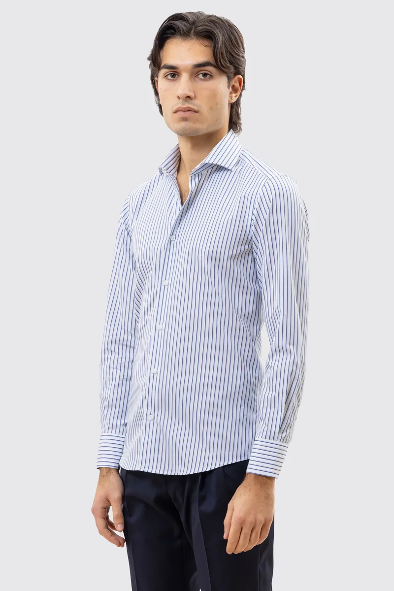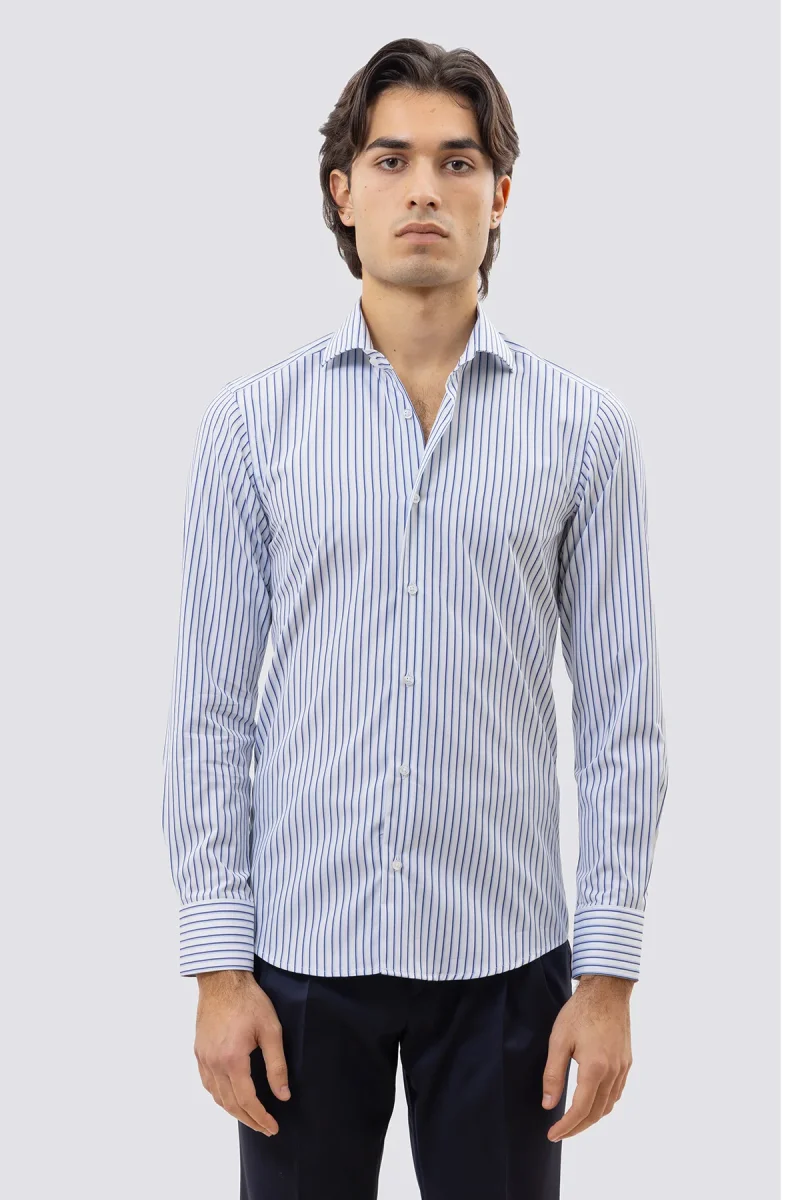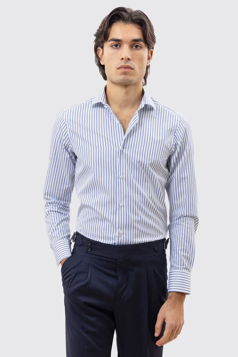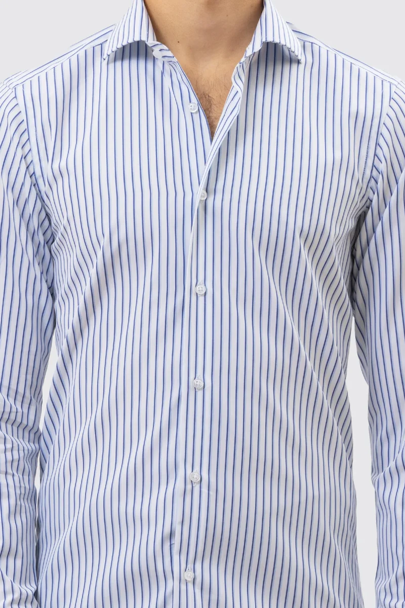 CAMICIA BIANCA RIGA BLU E CELESTE SLIM FIT 100% COTONE COLLO SEMI FRANCESE POLSO SMUSSATO MILETA TESSUTI