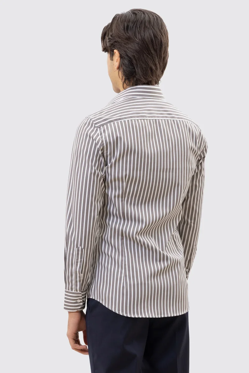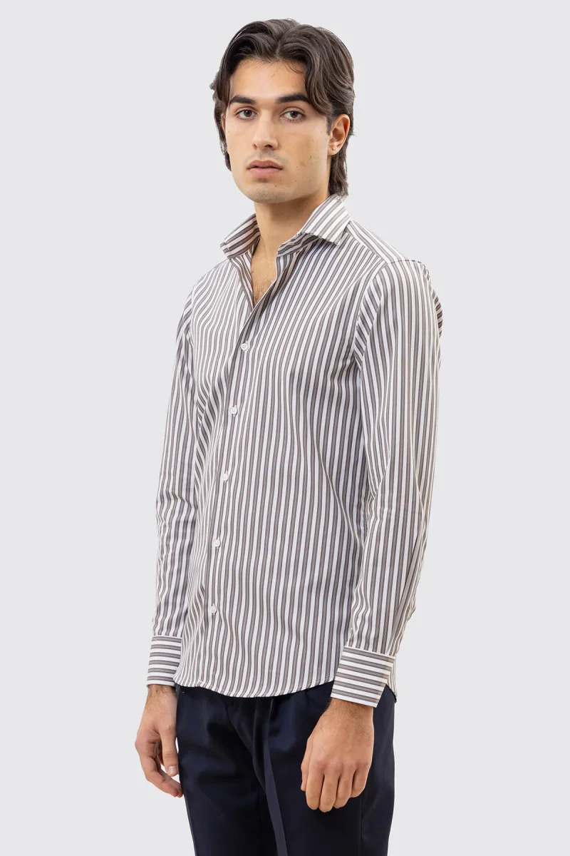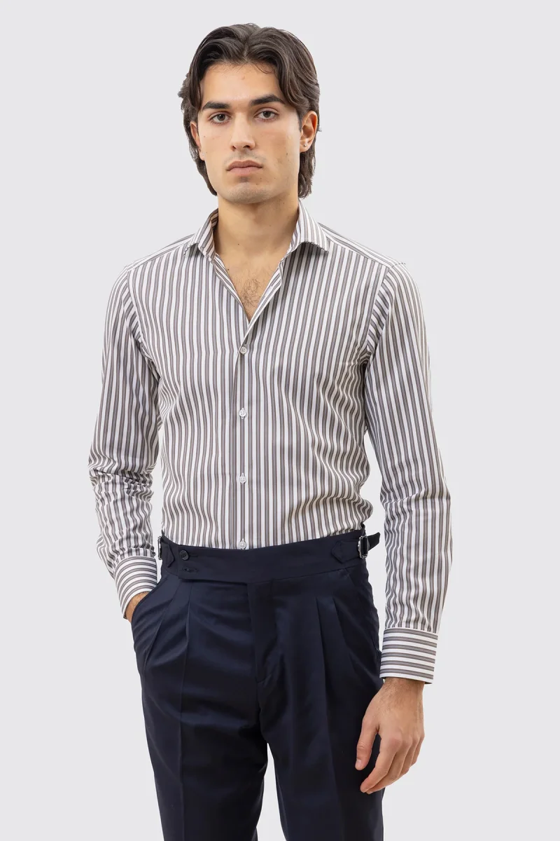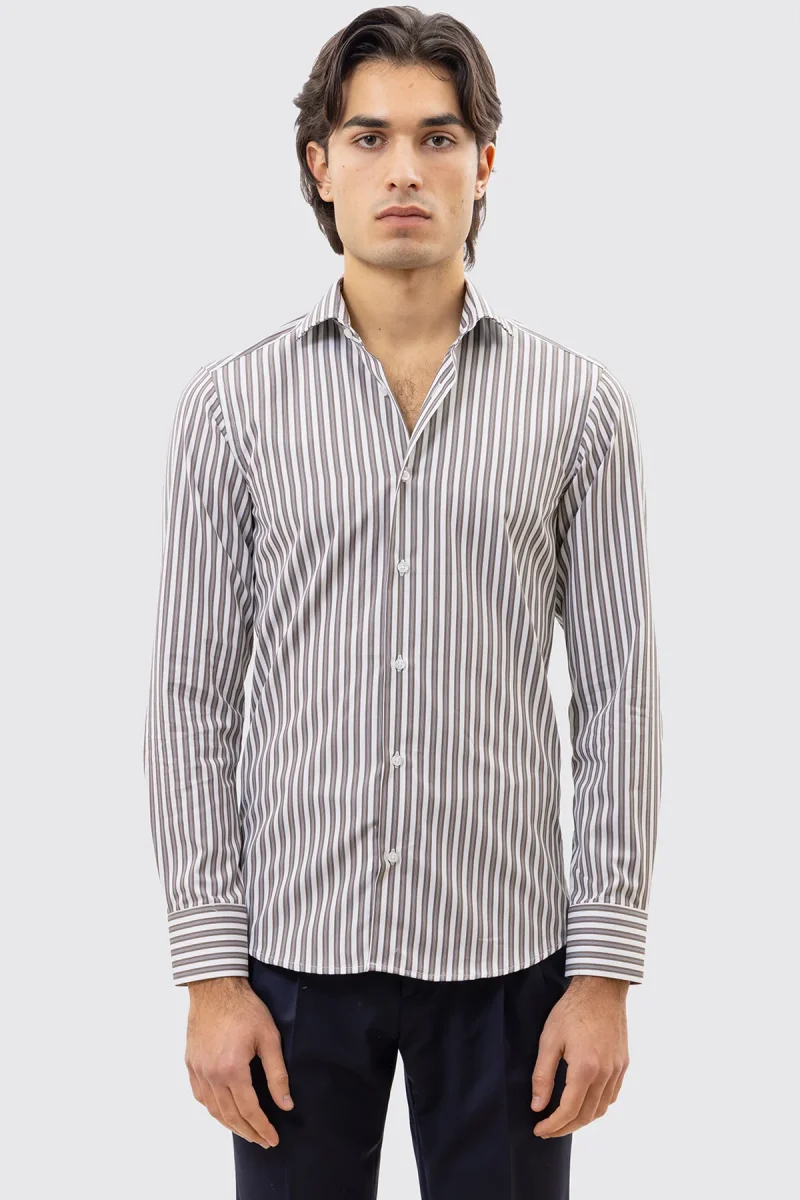 CAMICIA BIANCA RIGA MARRONE E CELESTE SLIM FIT 100% COTONE COLLO SEMI FRANCESE POLSO SMUSSATO MILETA TESSUTI