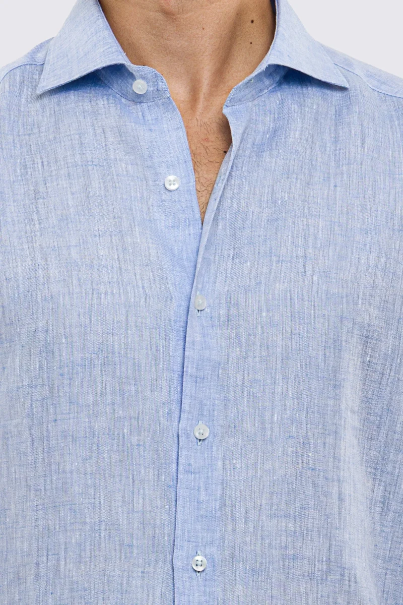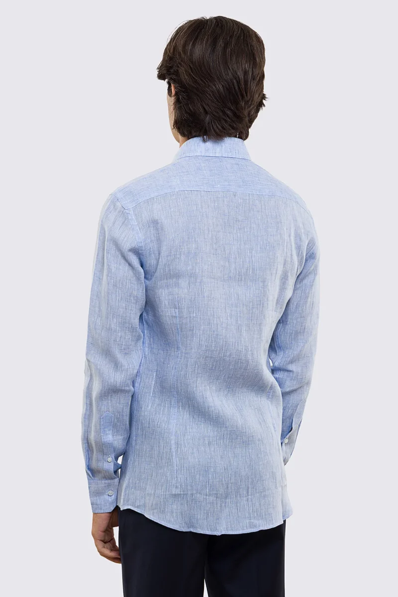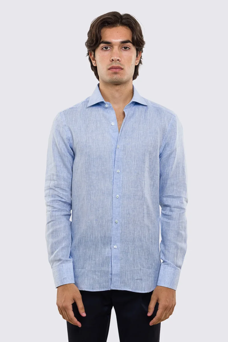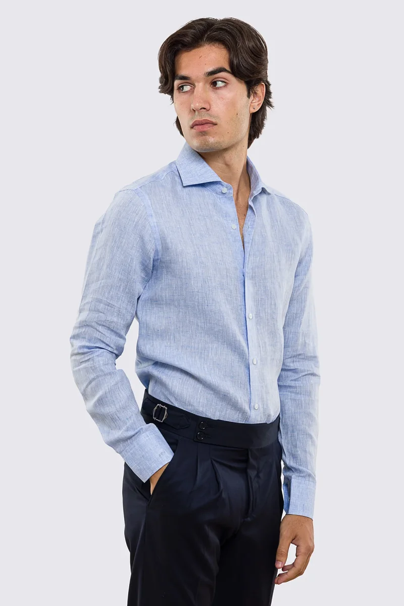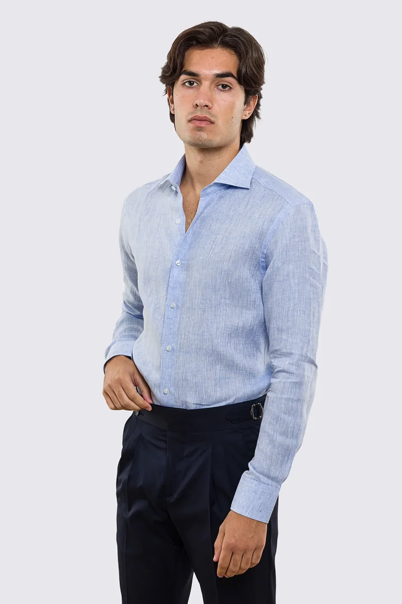 Camicia Celeste in Lino 100% made in italy da uomo collo semi francese morbido slim fit effetto melange mileta tessuti