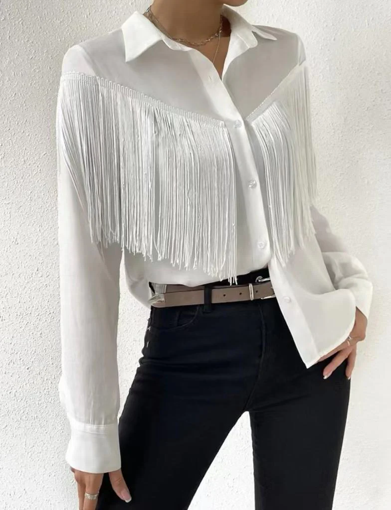 Camicia in chiffon a manica lunga, con frange sul davanti.