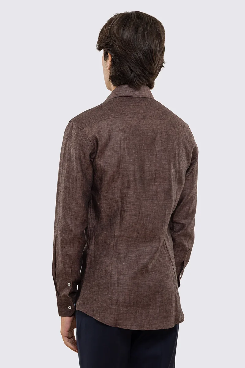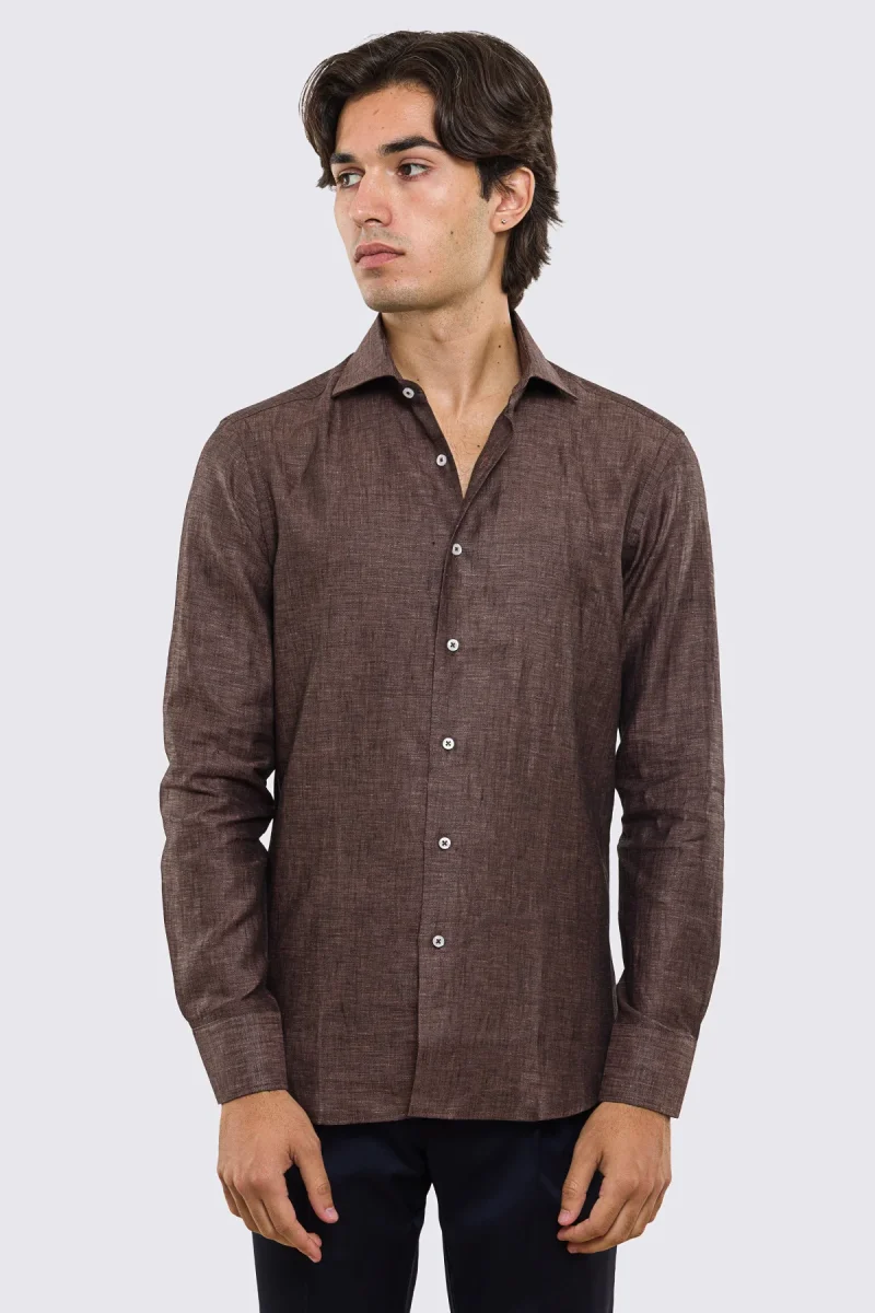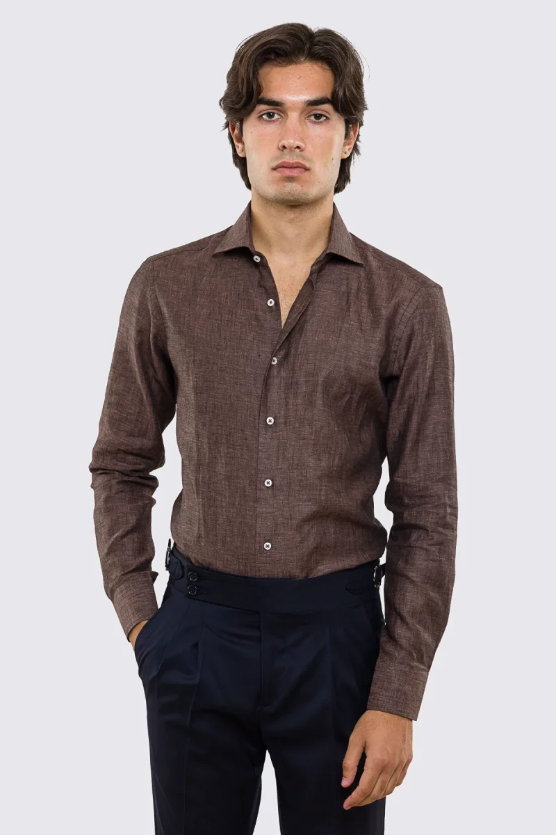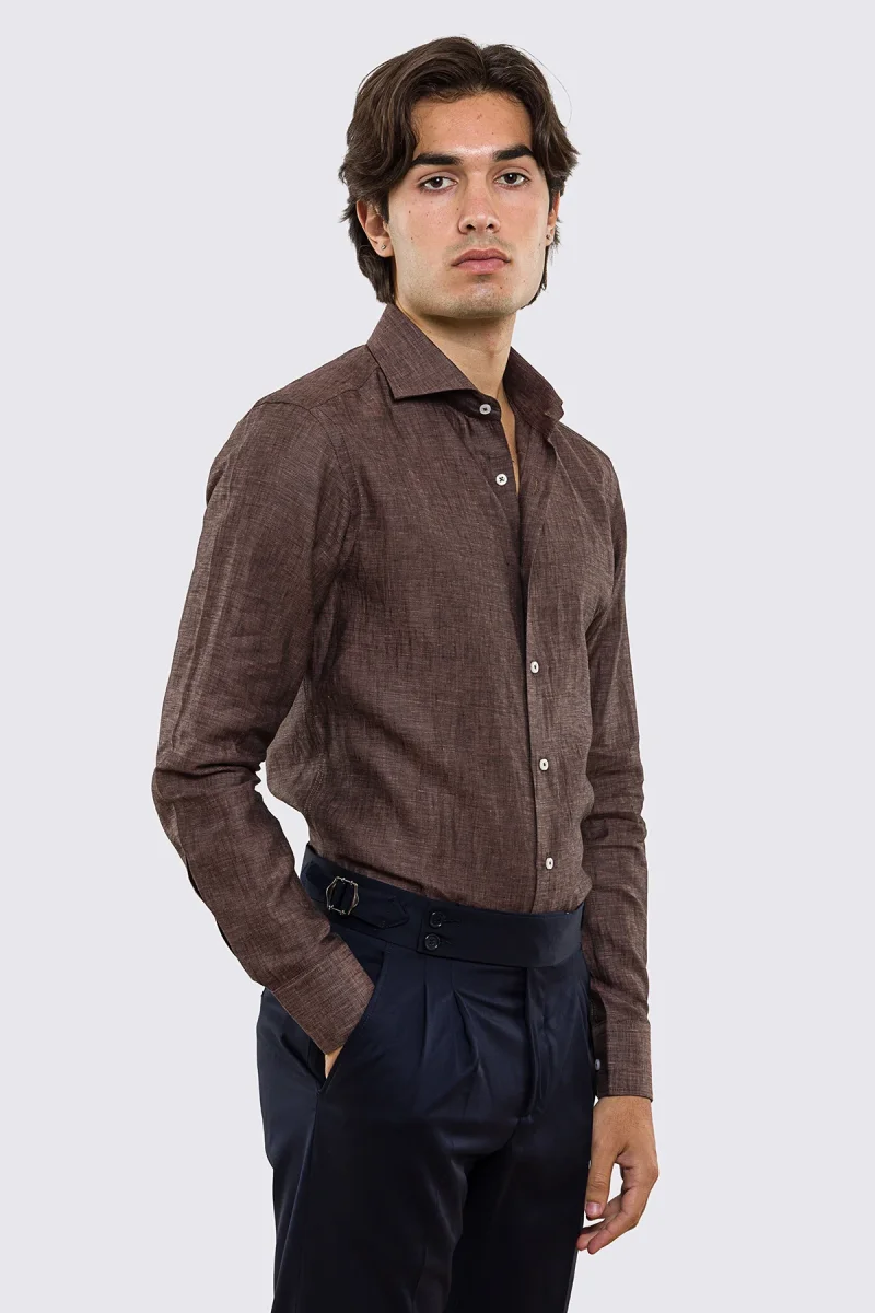 Camicia Marrone in Lino 100% made in italy da uomo collo semi francese morbido slim fit effetto melange mileta tessuti