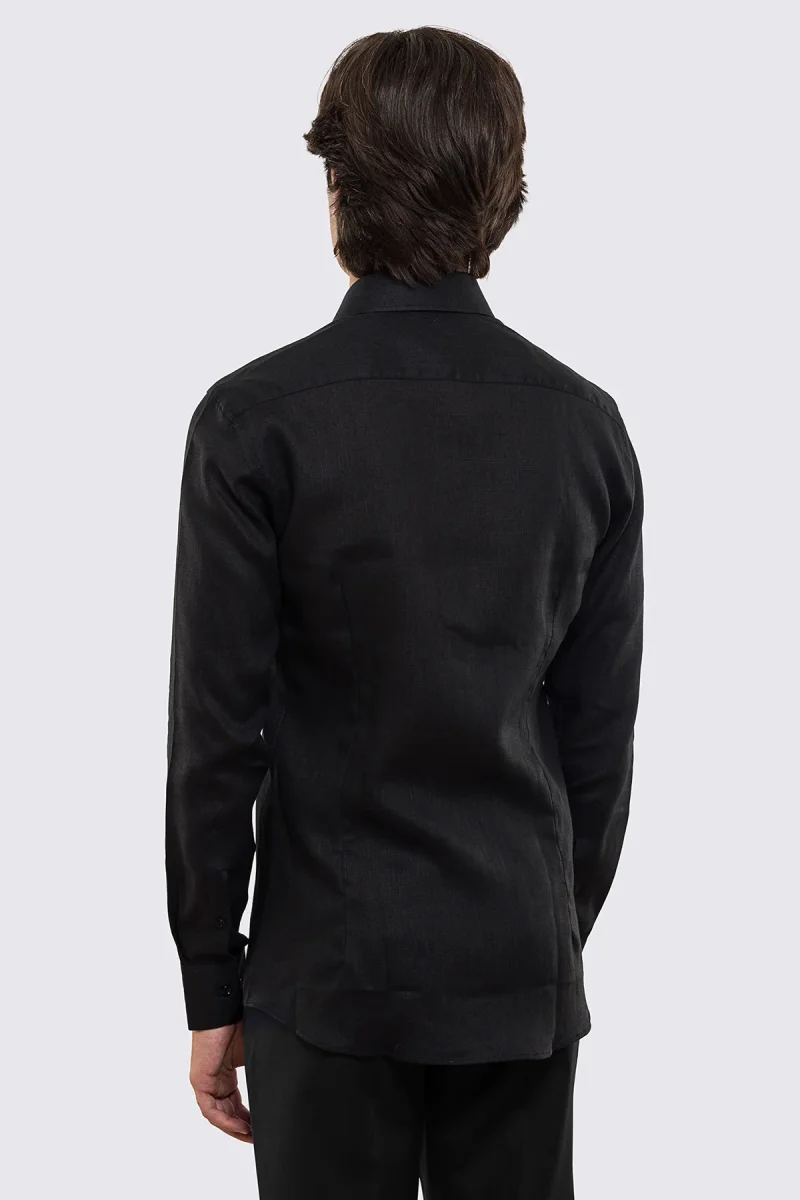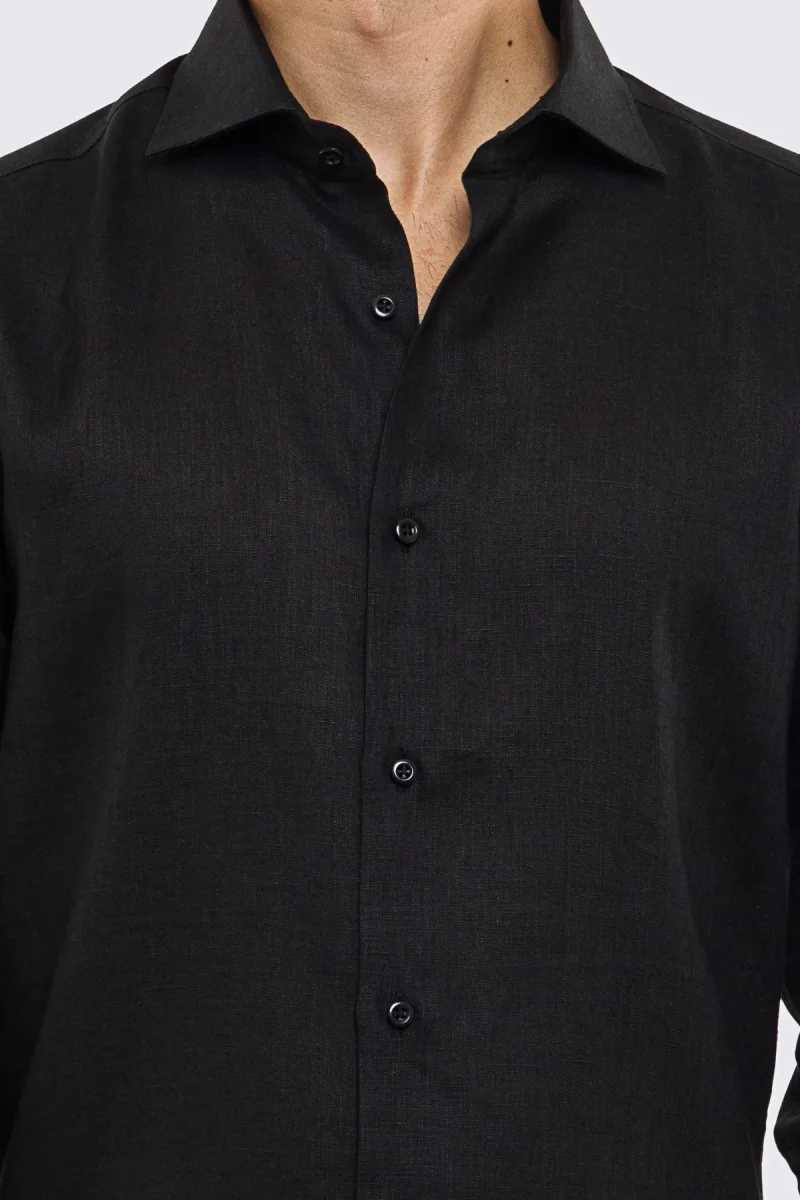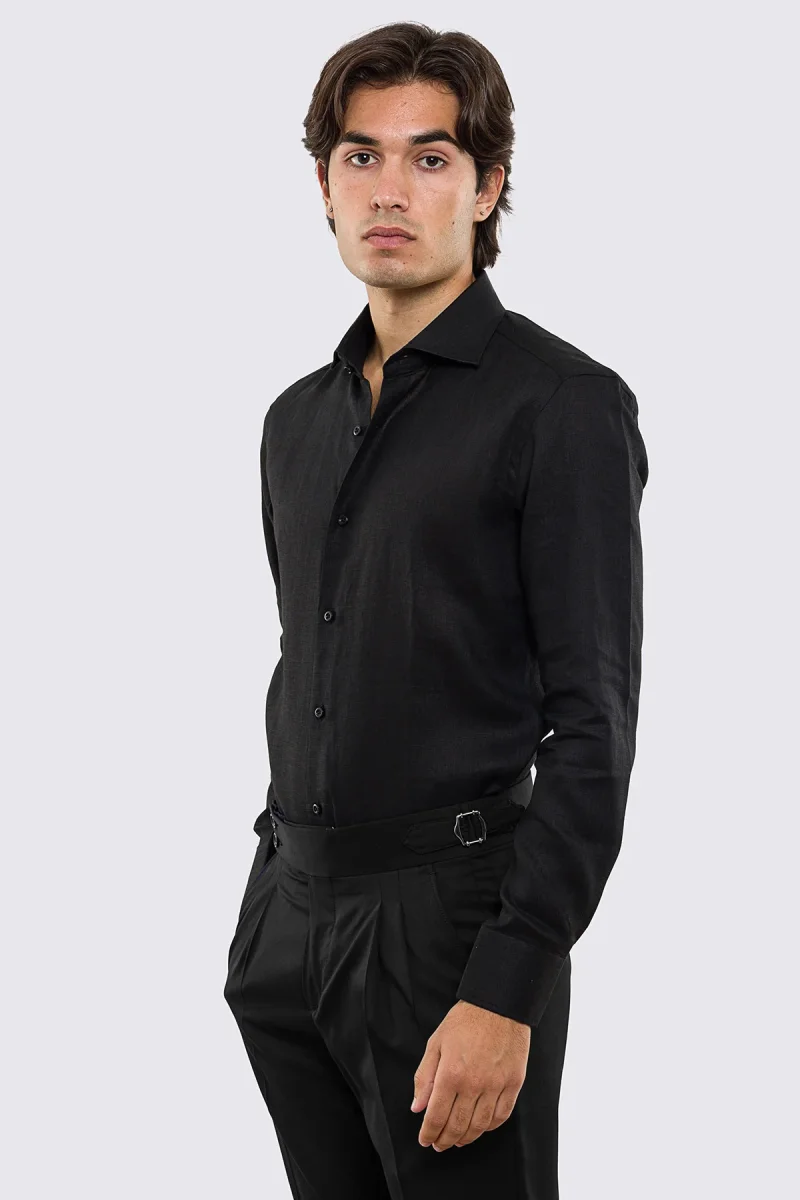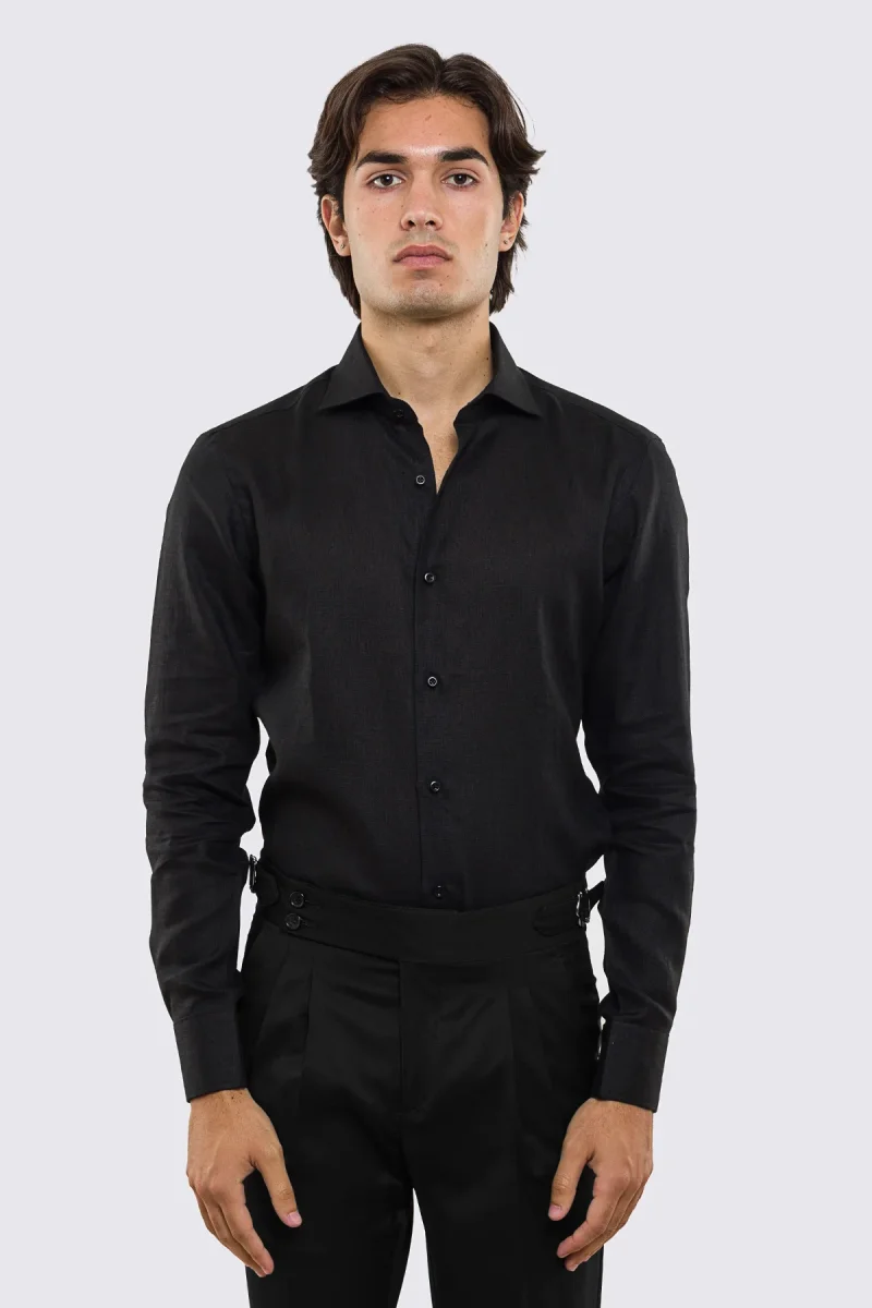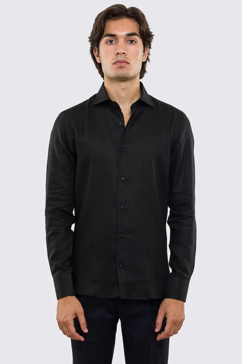 Camicia nera in Lino 100% made in italy da uomo collo semi francese morbido slim fit effetto melange mileta tessuti