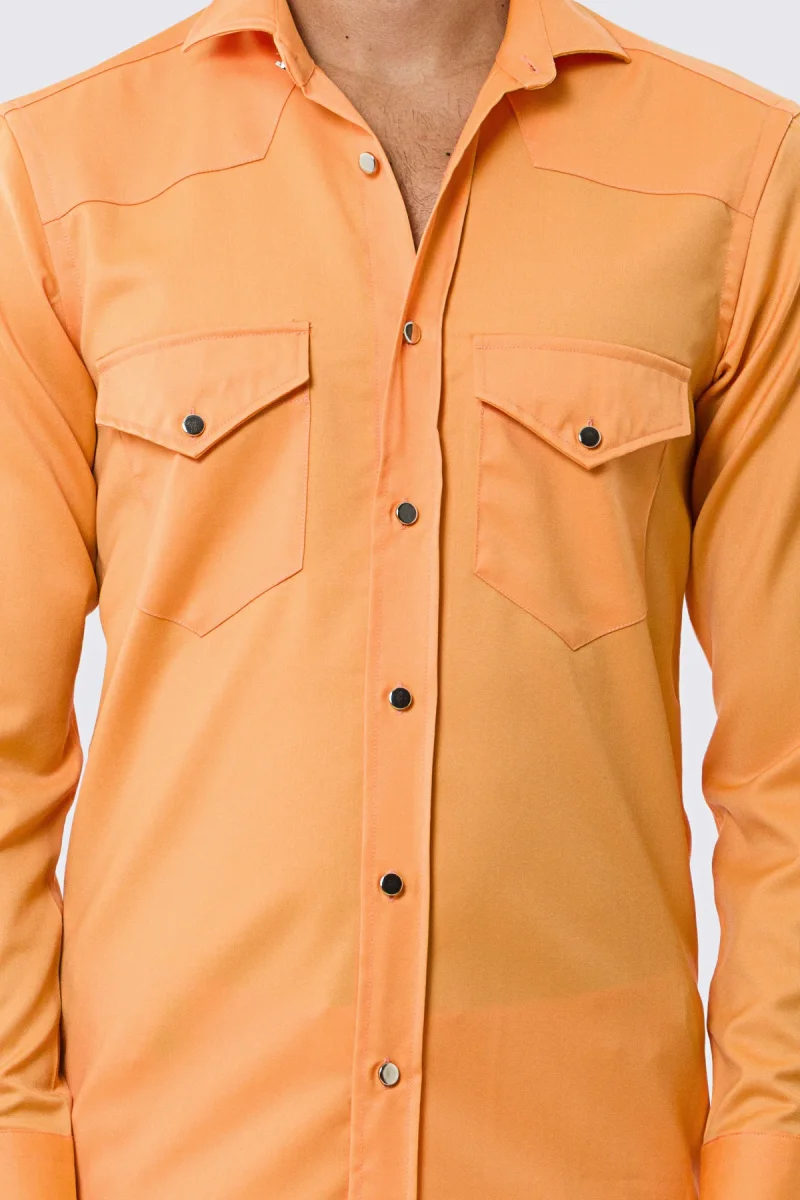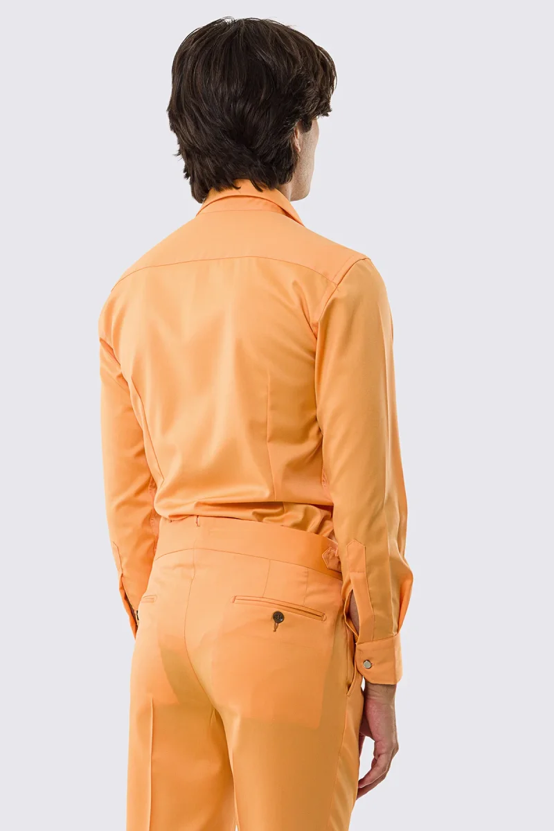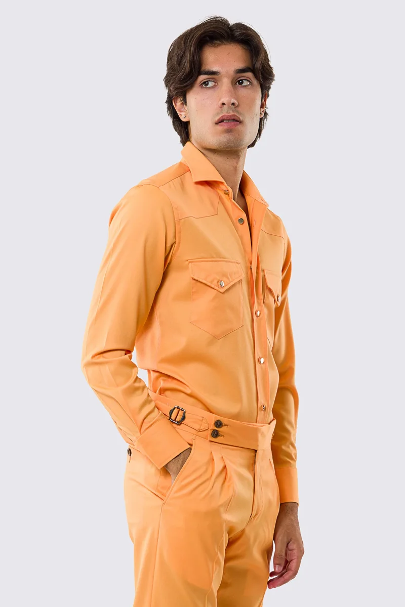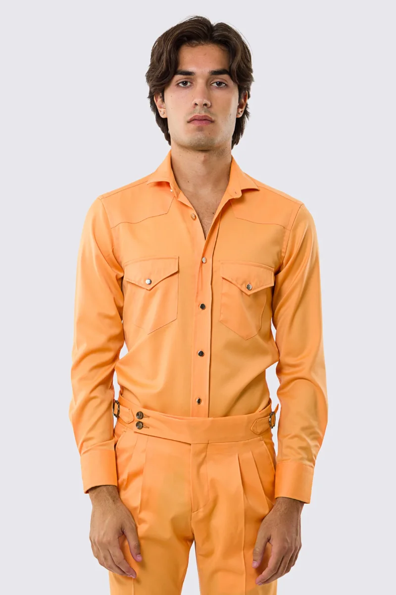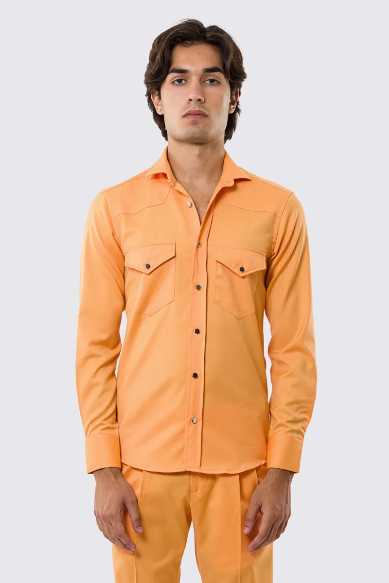 Camicia Uomo arancio modello texana vitale barberis canonico fresco lana super 130’s made in italy collo semi francese morbido slim fit bottoni argento