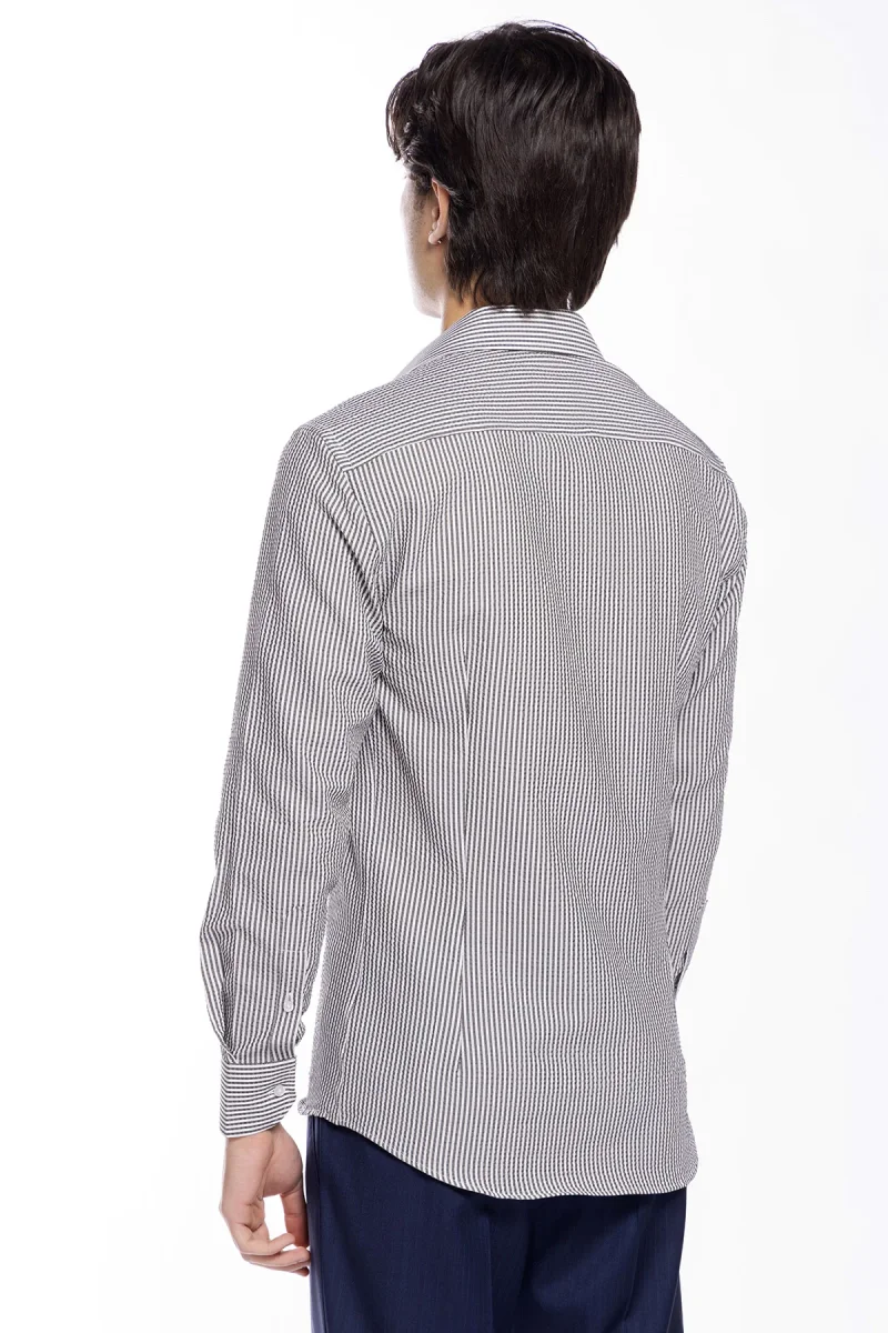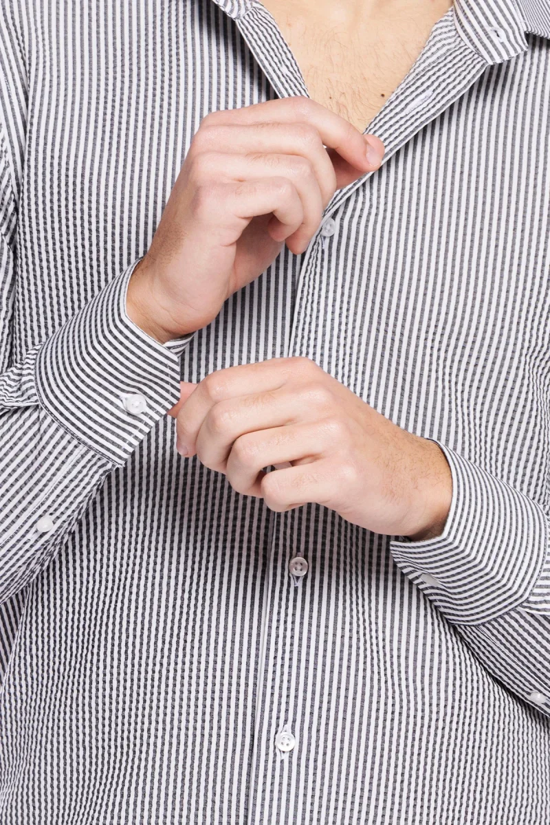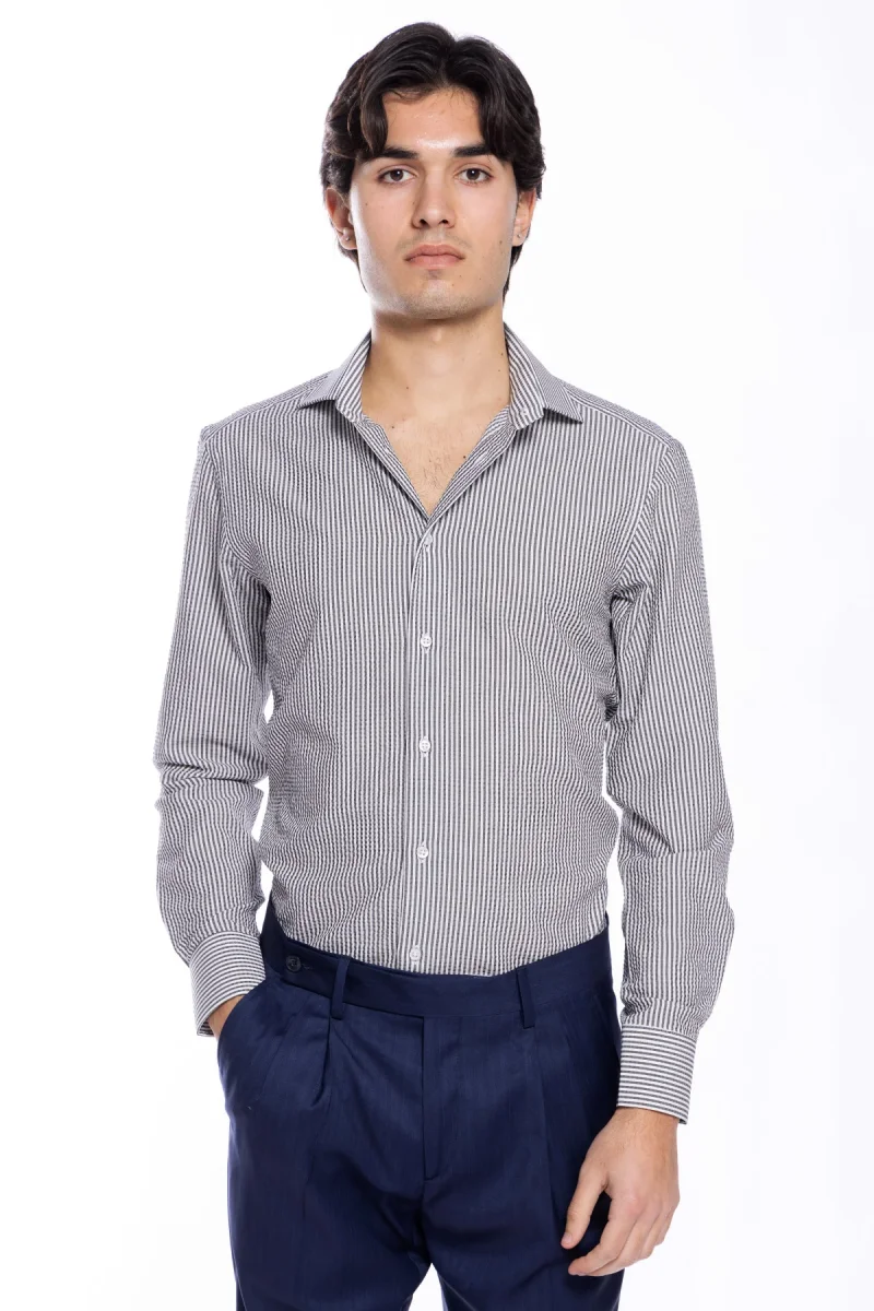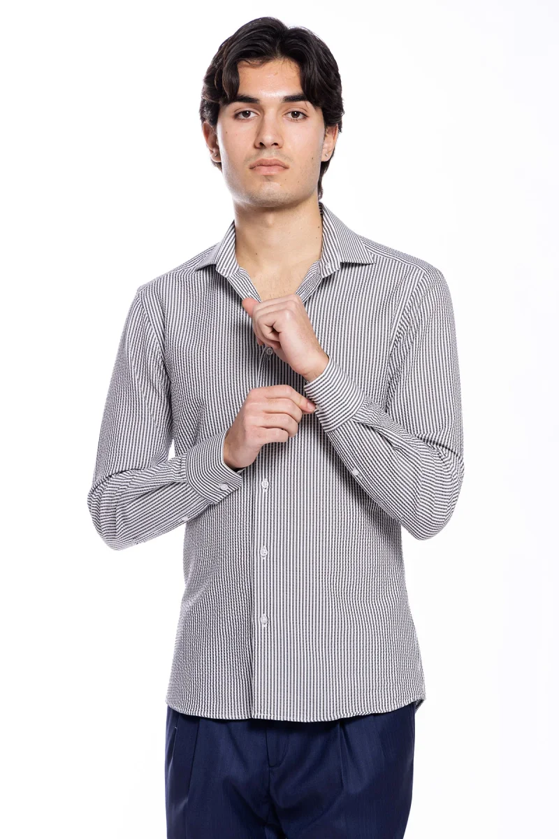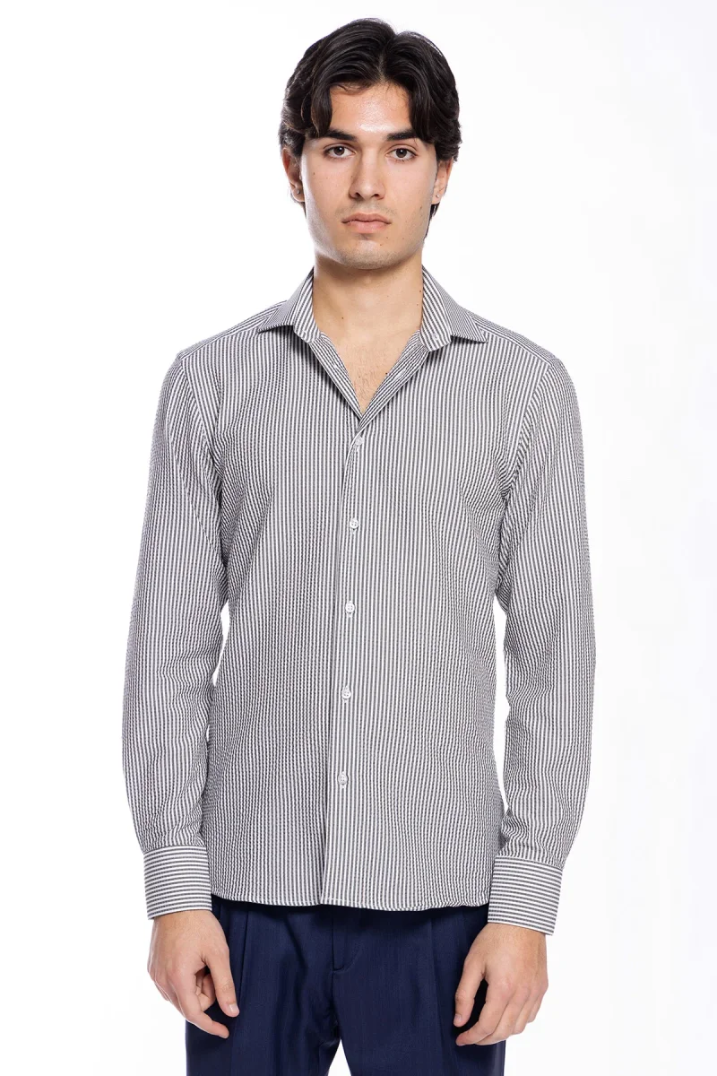 Camicia Uomo bianca riga nera tessuto seersacker slim Fit collo semi francese