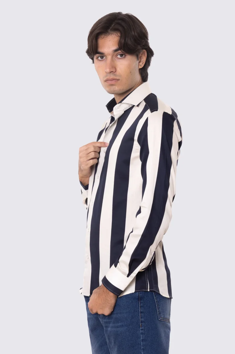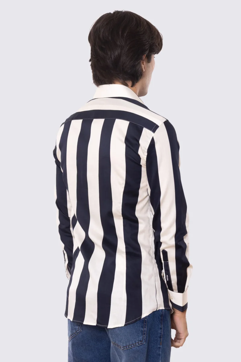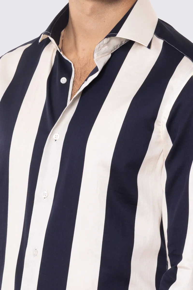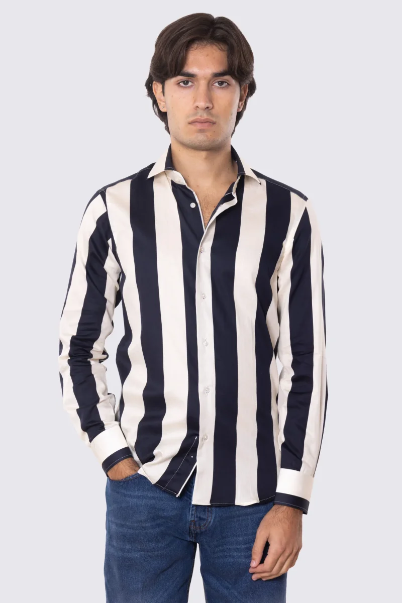 Camicia Uomo blu fantasia righe grandi blu e panna slim fit in cotone 100% Collo semi francese sartoriale
