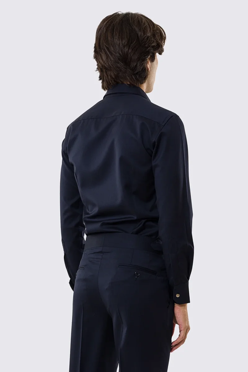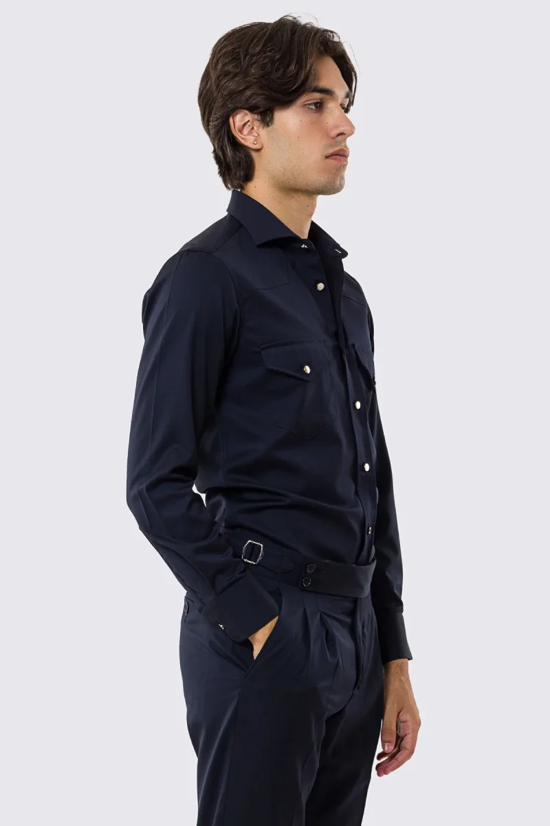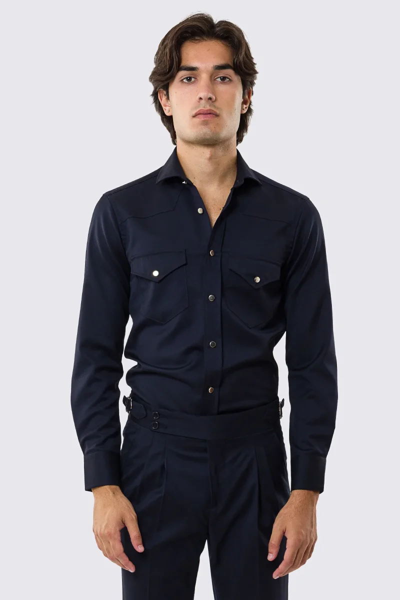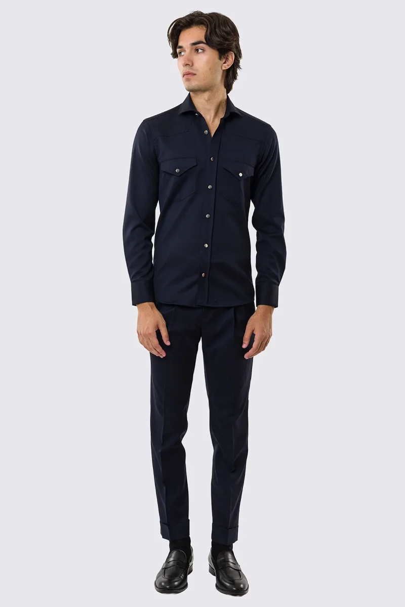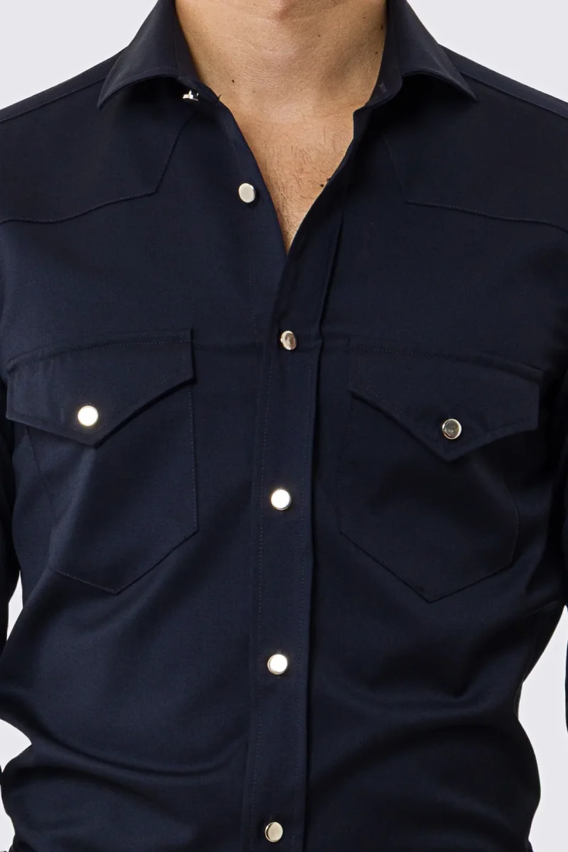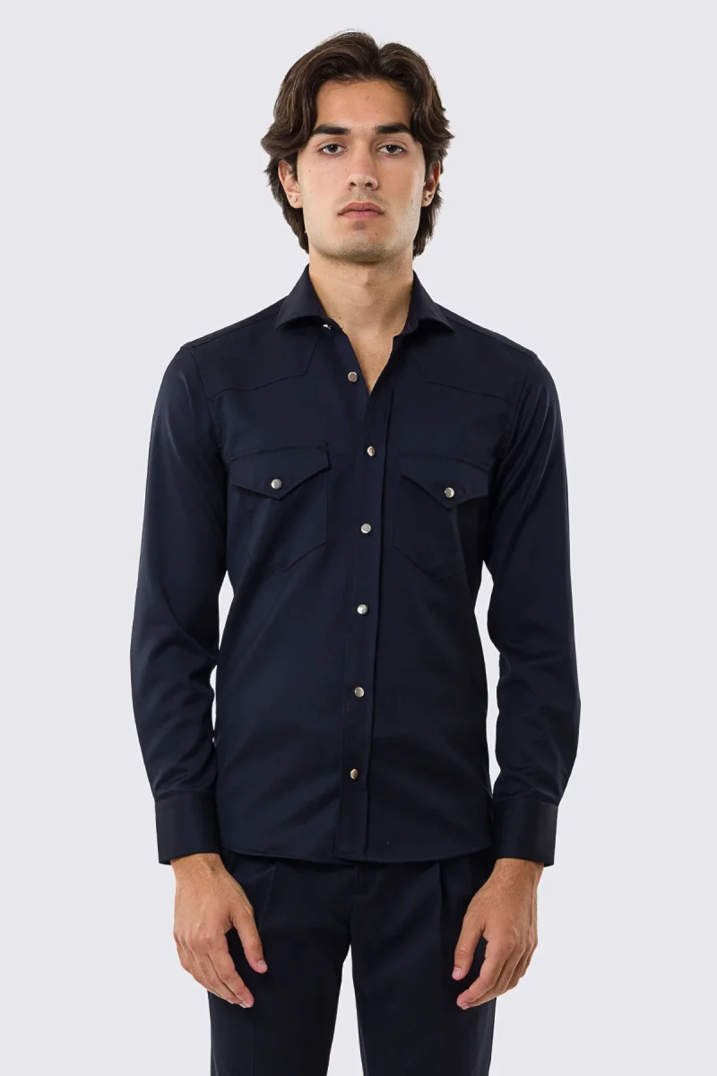 Camicia Uomo blu modello texana vitale barberis canonico fresco lana super 130’s made in italy collo semi francese morbido slim fit bottoni argento