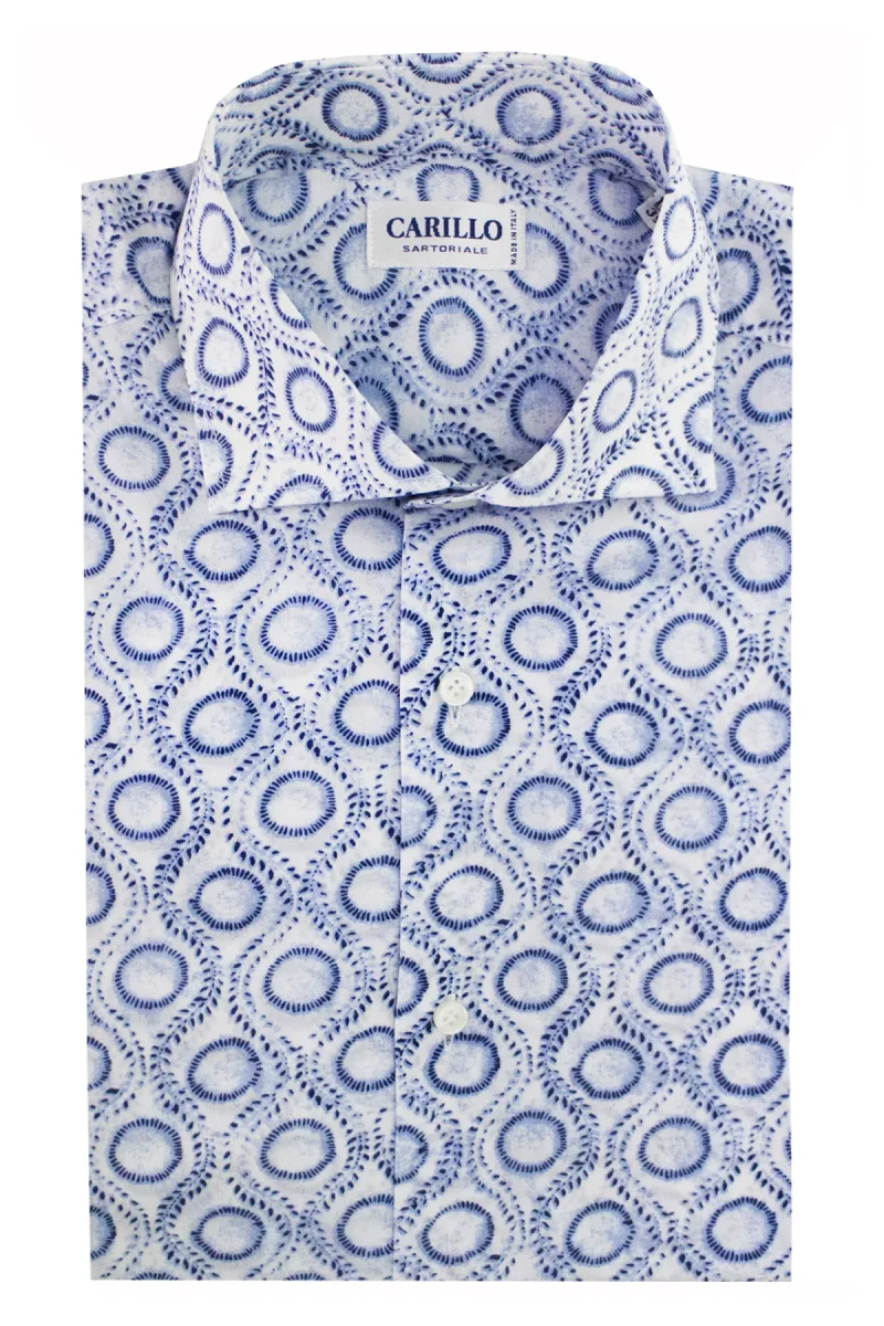 Camicia uomo cotone slim fit maniche lunghe collo francese fantasia cerchi e onde celeste blu made in italy