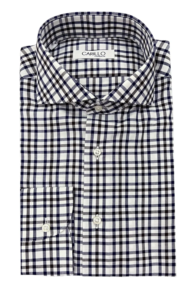 Camicia uomo slim 100% cotone collo francese fantasia quadri marroni e blu su fondo bianco e bottoni bianchi