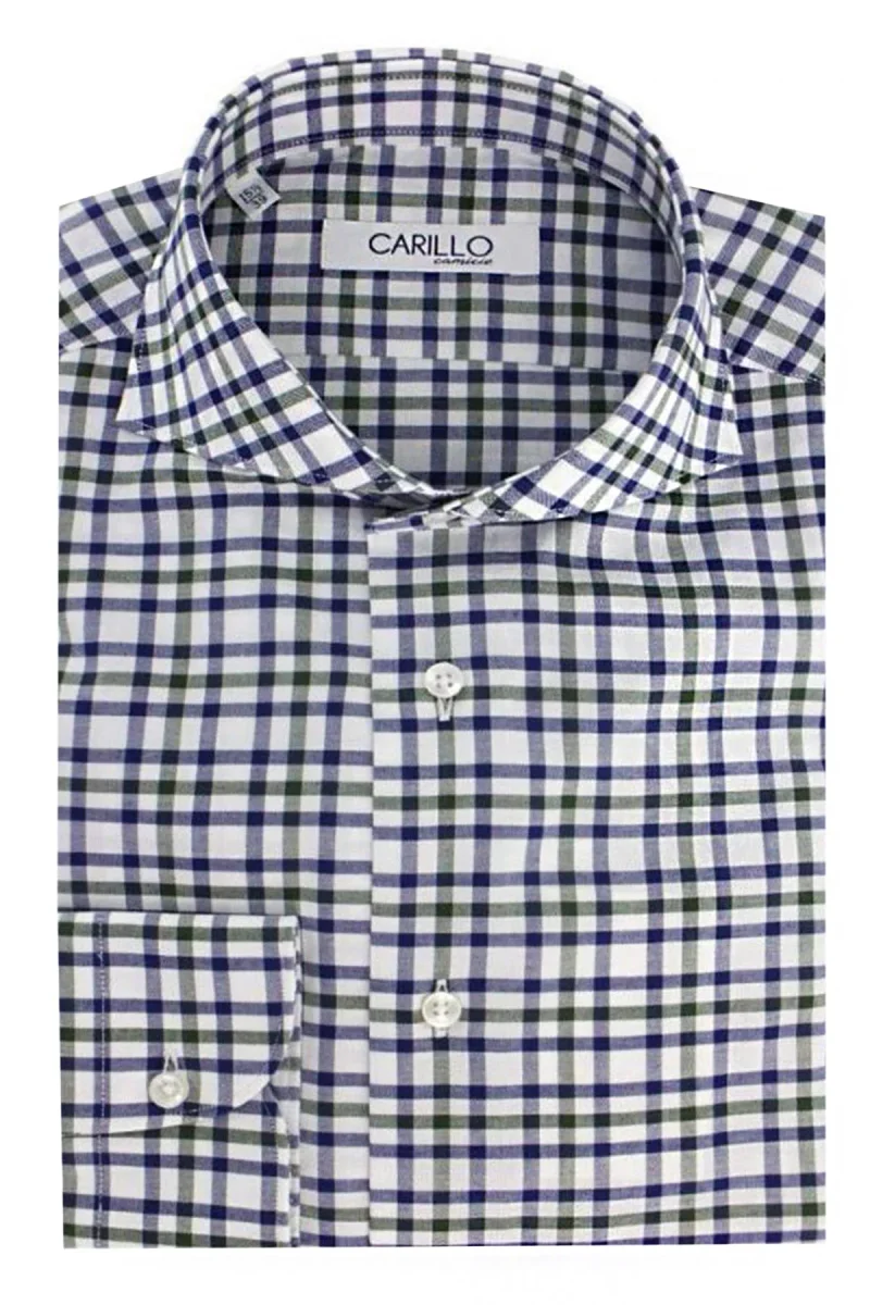 Camicia uomo slim 100% cotone collo francese fantasia quadri verdi e blu su fondo bianco e bottoni bianchi