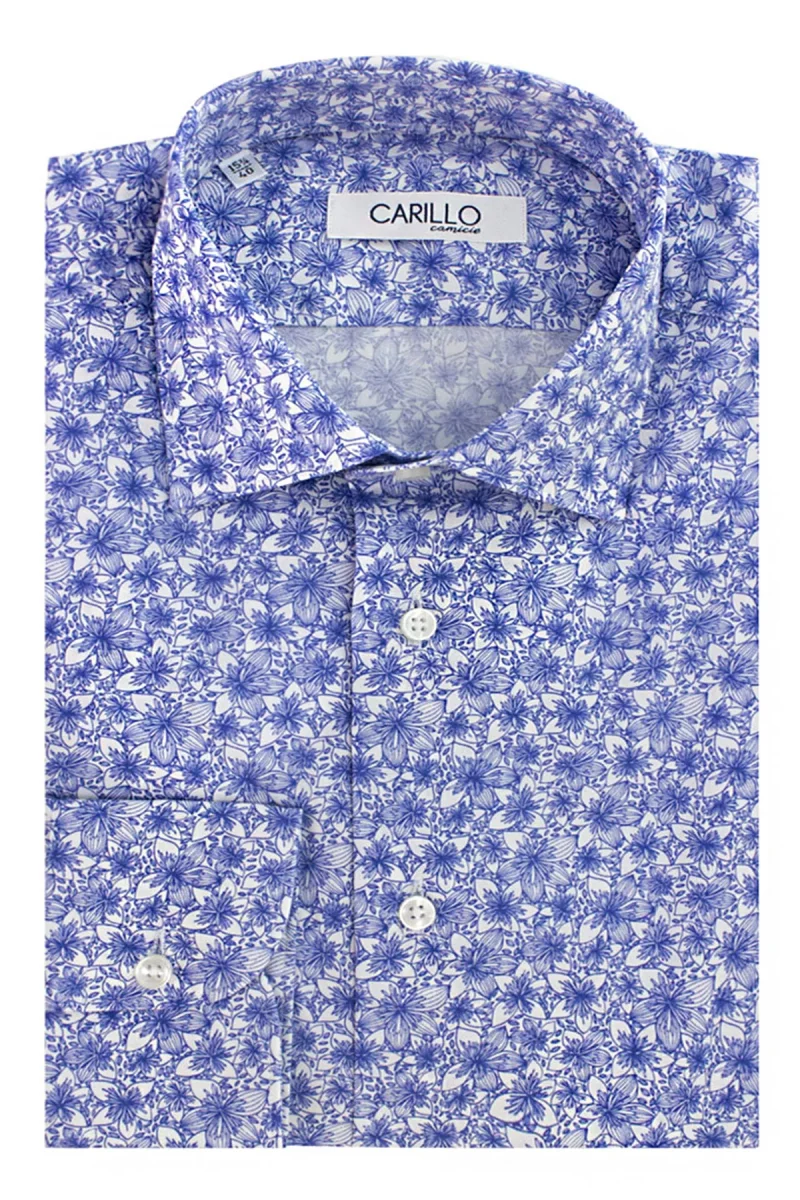 Camicia da uomo slim fit cotone elastico modello sartoriale maniche lunghe collo italiano fantasia fiori blu fondo bianco