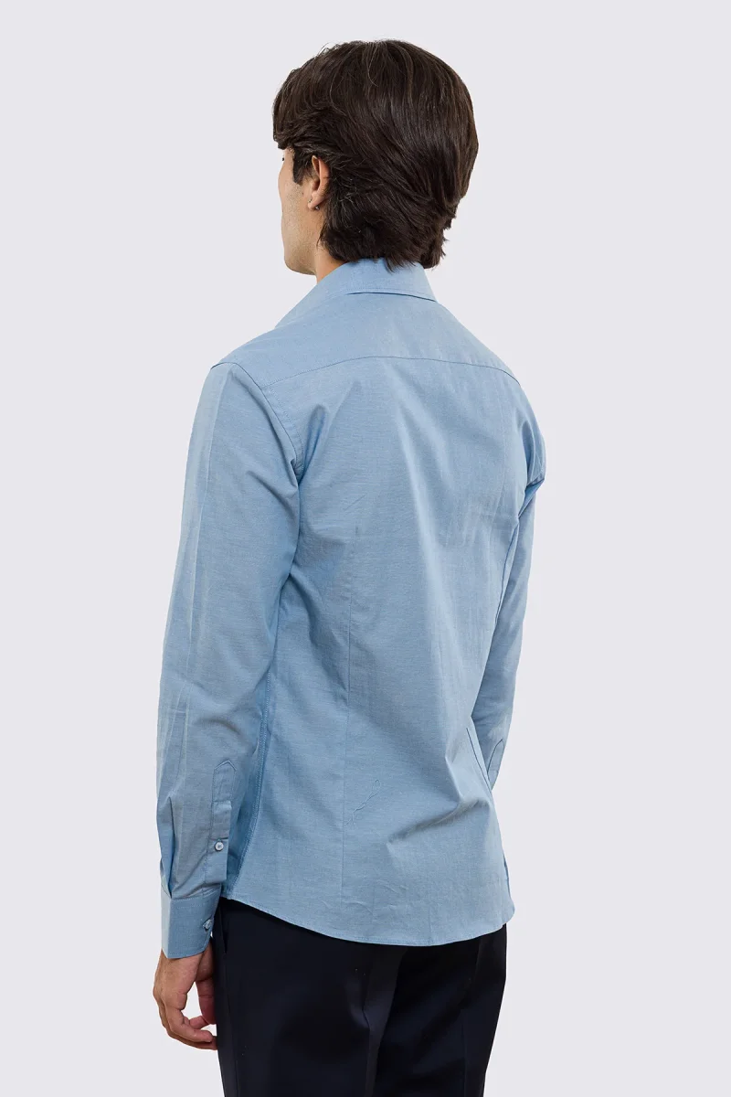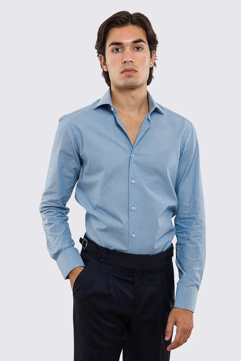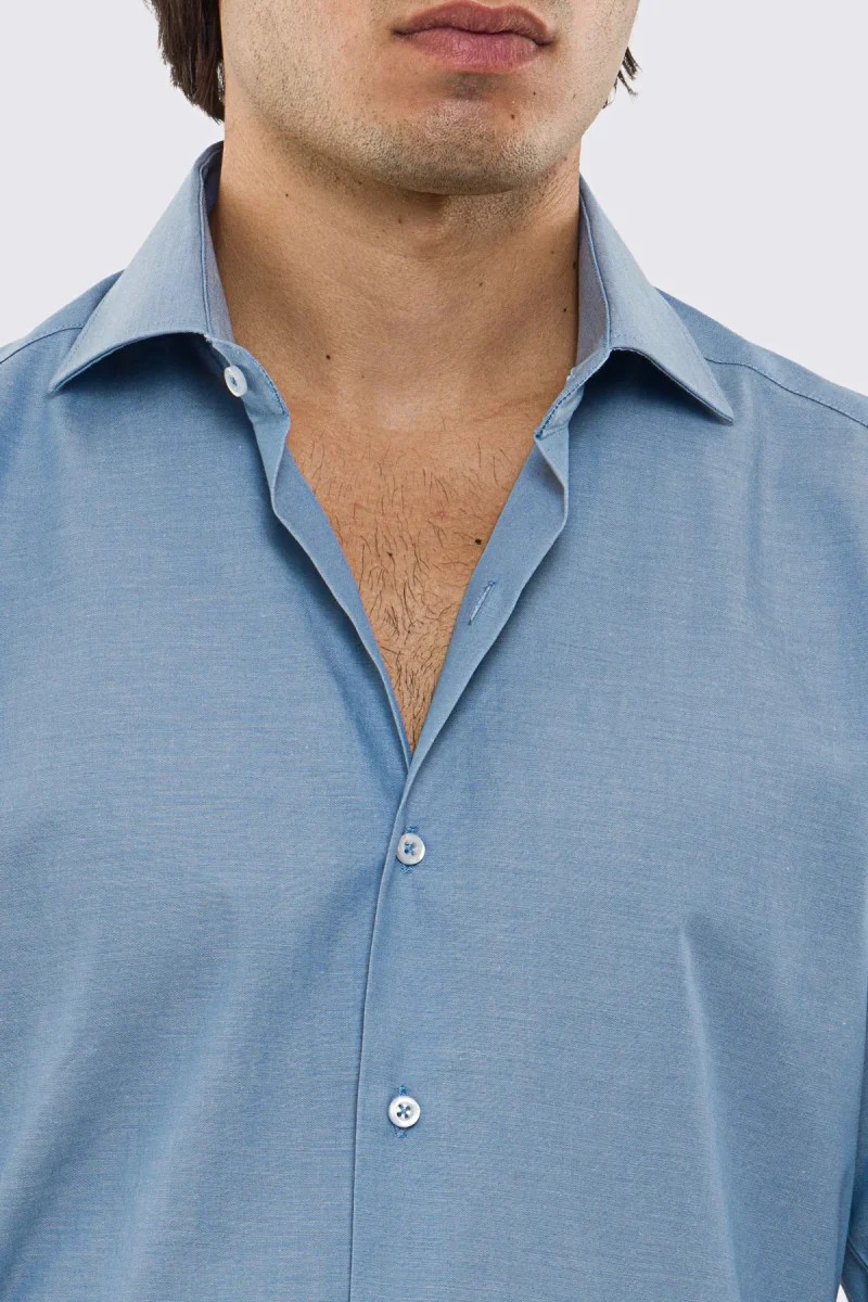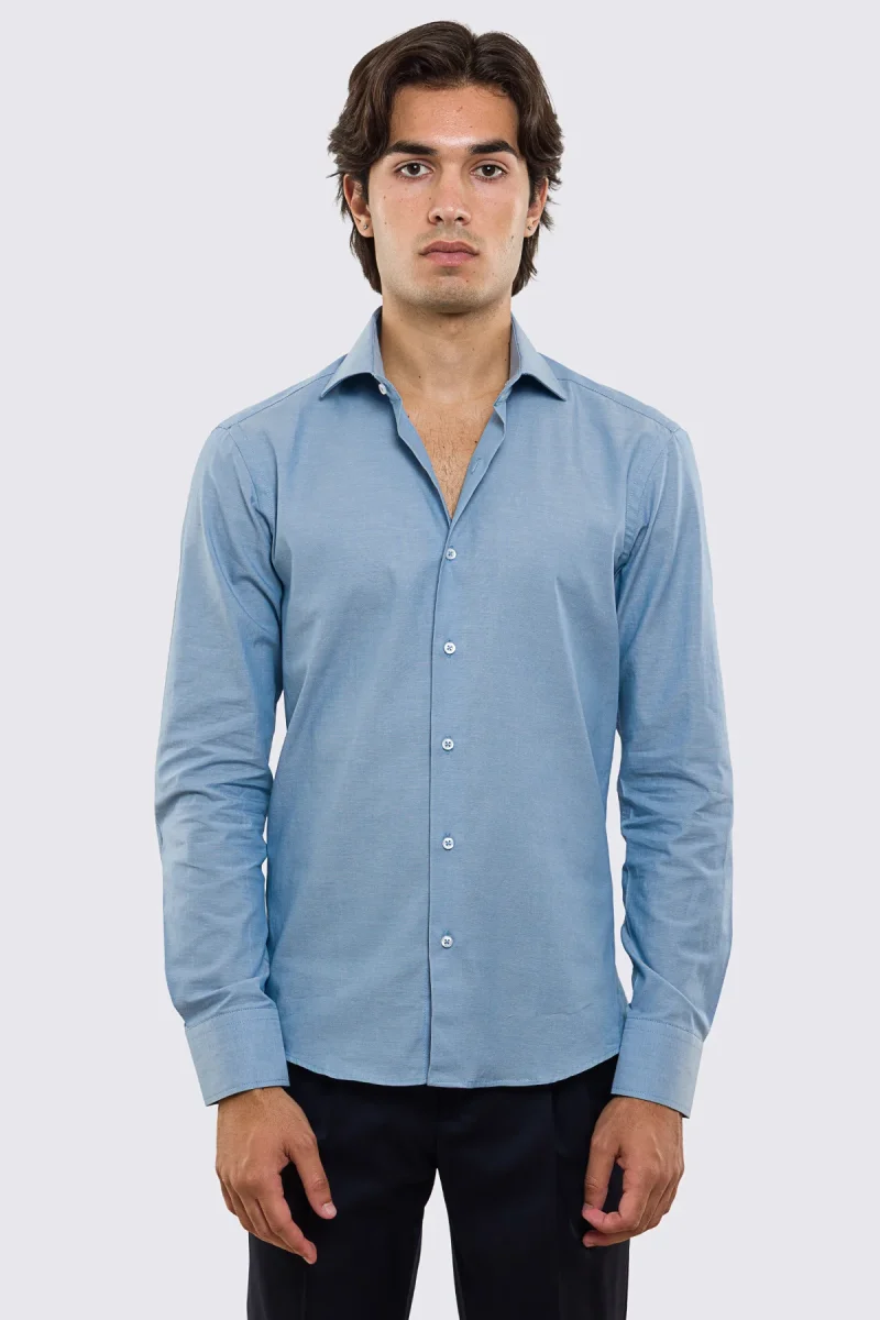 Camicia Uomo denim chiaro slim fit 100% cotone Collo semi francese polso smussato bottoni bianchi effetto madreperla
