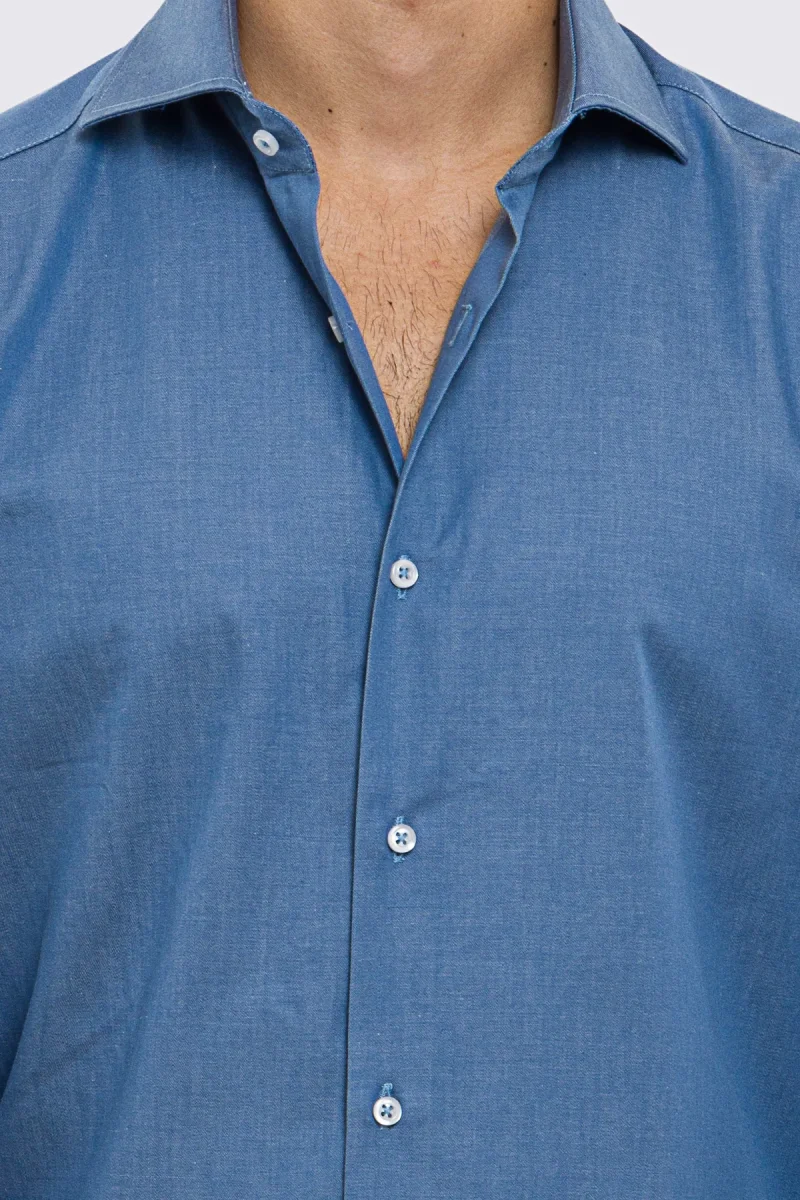Camicia Uomo denim regular fit 100% cotone Collo semi francese polso smussato bottoni bianchi effetto madreperla