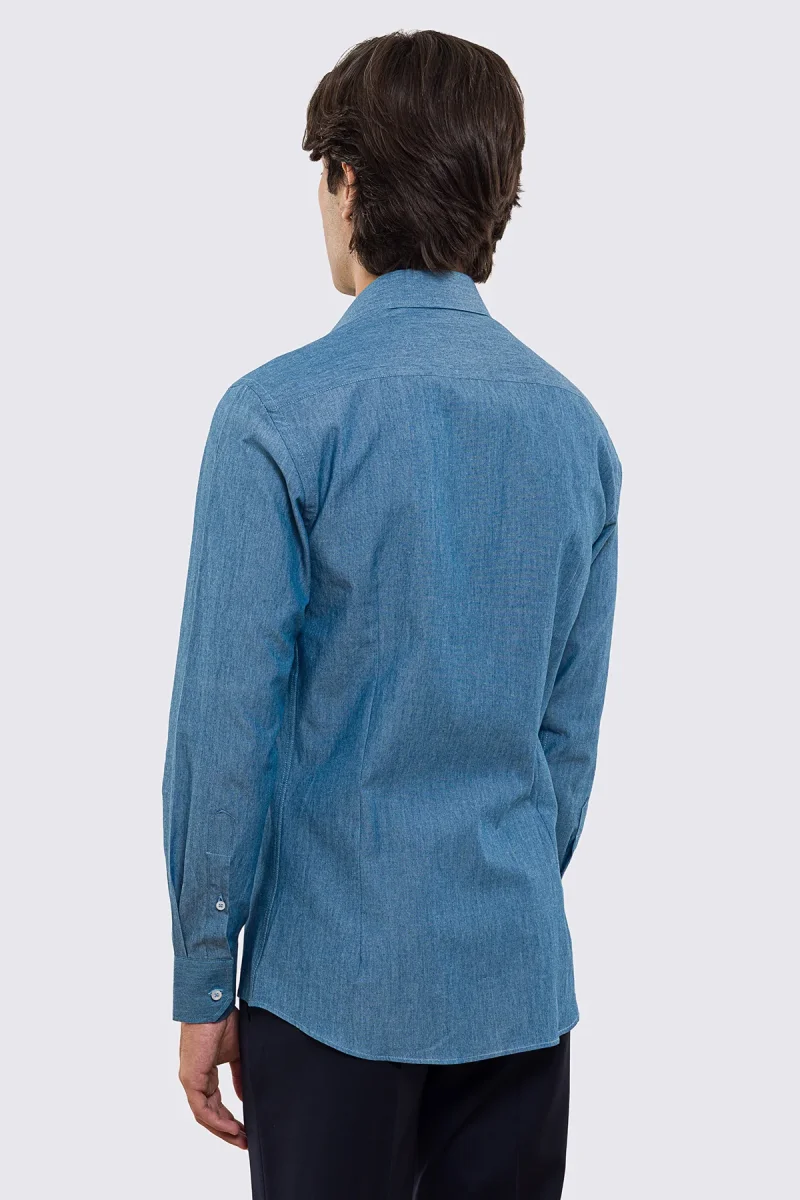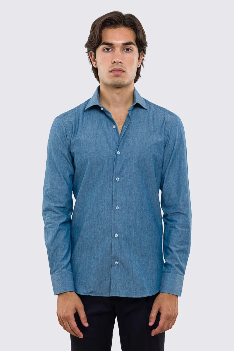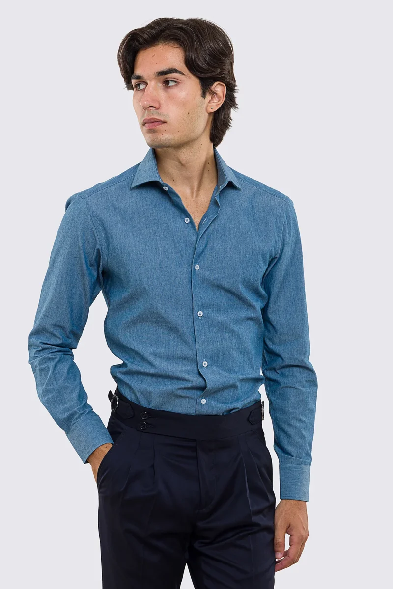 Camicia Uomo denim slim fit 100% cotone Collo semi francese polso smussato bottoni bianchi effetto madreperla