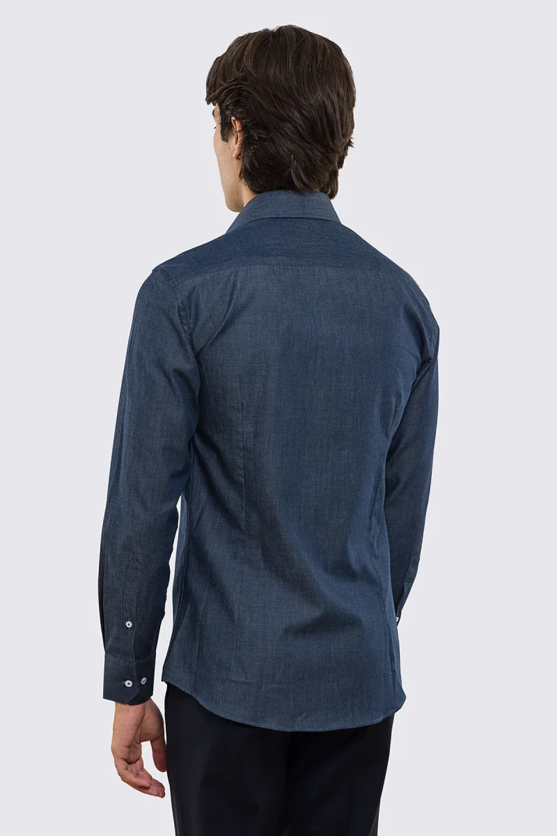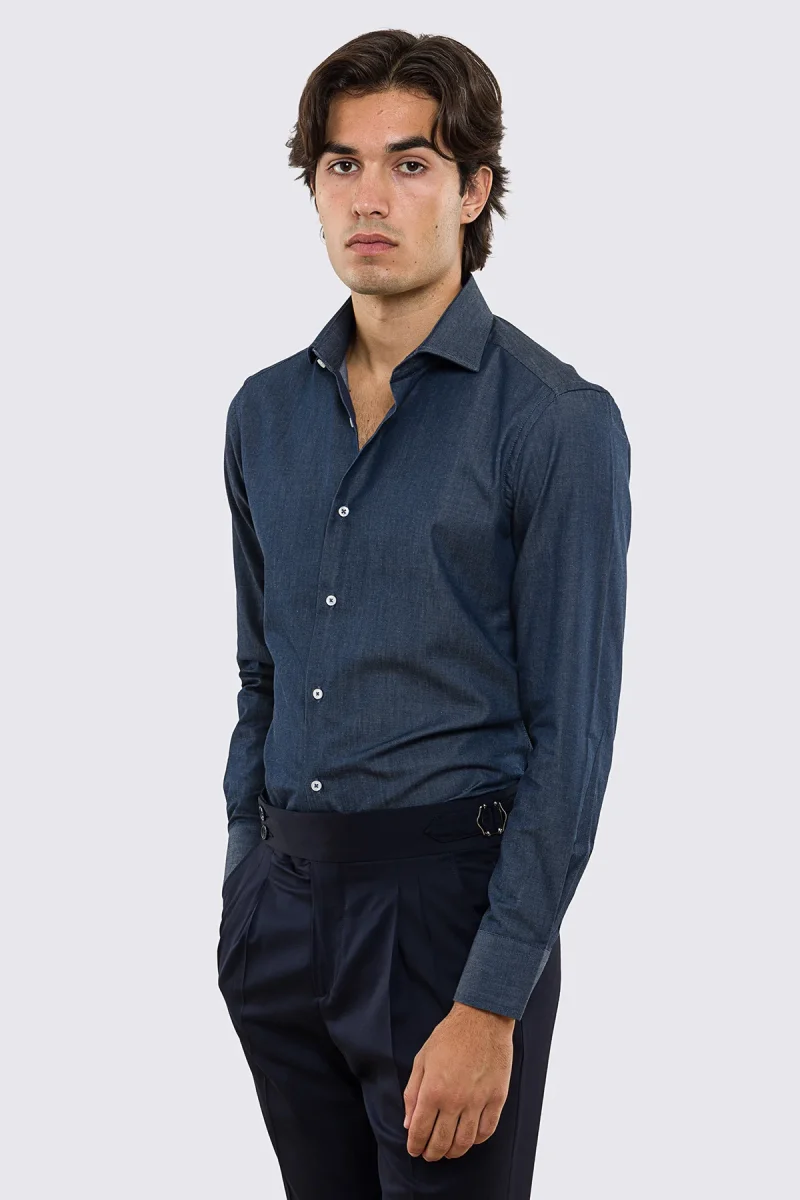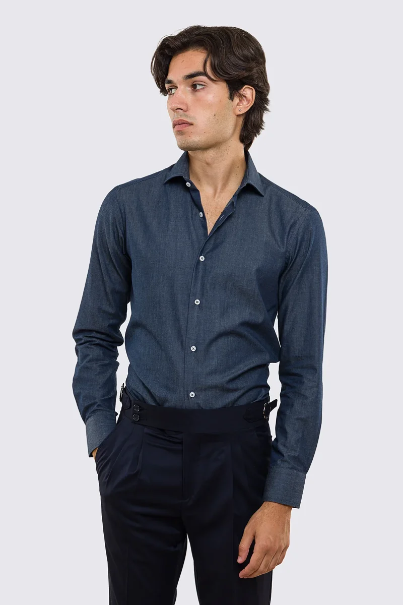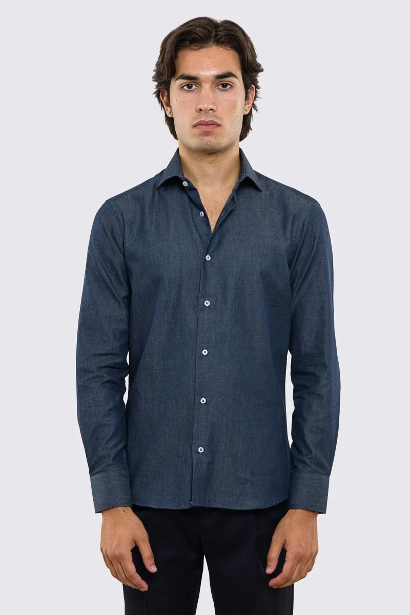 Camicia Uomo denim slim fit 100% cotone Collo semi francese polso smussato bottoni bianchi effetto madreperla