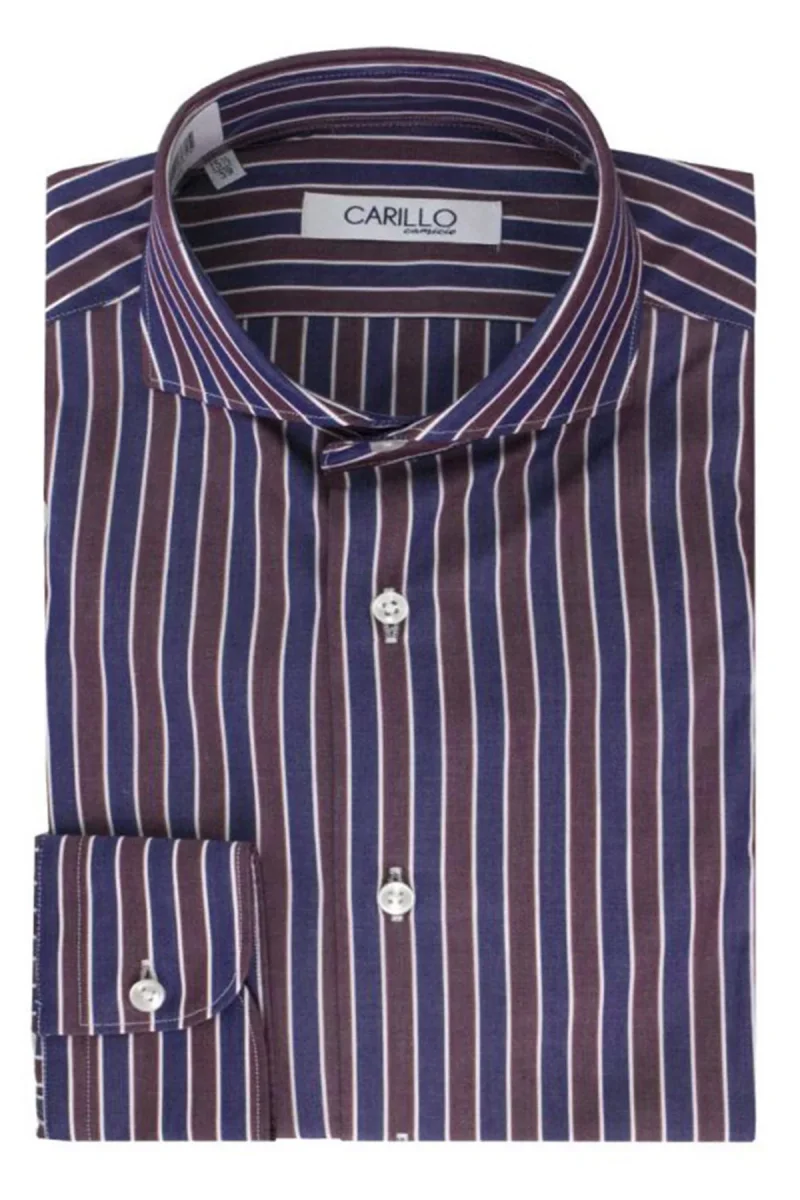 Camicia uomo slim 100% cotone modello sartoriale collo francese fantasia riga blu bianca e bordeaux bottoni bianchi