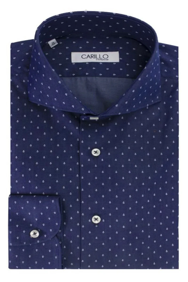 Camicia uomo regular fit 100% puro cotone modello sartoriale collo francese fantasia ancora bianca su fondo blu bottoni bianchi effetto perlato