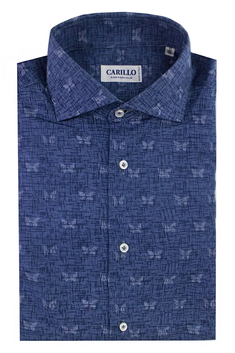 Camicia Uomo in cotone elasticizzato vestibilita slim fit con collo semi francese a fantasia effetto denim con stampa farfalla