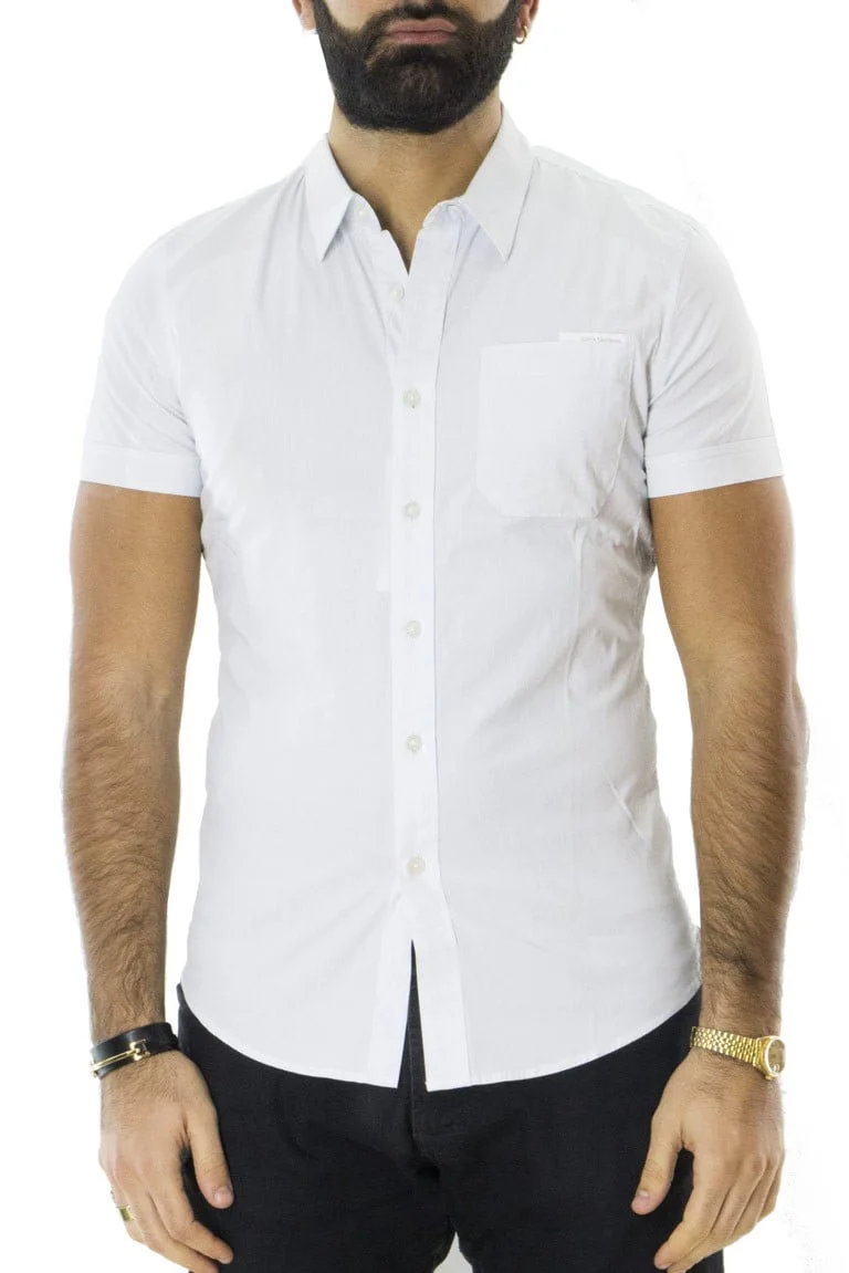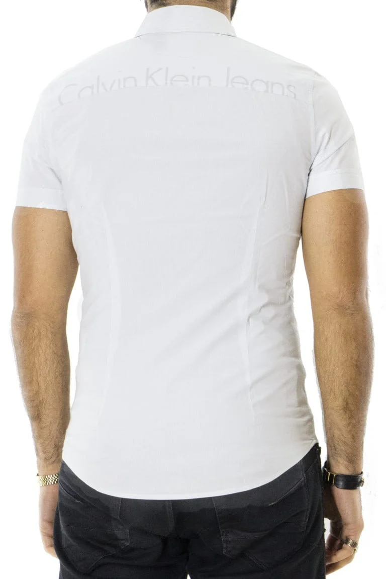 Camicia da uomo in cotone slim fit fantasia riga verticale celeste collo italiano e logo sul retro