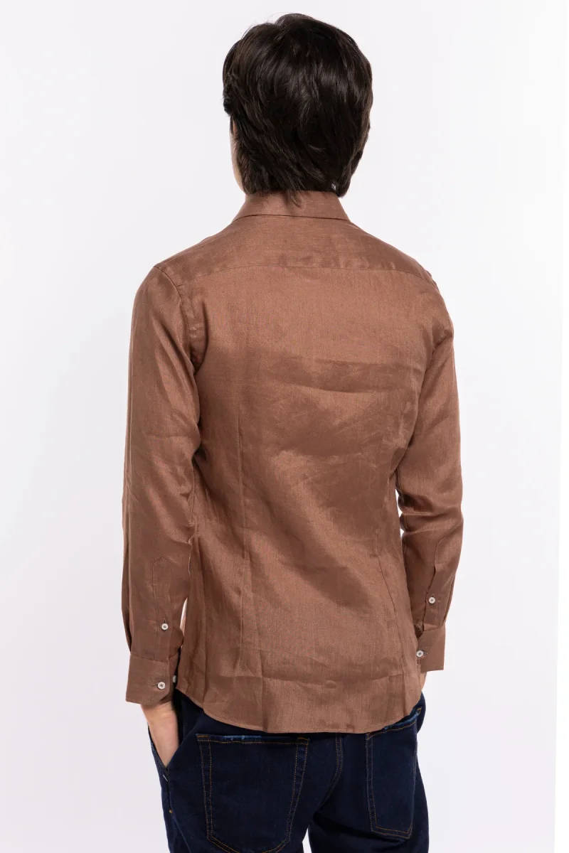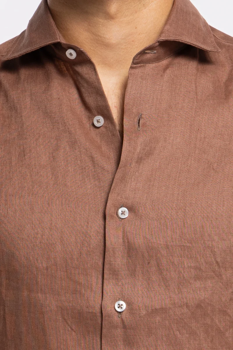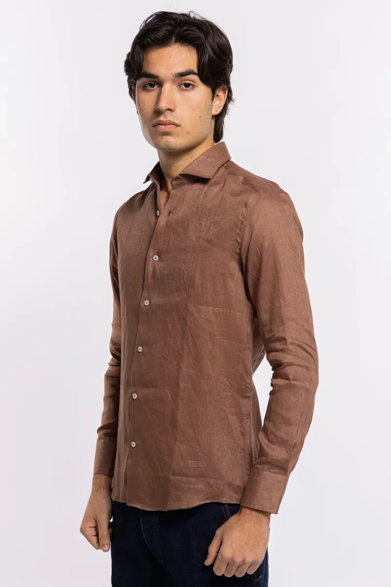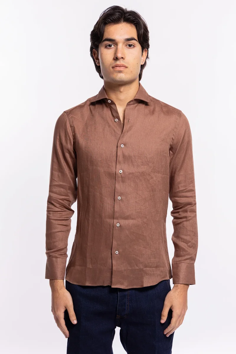 Camicia Uomo Marrone in Lino 100% made in italy collo semi francese morbido slim fit