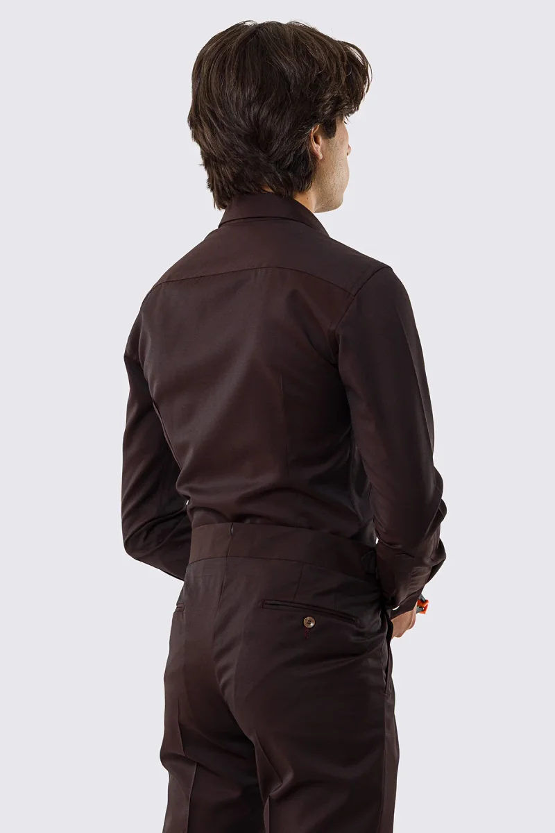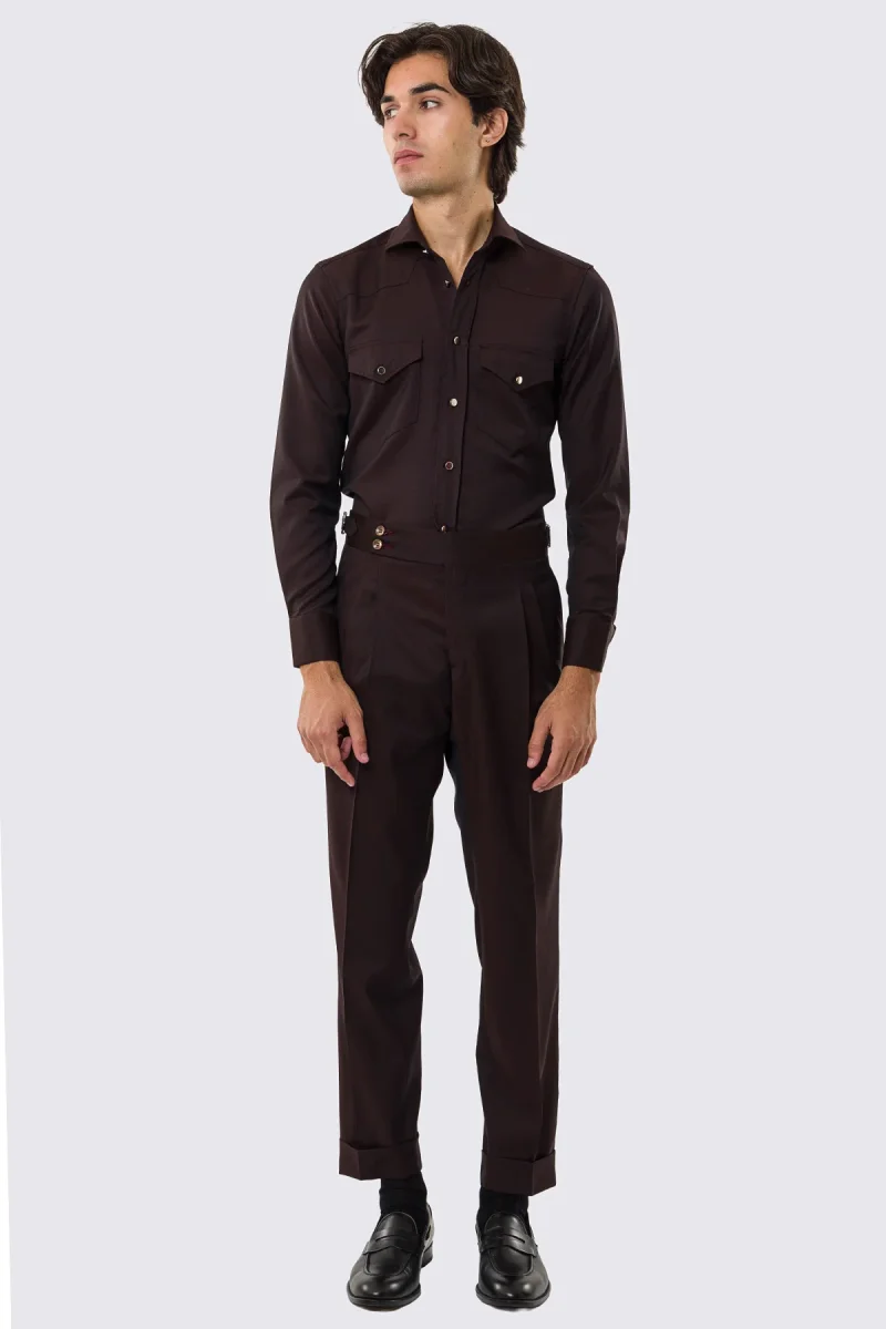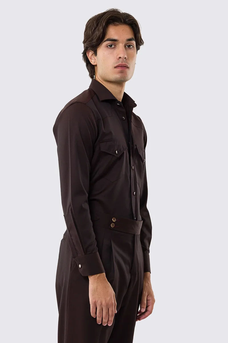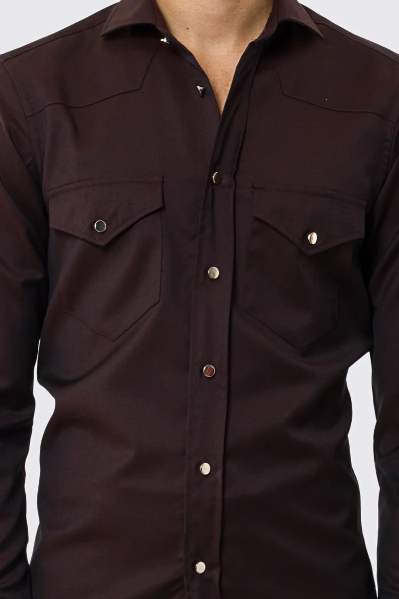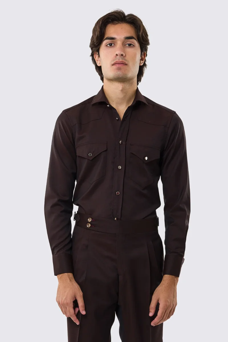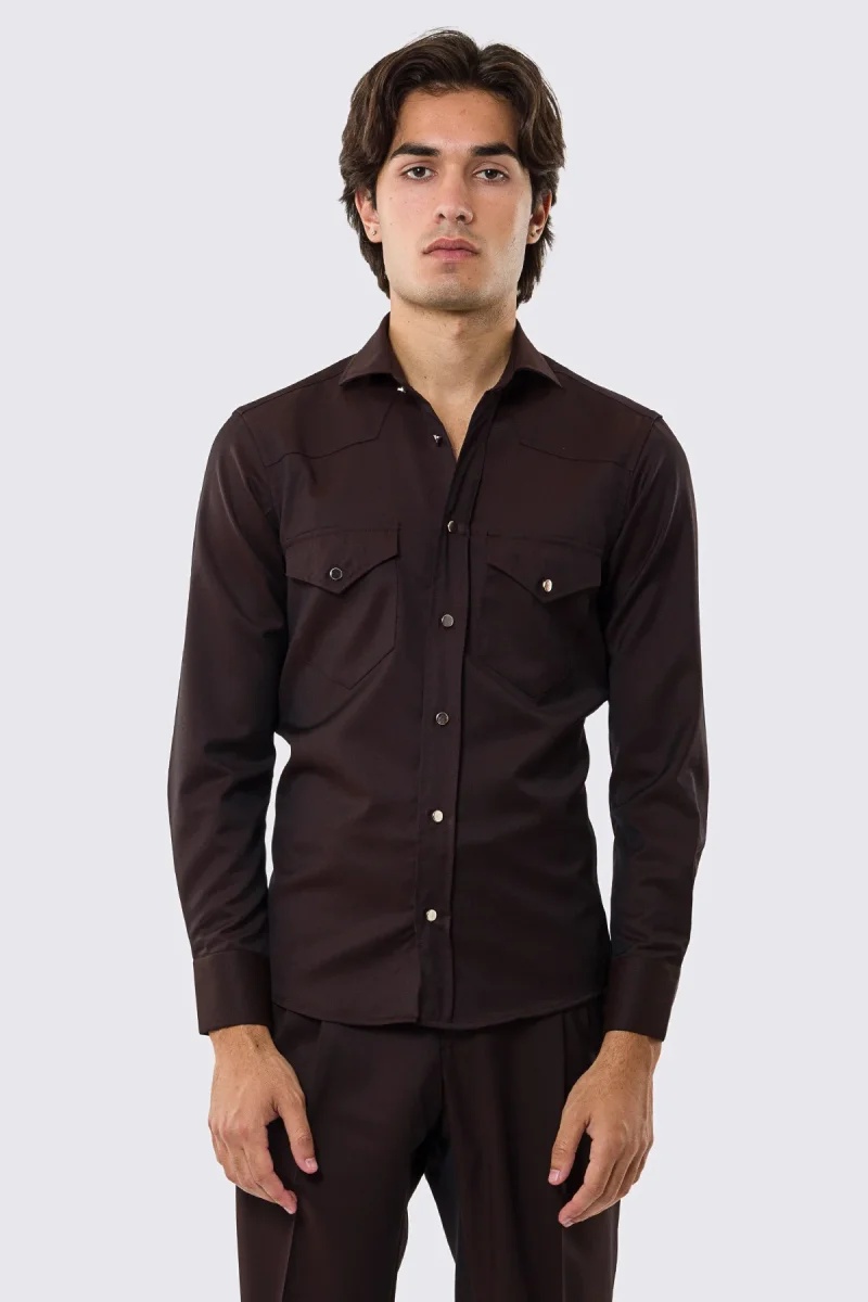 Camicia Uomo marrone modello texana vitale barberis canonico fresco lana super 130’s made in italy collo semi francese morbido slim fit bottoni argento