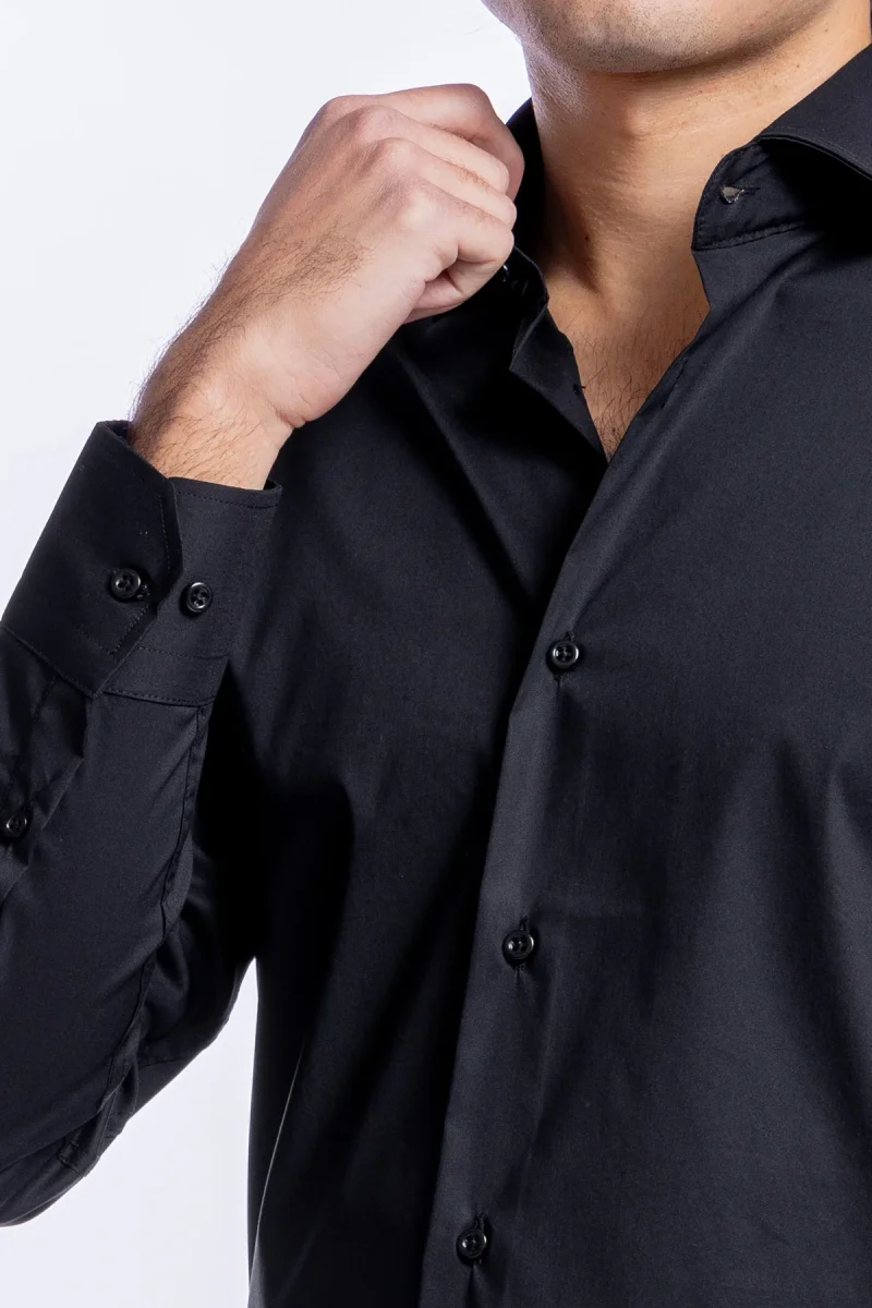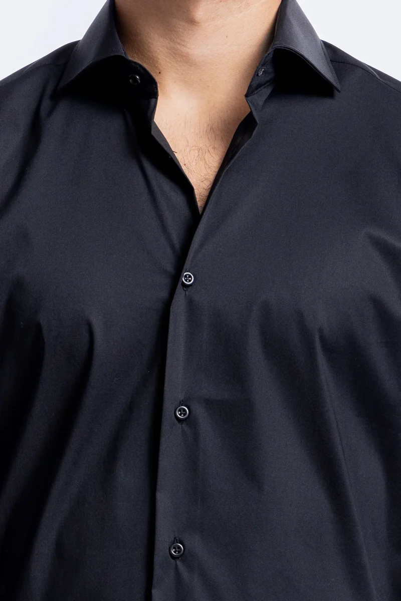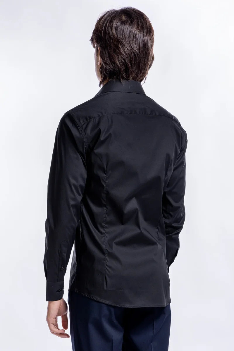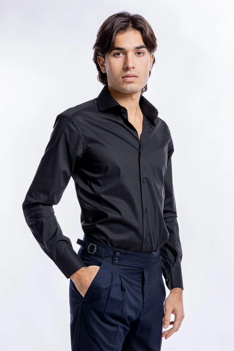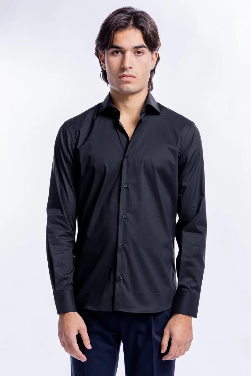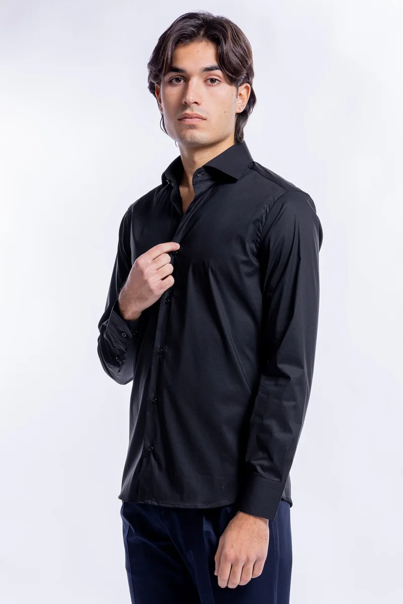 Camicia Uomo nera slim fit in cotone Elastico Collo semi francese tinta unita sartoriale