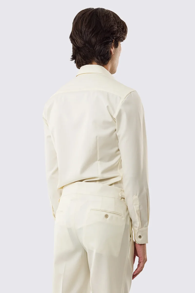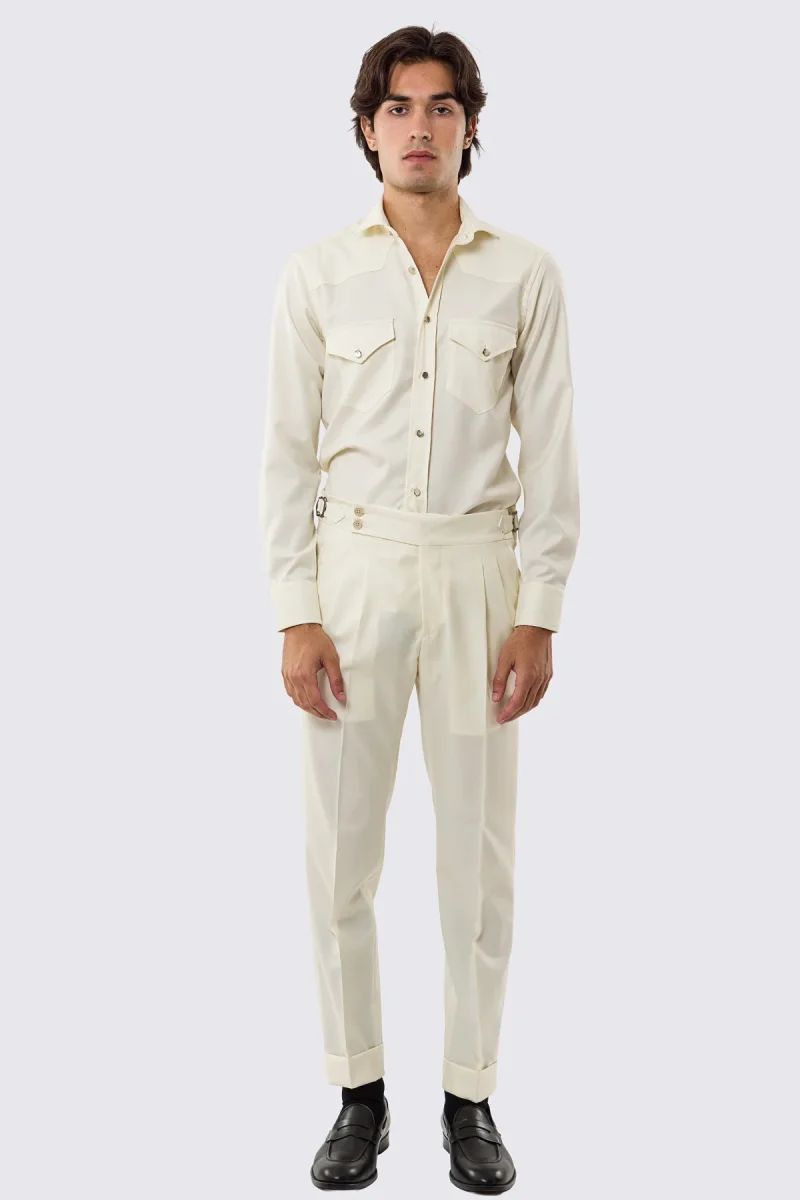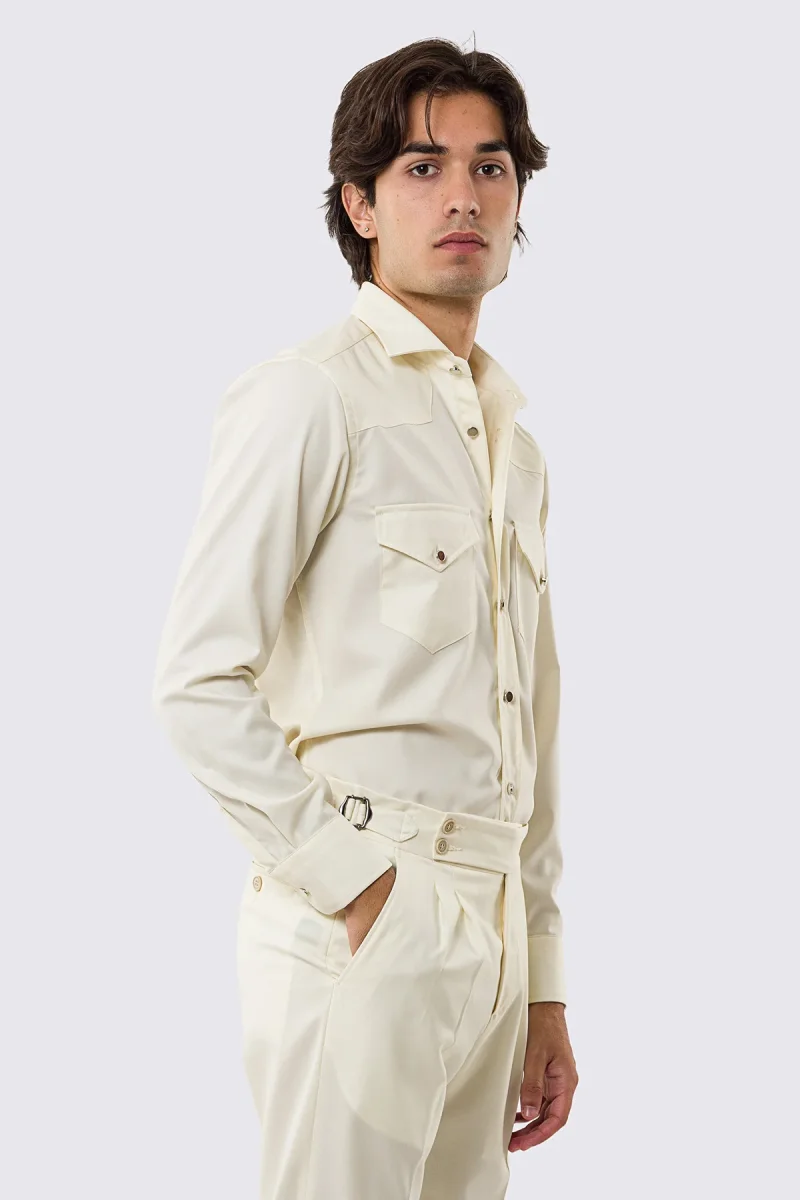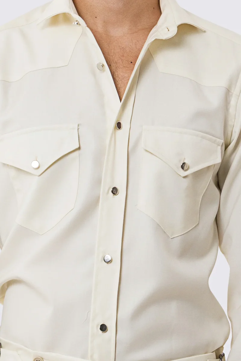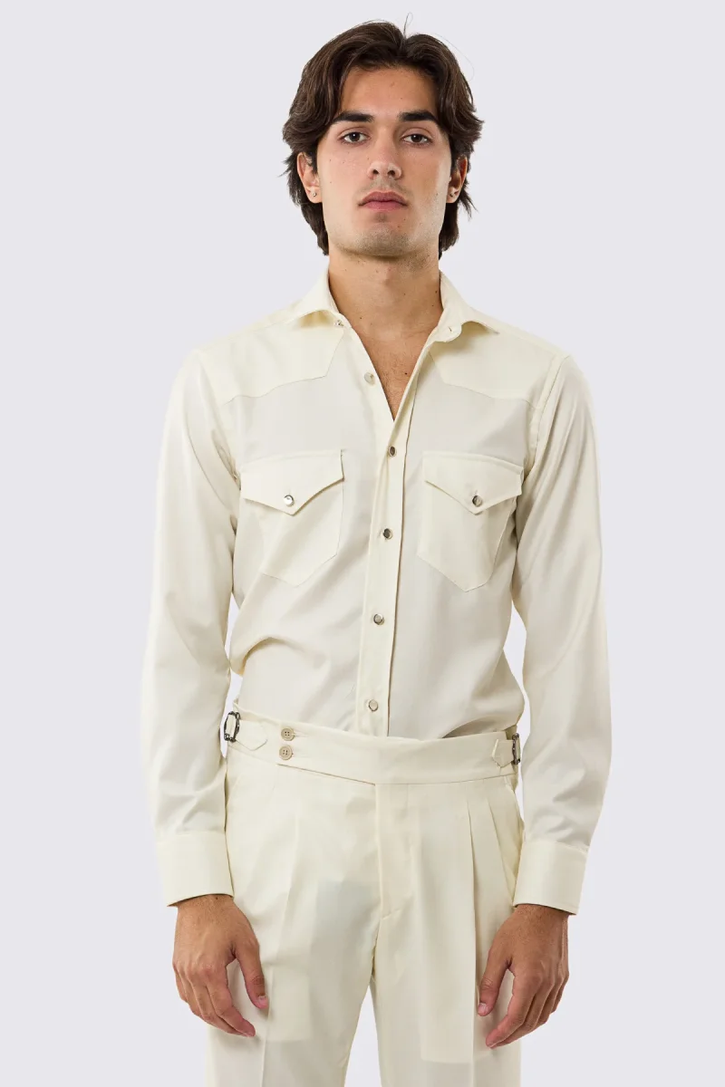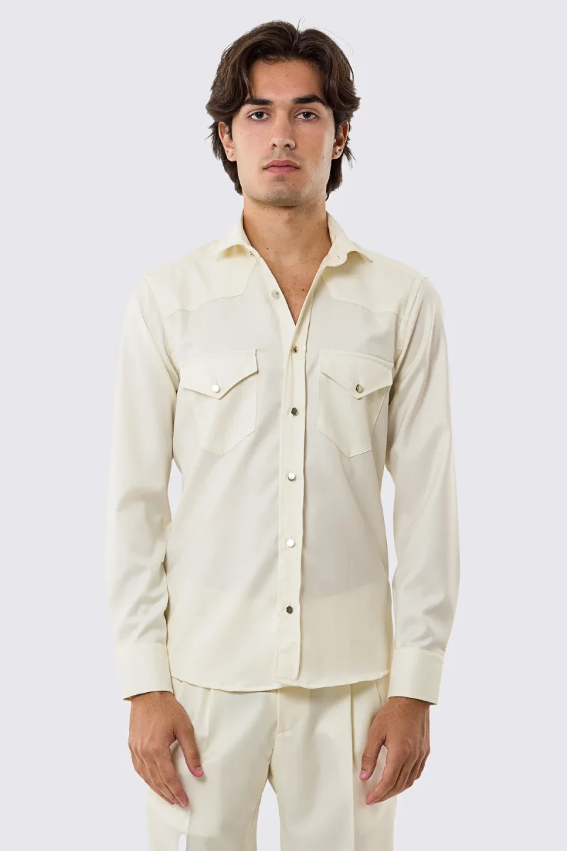 Camicia Uomo panna modello texana vitale barberis canonico fresco lana super 130’s made in italy collo semi francese morbido slim fit bottoni argento