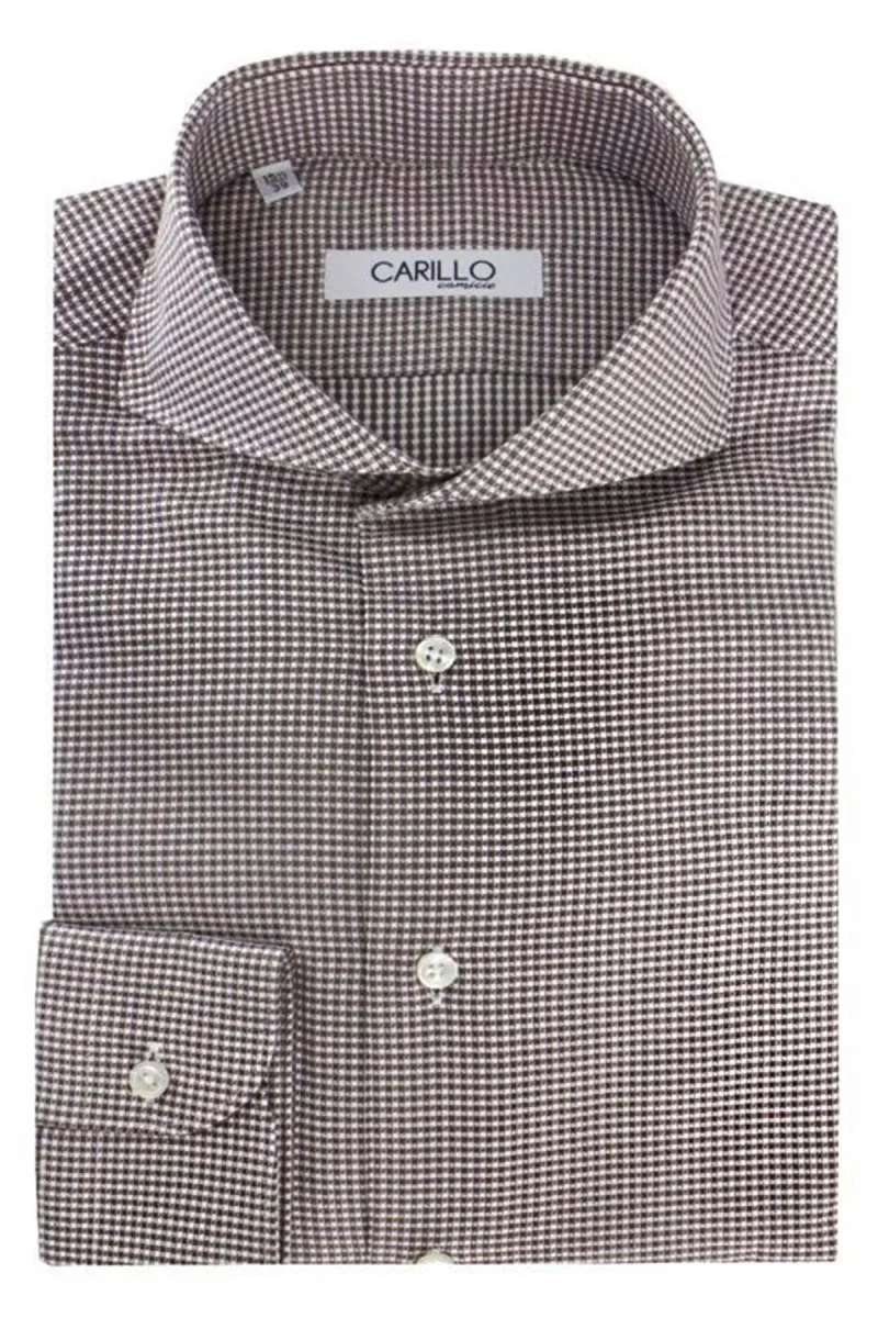 Camicia uomo vestibilita regular 100% cotone collo francese fantasia microquadro marrone su fondo bianco e microfantasia all’interno del quadro