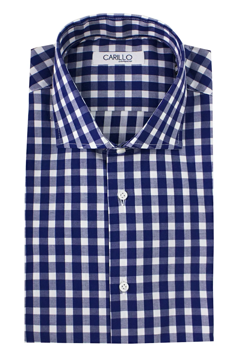 Camicia uomo regular in cotone elastico fantasia quadri blu e bianchi collo francese