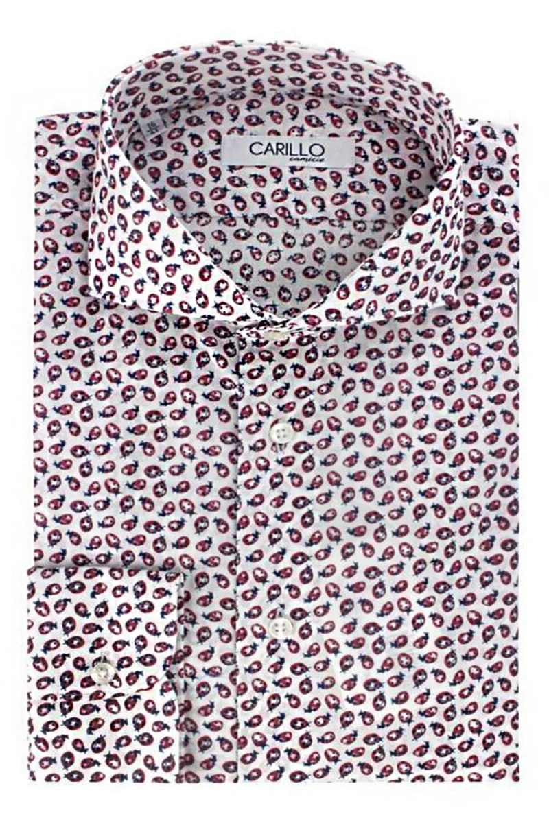 Camicia uomo regular fit cotone leggermente elasticizzato modello sartoriale collo francese fantasia coccinelle rosse su fondo bianco bottoni bianchi effetto perlato. Il modello veste una taglia 41 per un altezza di 1,76 m.