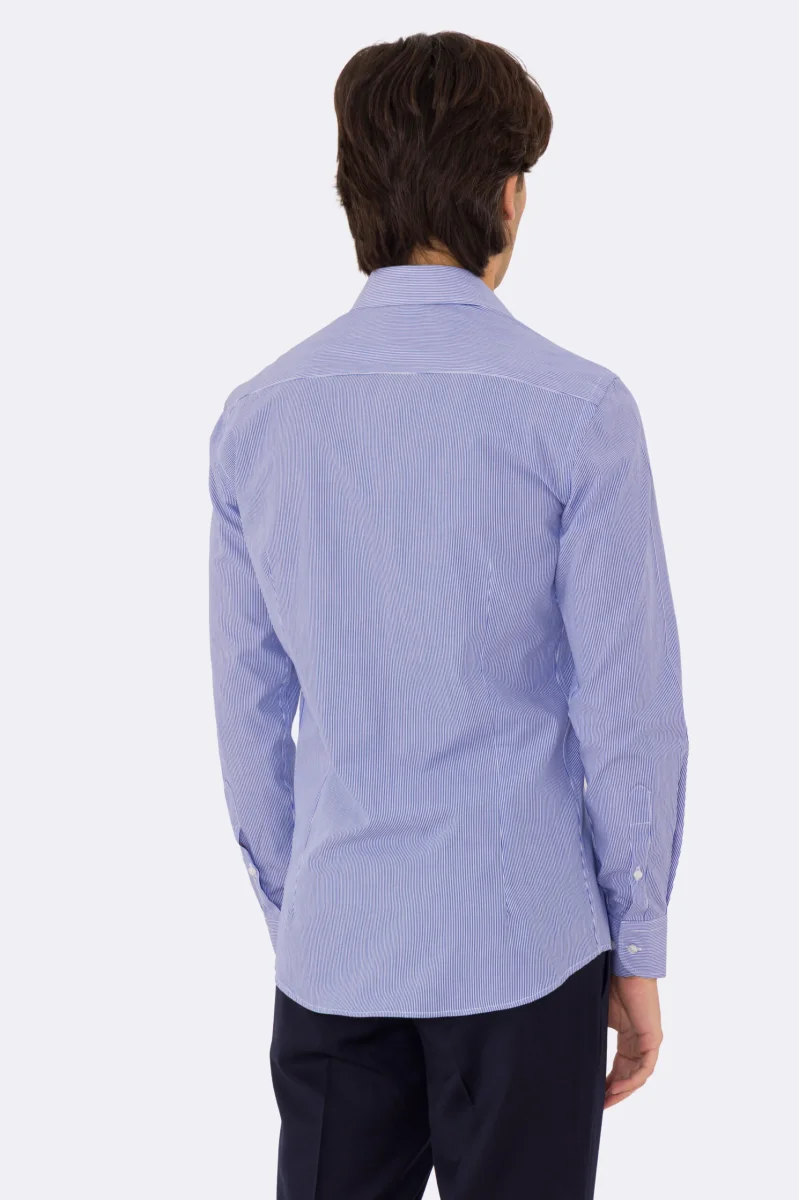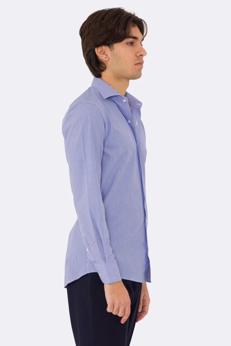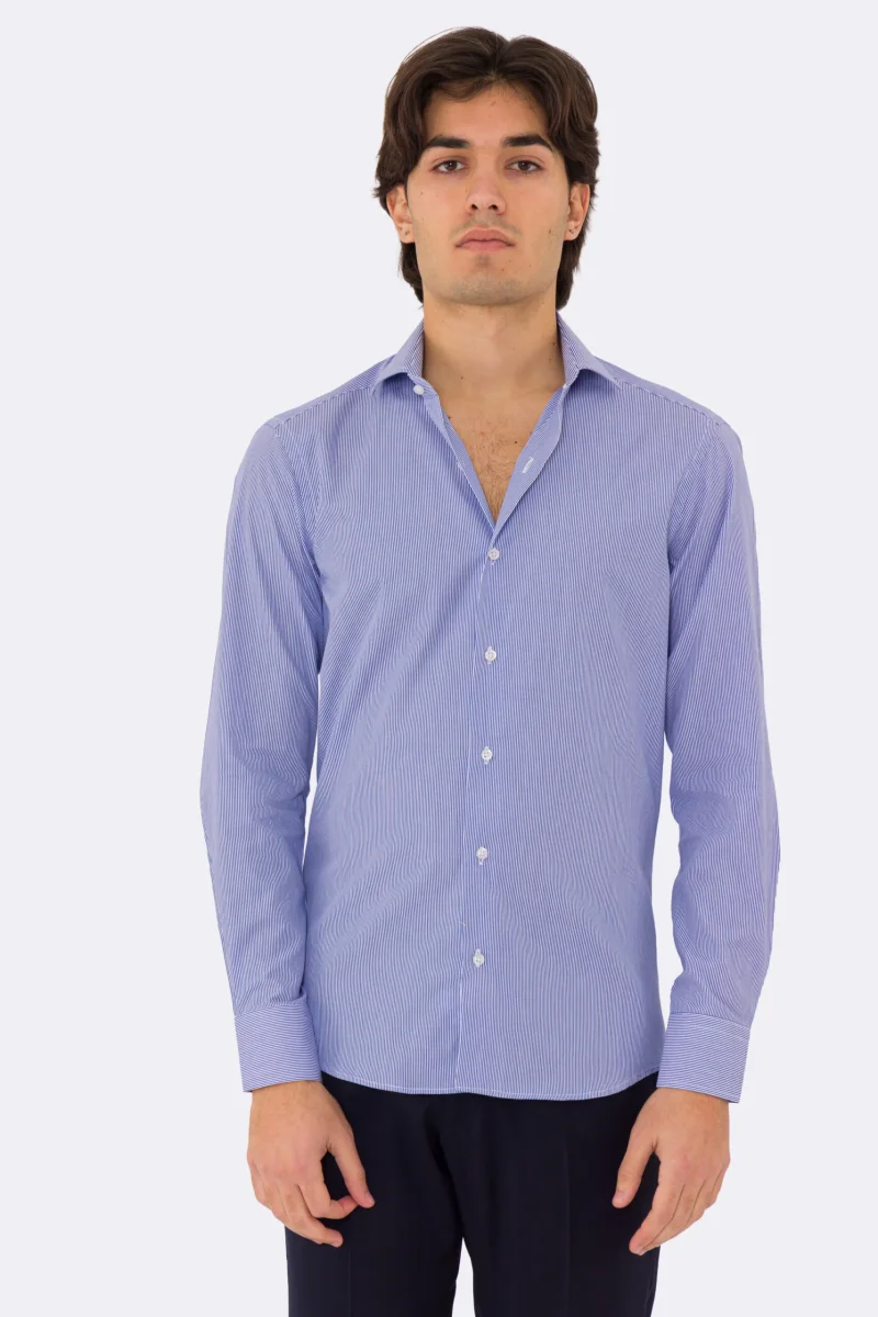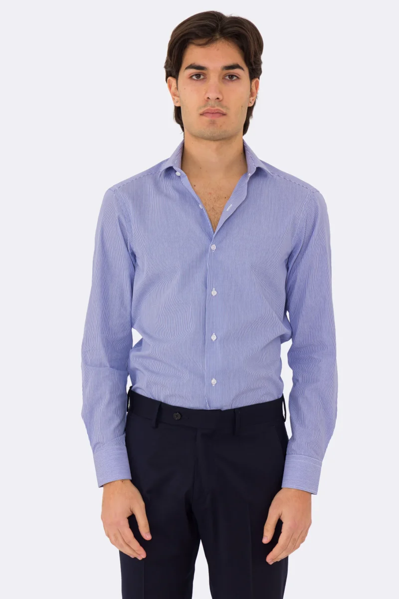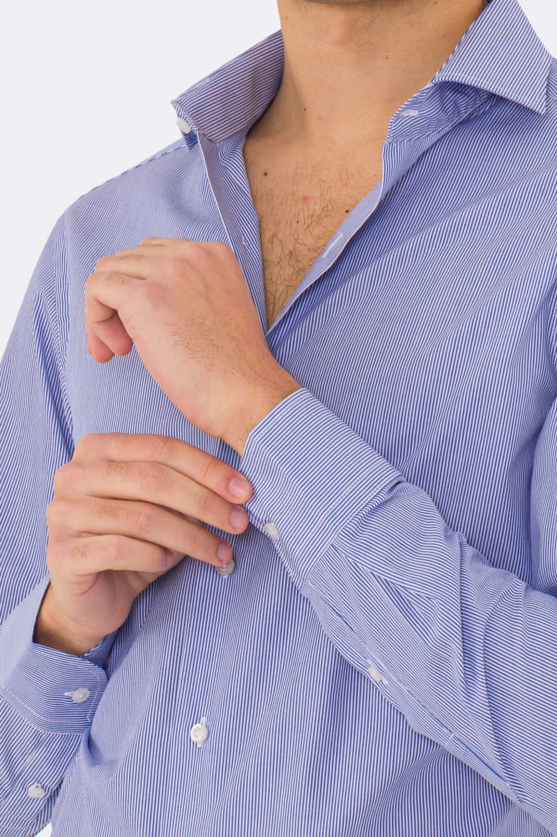 Camicia Uomo Royal blu a mille righe slim Fit 100% cotone popeline collo semi francese Tessuti Twill