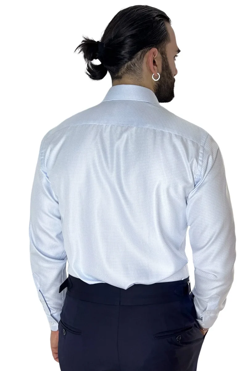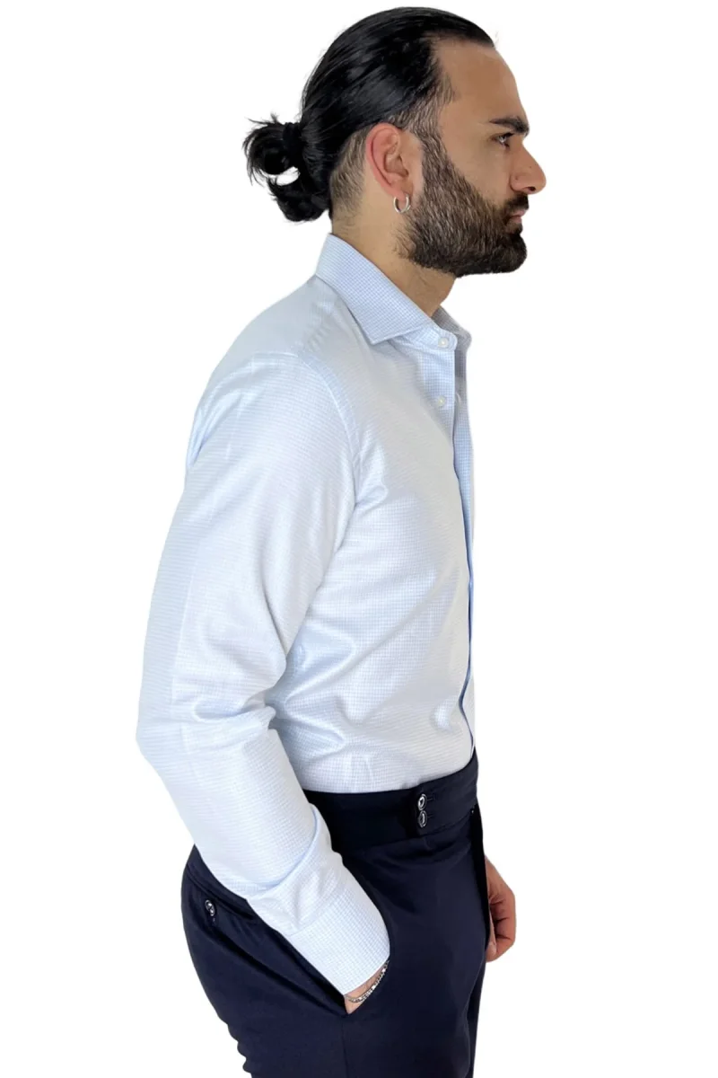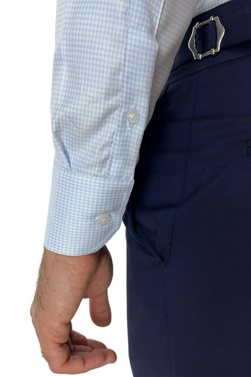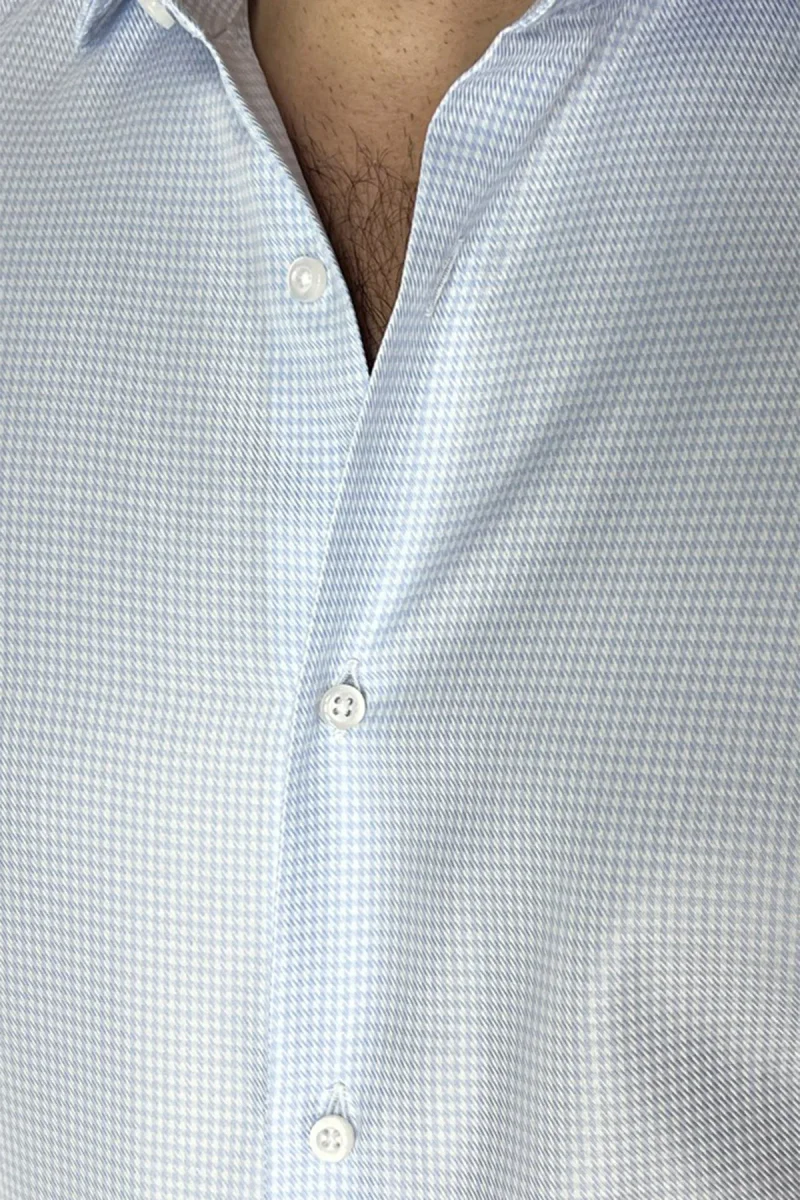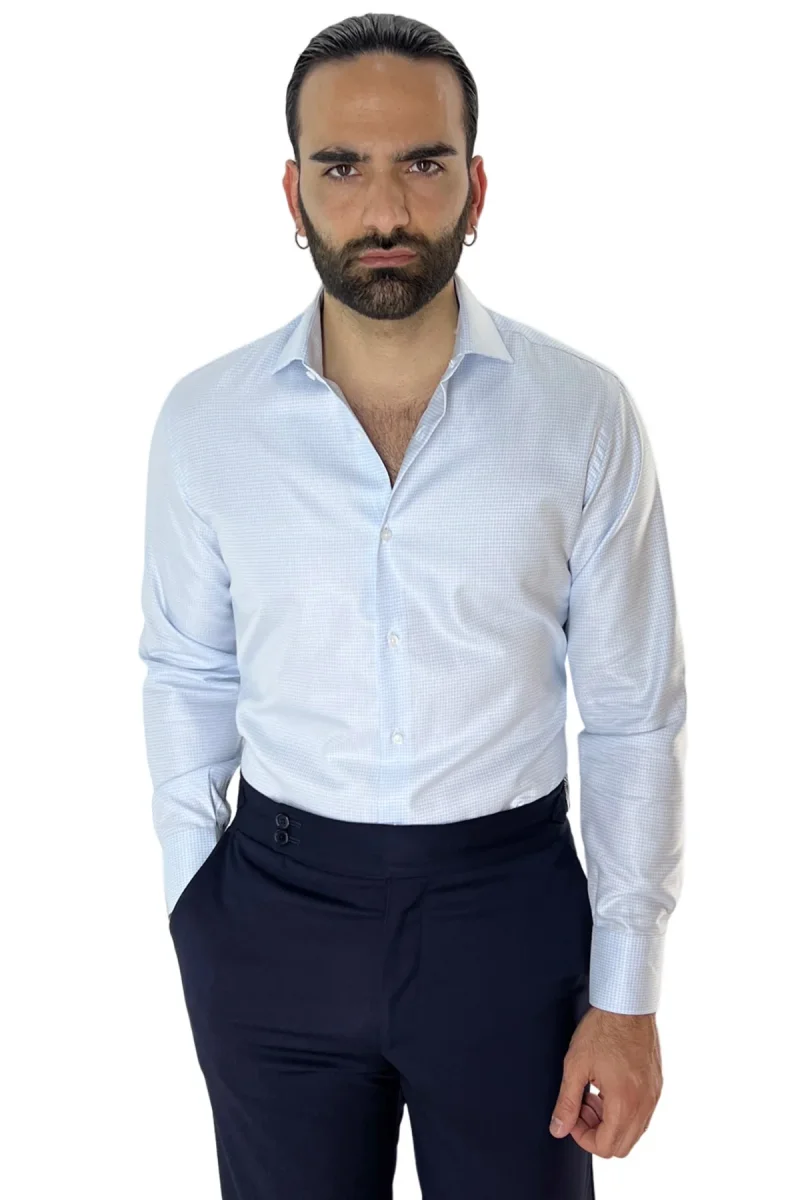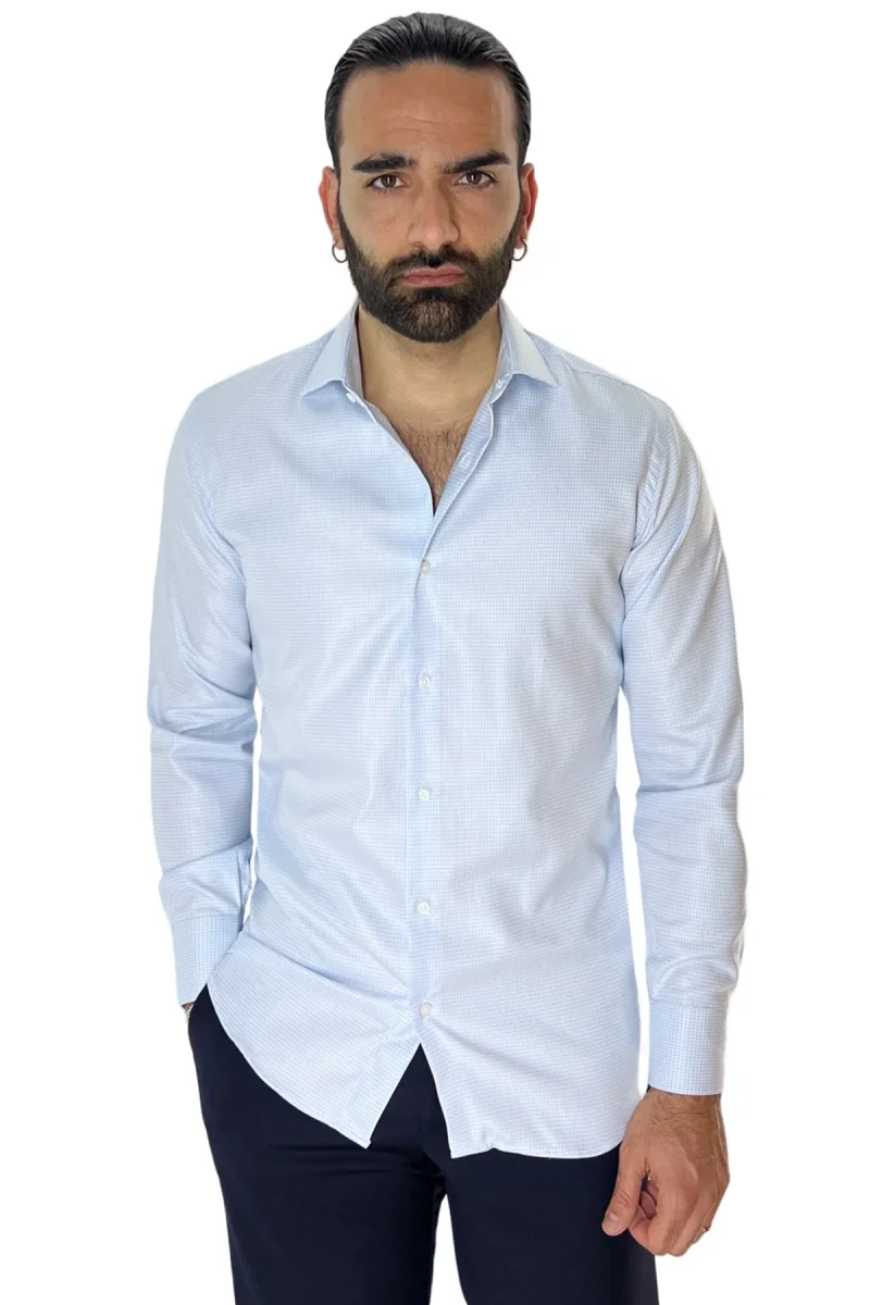 Camicia Uomo Slim fit in cotone 100% fantasia pied de poule celeste Collo semi francese