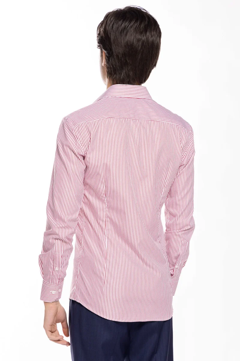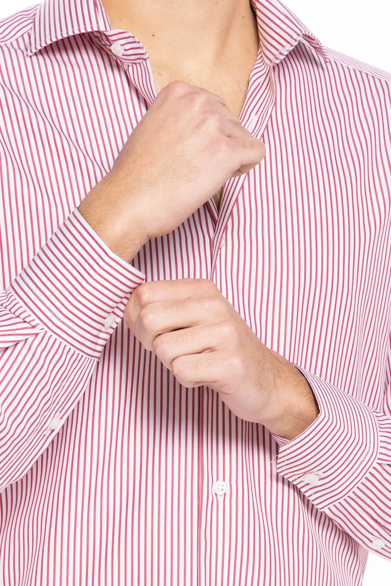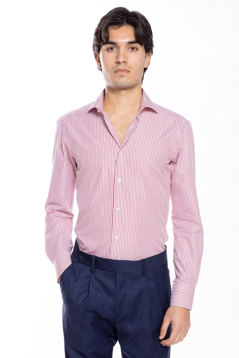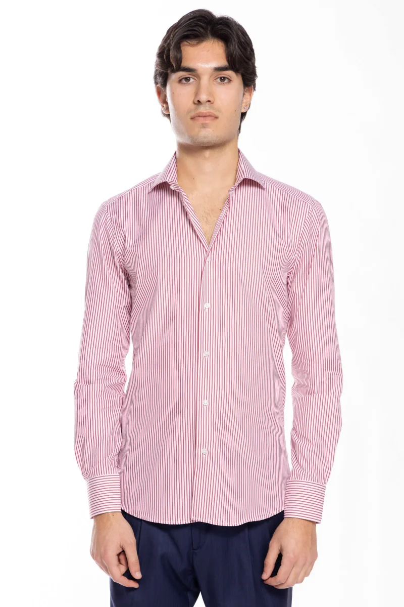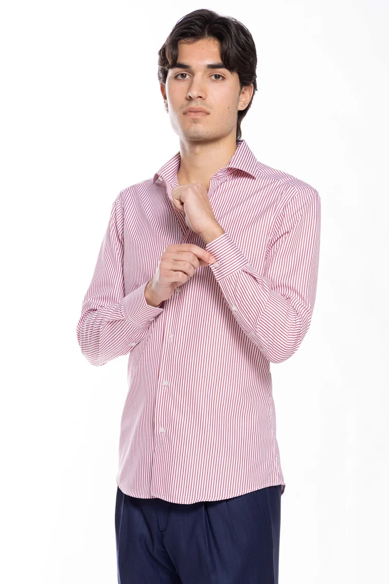 Camicia Uomo slim Fit riga rossa stretta 100% cotone collo semi francese mileta Tessuti