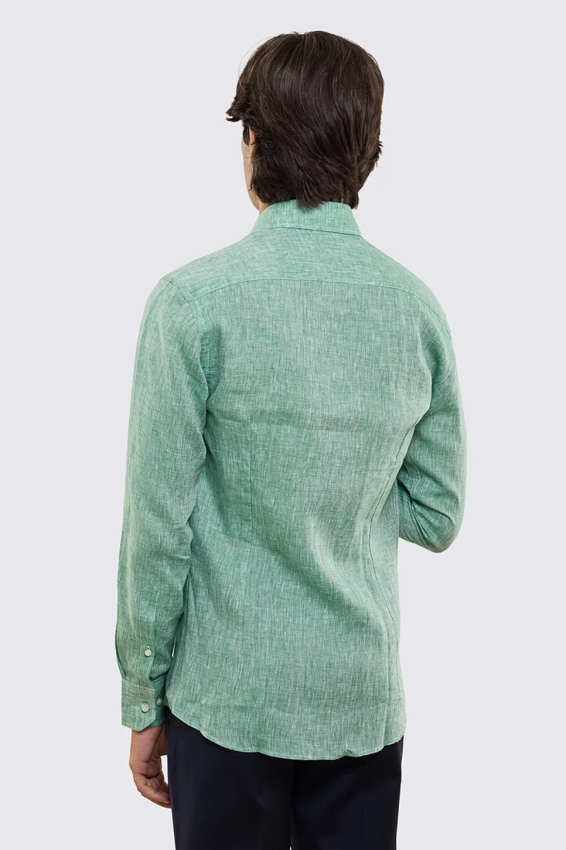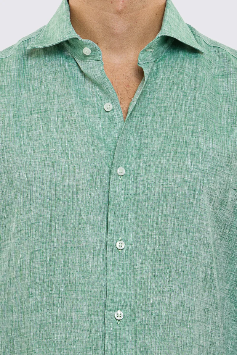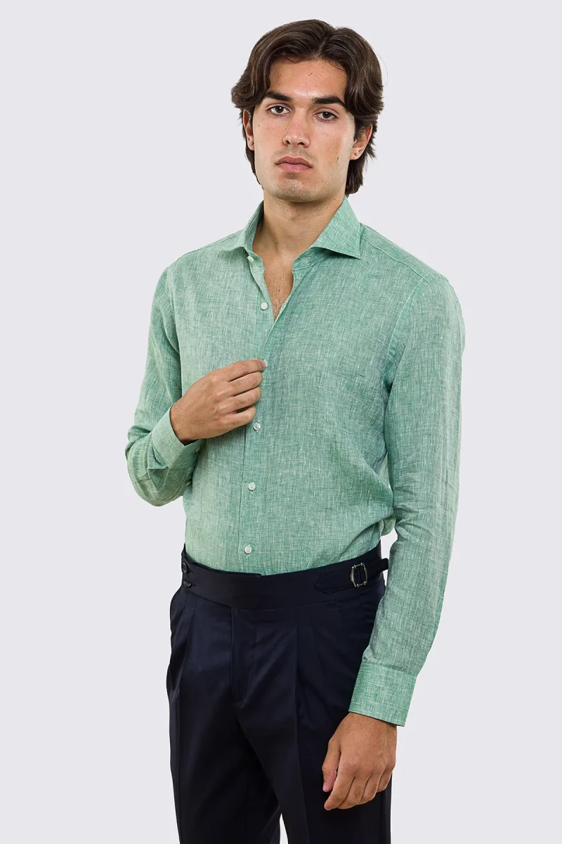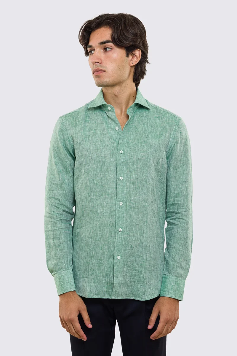 Camicia Verde in Lino 100% made in italy da uomo collo semi francese morbido slim fit effetto melange mileta tessuti