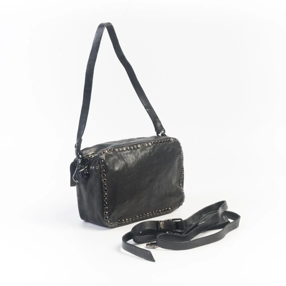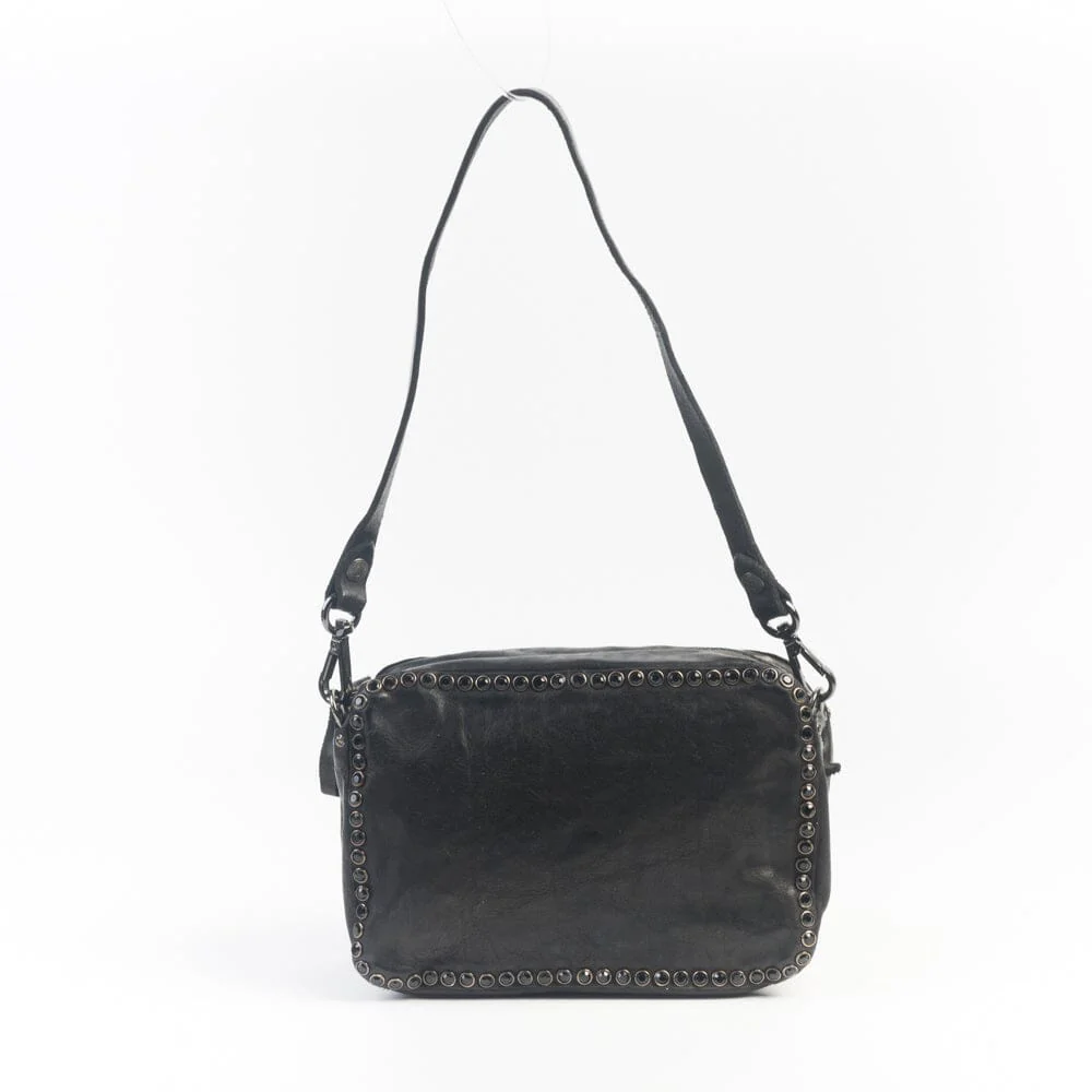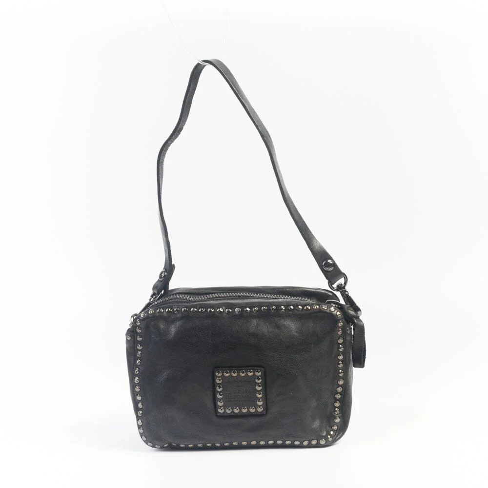 Borsa a spalla e a tracolla modello bauletto di Campomaggi in vacchetta naturale tinta in capo di colore nero. Applicazione di borchiette strass di colore nero frontalmente, profilo sulla parte posteriore con borchiette di metallo brunito. Manico sottile in pelle da portare a spalla con moschettoni di metallo di colore brunito e tracolla lunga in pelle regolabile da portare a tracolla. Chiusura con zip, interno foderato in tessuto. Applicazione di iconica label del brand sul retro. In dotazione kit di pulizia/crema di nutrimento per il pellame e borsa in tessuto.