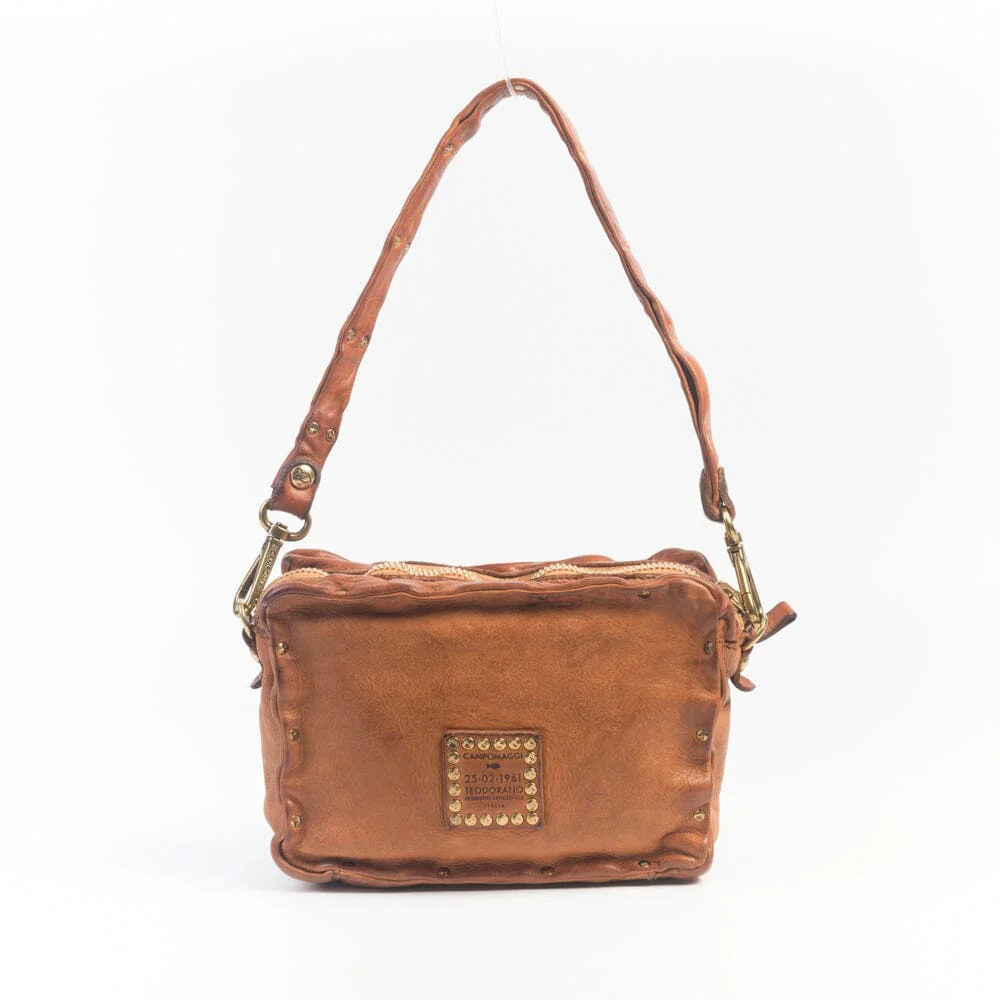 Borsa a spalla e a tracolla di Campomaggi in vacchetta naturale tinta in capo di colore cognac, con applicazione di borchiette in metallo di colore oro brunito, sul profilo. Manico in pelle da portare a spalla con borchiette e con moschettoni di metallo di colore oro brunito e tracolla lunga in pelle regolabile da portare a tracolla. Chiusura con zip, interno foderato in tessuto. Applicazione di iconica label del brand sul retro. In dotazione kit di pulizia/crema di nutrimento per il pellame e borsa in tessuto.