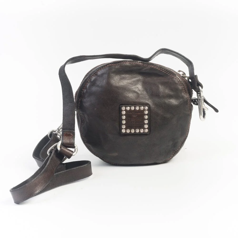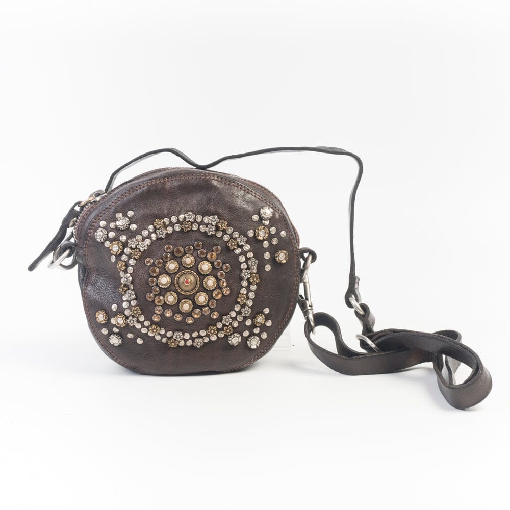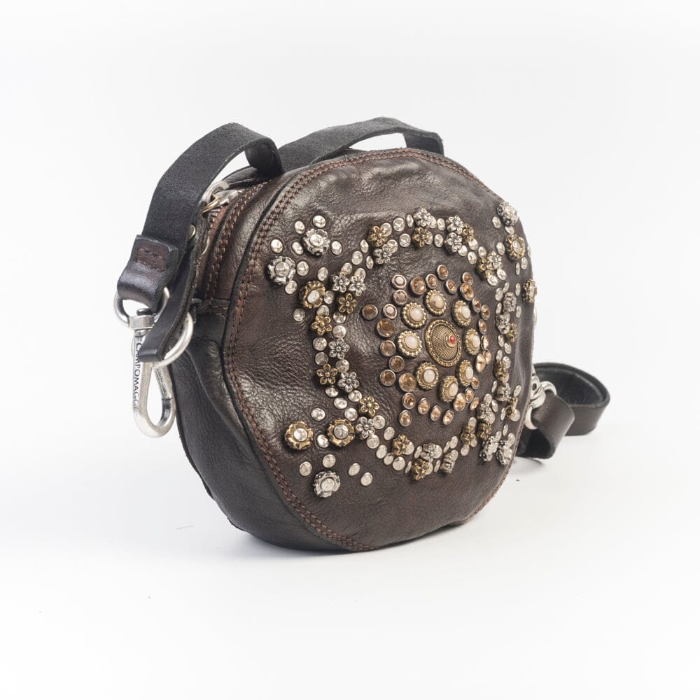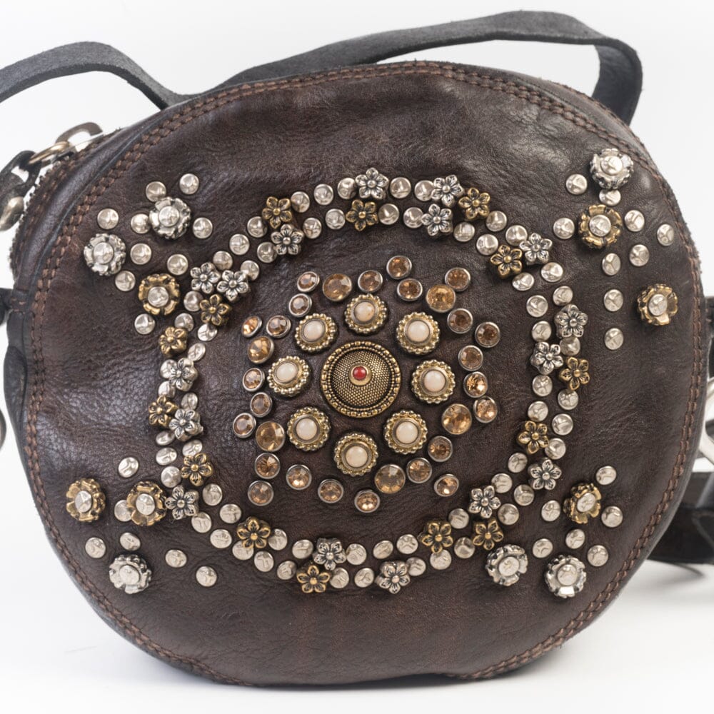 Borsa a tracolla, di Campomaggi, realizzata in pelle di vacchetta naturale tinta in capo di colore testa di moro. Decorazione con borchie di colore brunito e acciaio a forma di fiore, pietre di colore naturale, rosso e strass di colore ambra frontalmente. Chiusura con zip centrale, interno foderato in tessuto in nuance e taschina con zip. Tracolla in pelle regolabile. con moschettoni in acciaio brunito. Applicazione di iconica label del brand sul retro. In dotazione kit di pulizia/crema di nutrimento per il pellame e borsa in tessuto.