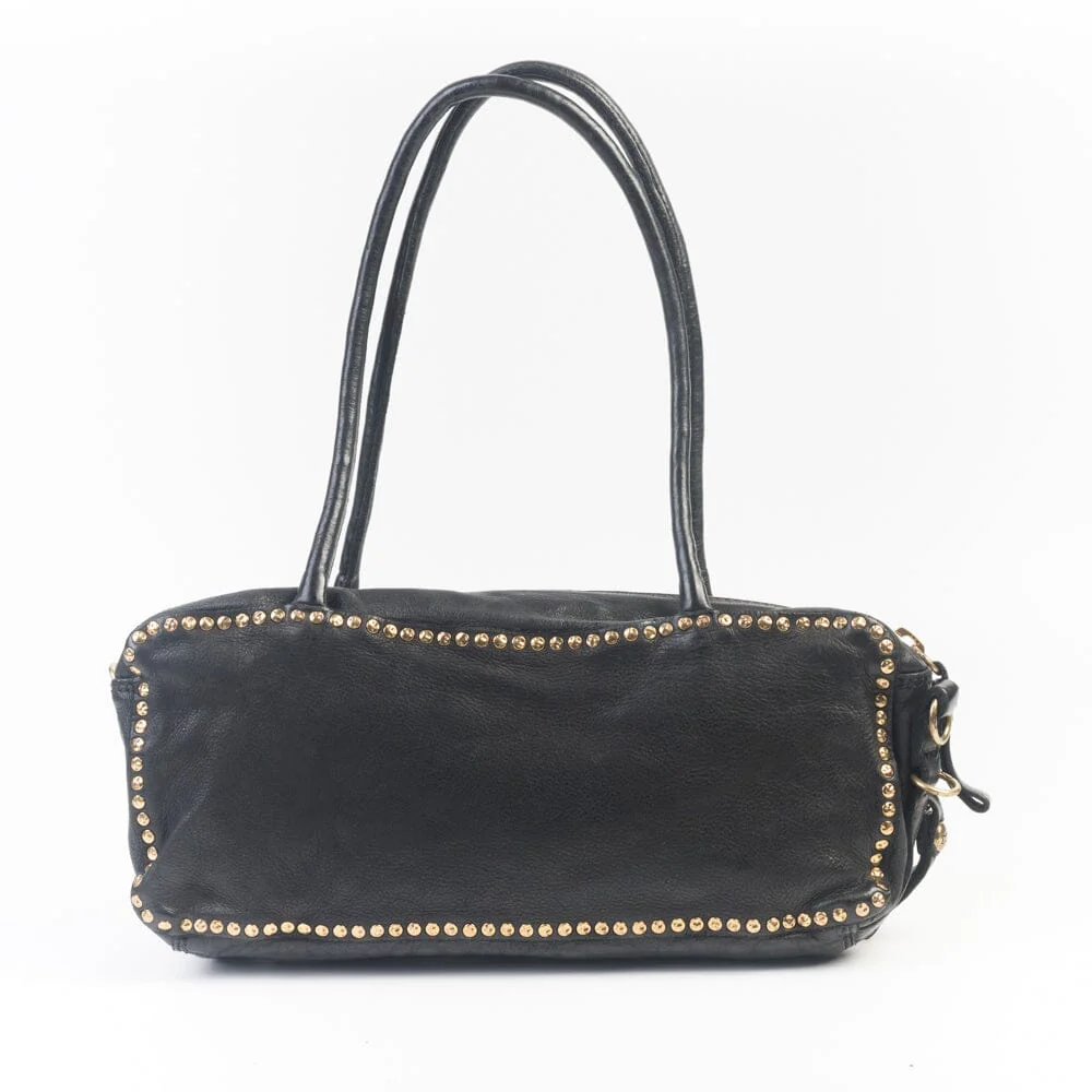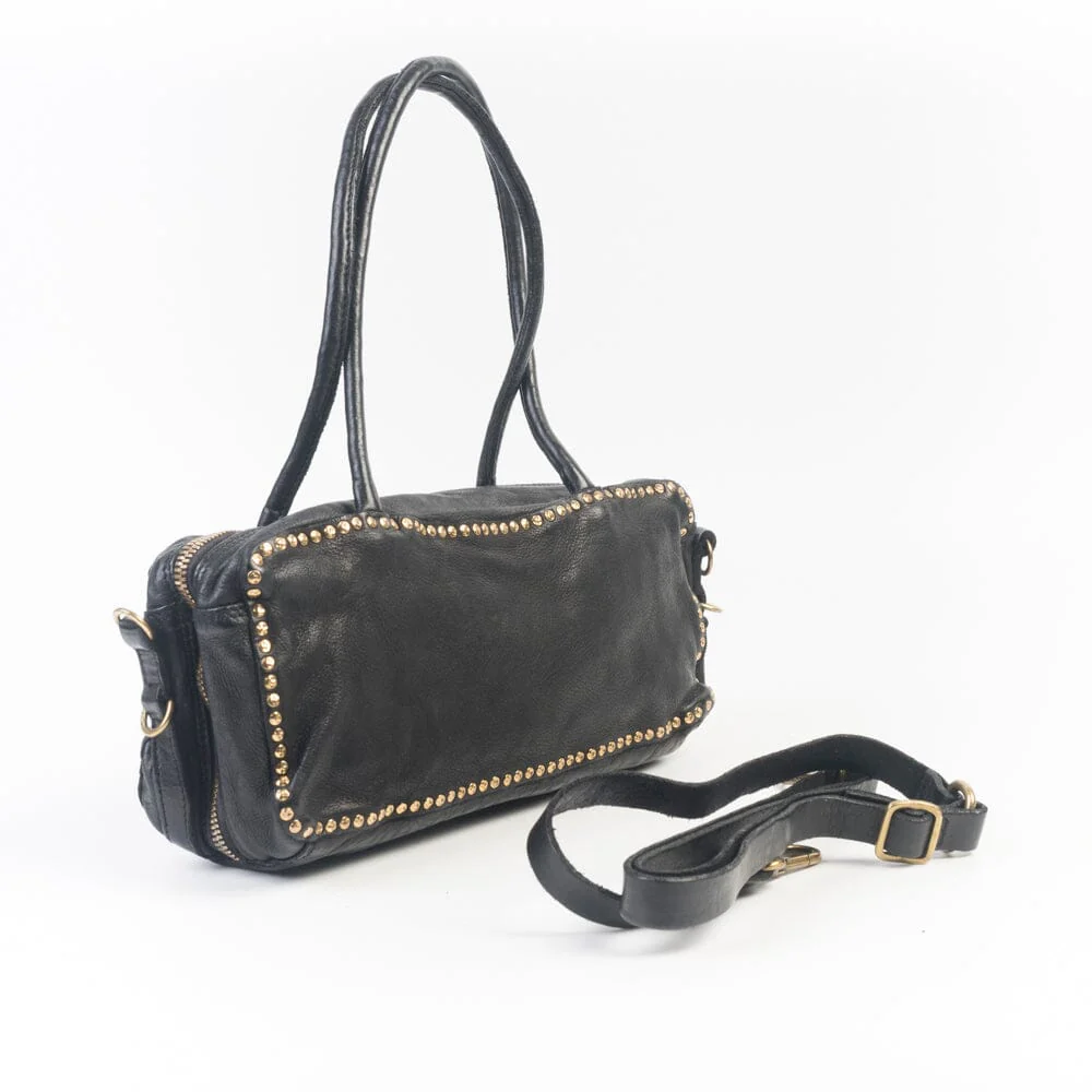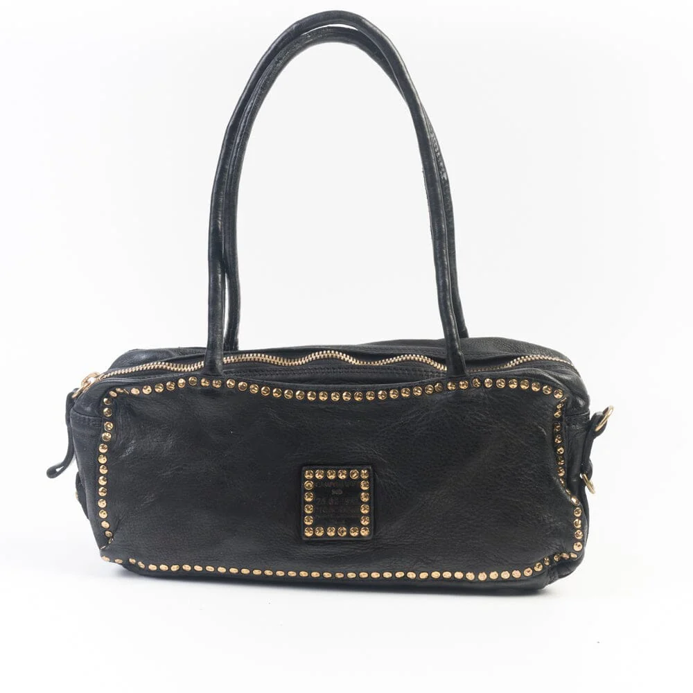 Borsa a mano e a tracolla, baguette Simona, di Campomaggi, realizzata in pelle di vacchetta naturale tinta in capo di colore nero. Rivetti in metallo dorato sul profilo della borsa. Doppio manico in pelle tubolare da portare a mano e tracolla regolabile in pelle con ganci laterali di colore oro brunito. Chiusura principale con zip. Interno foderato in tessuto, taschina interna con chiusura a zip. Applicazione di iconica label del brand sul retro. In dotazione kit di pulizia/crema di nutrimento per il pellame e borsa in tessuto.