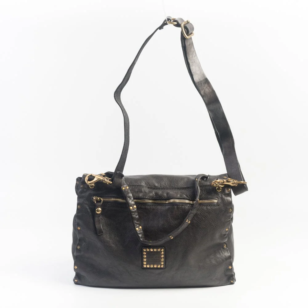 Borsa dalla forma cartella a mano e a tracolla Zelda di Campomaggi, realizzata in pelle di vacchetta naturale tinta in capo di colore grigio antracite. Decorazione di rivetti in metallo di colore oro brunito sul profilo della borsa. Unico manico in pelle da portare a mano e tracolla regolabile in pelle con ganci laterali di colore oro brunito da portare a tracolla. Sul fronte patta con zip interna. Interno foderato in tessuto, taschina interna con chiusura a zip e una taschina foderata in pelle porta telefono. Applicazione di iconica label del brand sul retro con ulteriore tasca profonda. In dotazione kit di pulizia/crema di nutrimento per il pellame e borsa in tessuto.