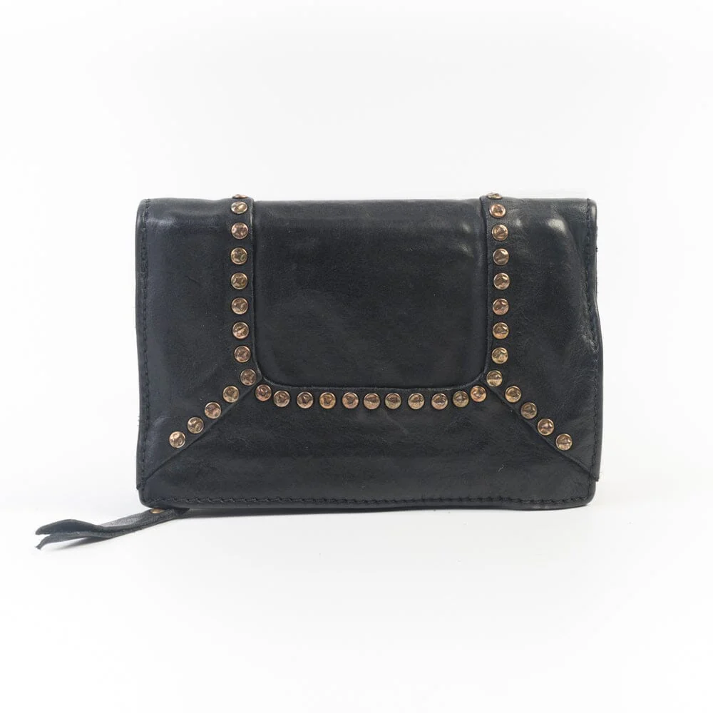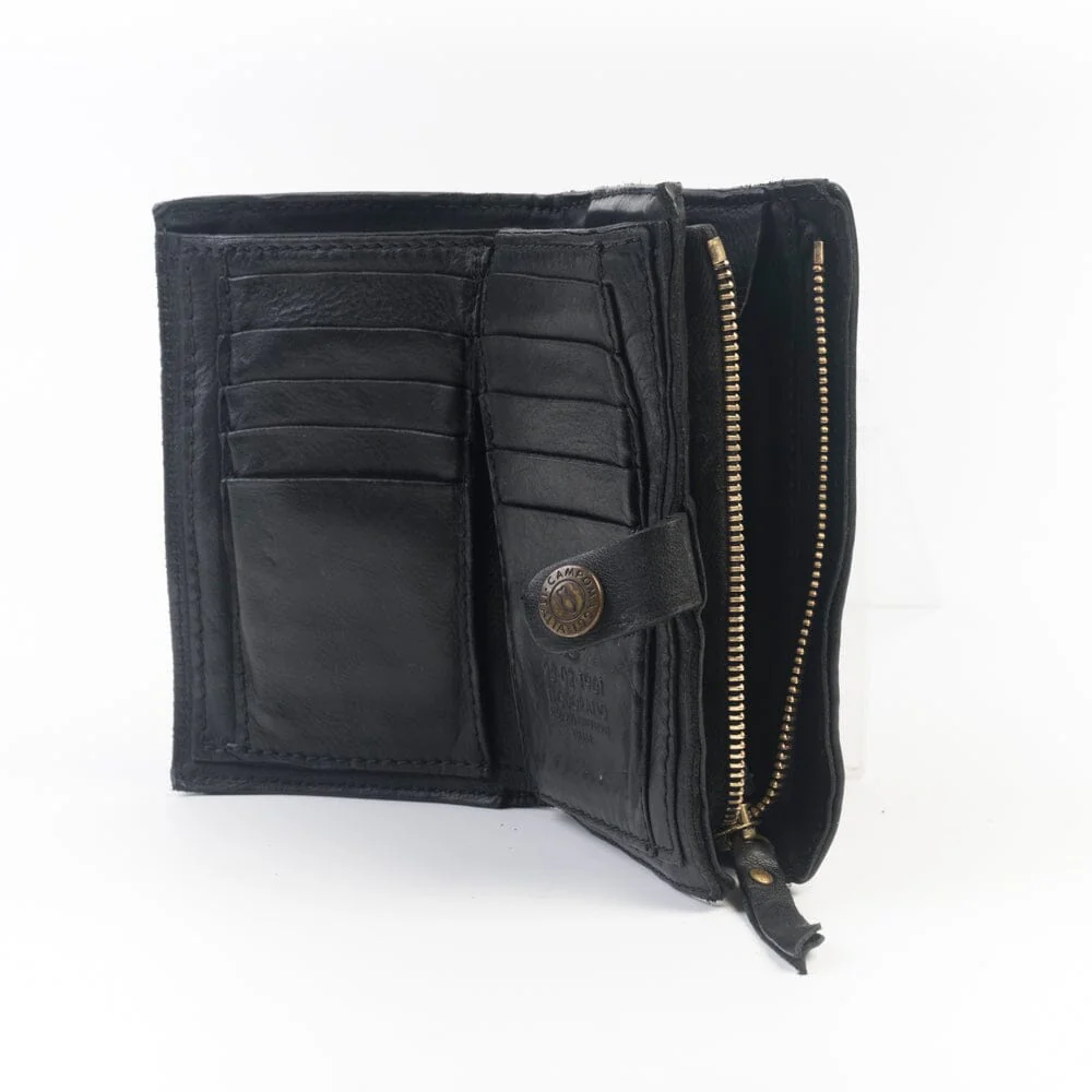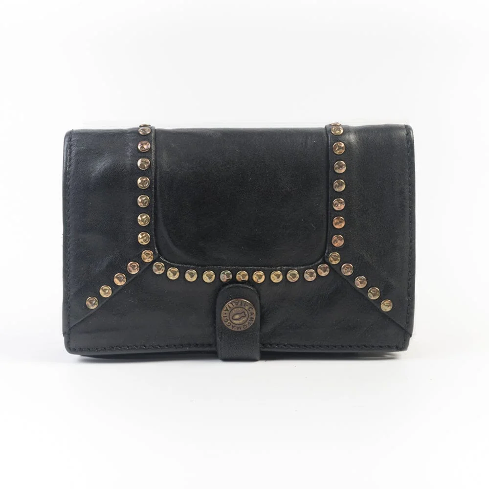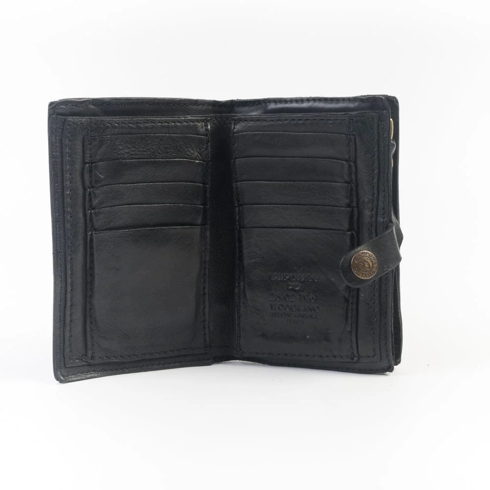 Portafoglio Campomaggi da donna realizzato in pelle di vacchetta tinta in capo nel colore nero, con rivetti di colore oro sul profilo frontale e nel retro. Interno con slot per carte, documenti e contanti. Zip esterna con scomparto per contenere le monete.