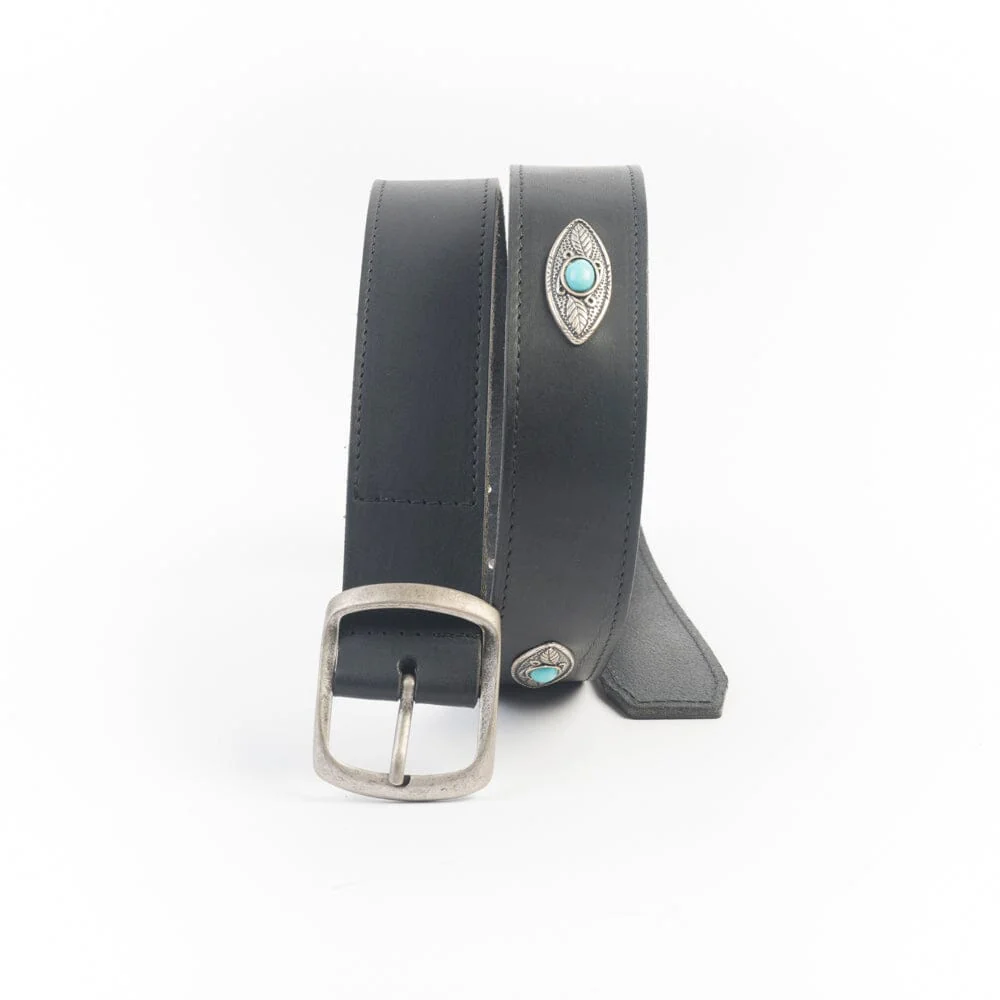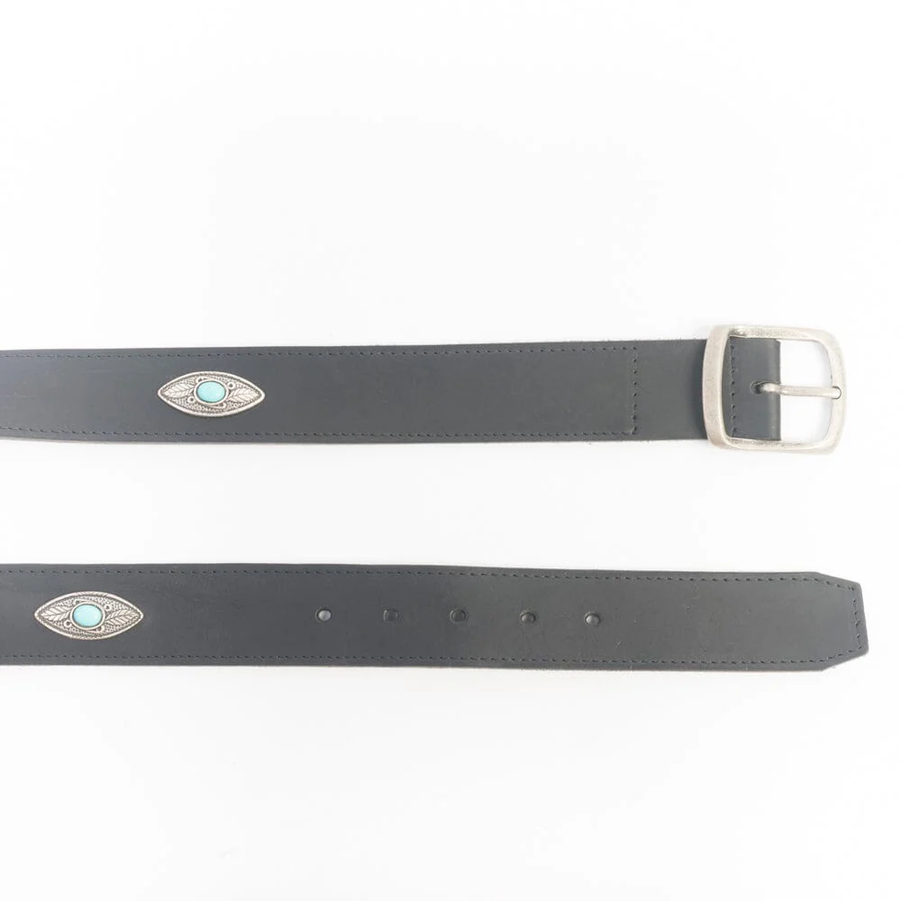 Cintura unisex di Cappellettoshop realizzata in pelle liscia di colore nero, con fibbia in metallo argento brunito. Decorazioni in metallo argento con applicazioni di perline di colore azzurro chiaro. Altezza 3.5 cm.