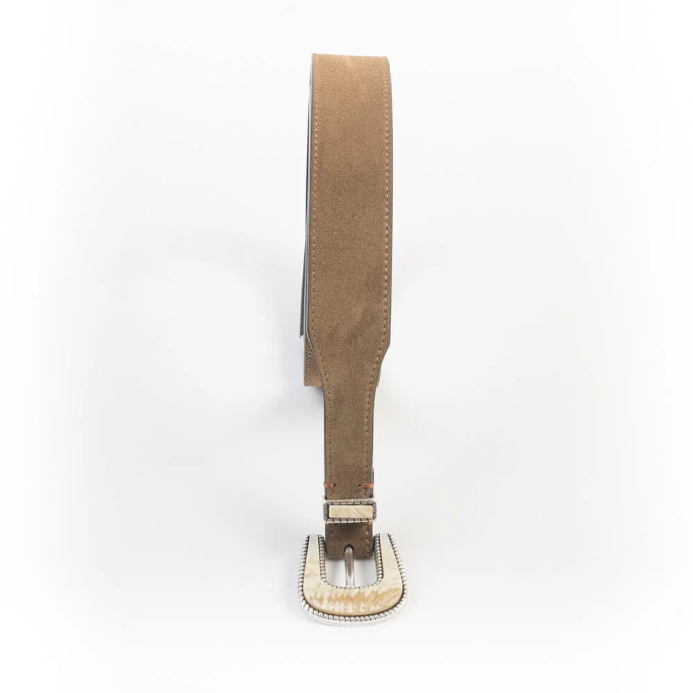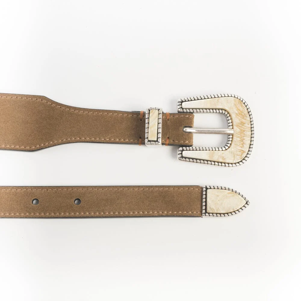 Cintura realizzata per Cappellettoshop in camoscio colore miele, con fibbia dal gusto texano, materiale corno con pietra di colore avorio.
