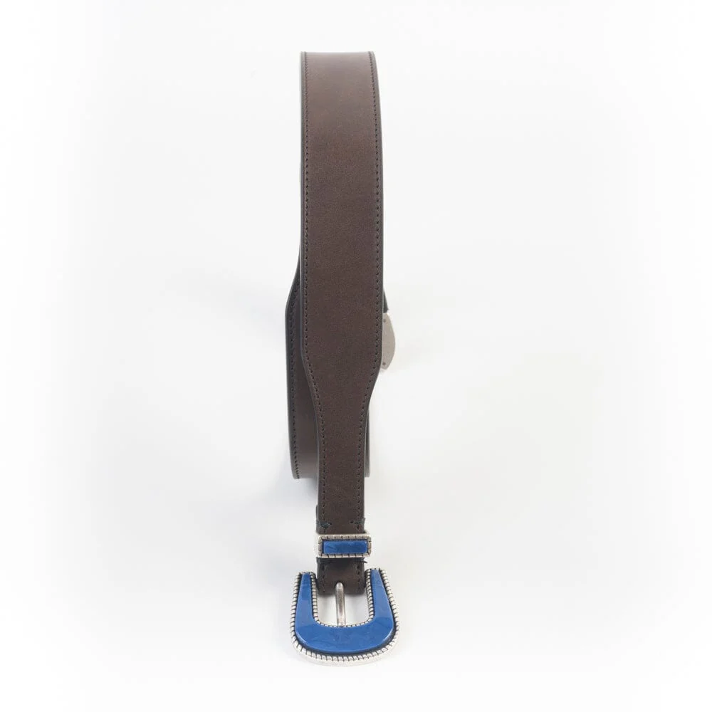 Cintura realizzata per Cappellettoshop in pelle liscia vacchetta di colore testa di moro, con fibbia in corno dal gusto texano di colore turchese.