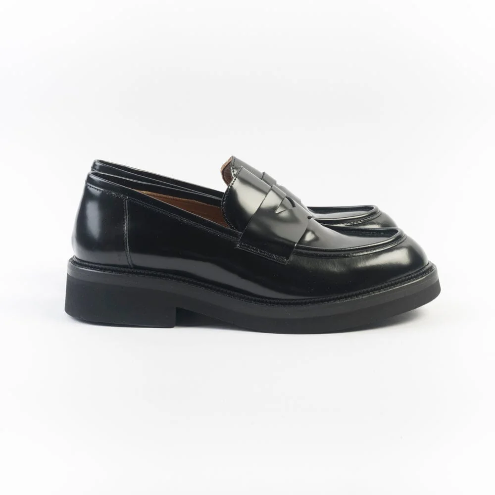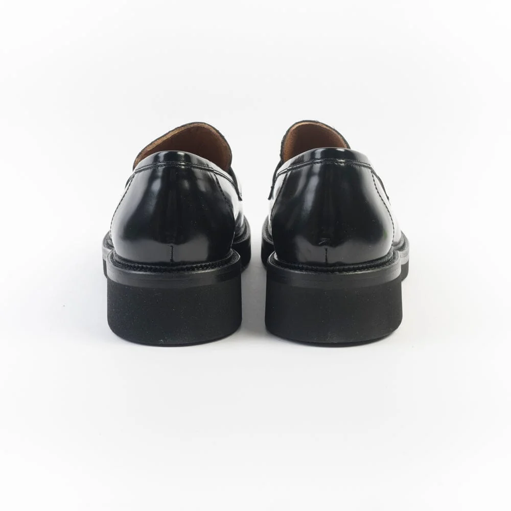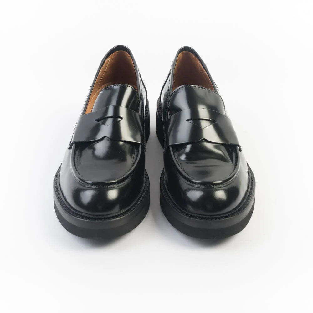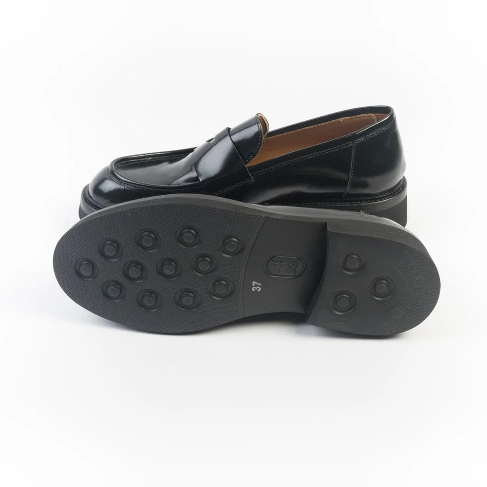 Mocassino di Cappellettoshop realizzato in morbida pelle verniciata di colore nero. Mascherina sulla tomaia centrale in nuance. Interno e soletta foderato in pelle. Suola in gomma tipo dainite con tacco altezza cm 3,5 circa